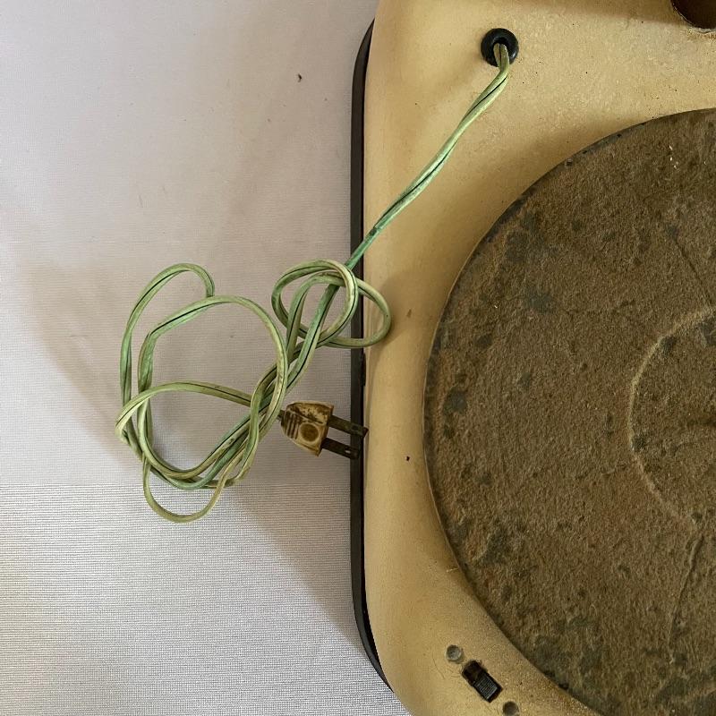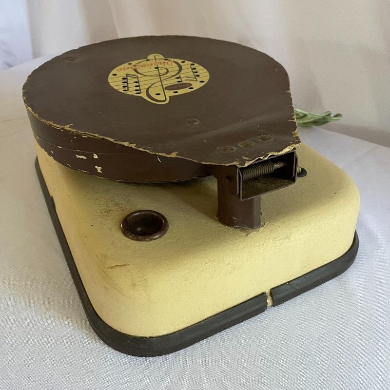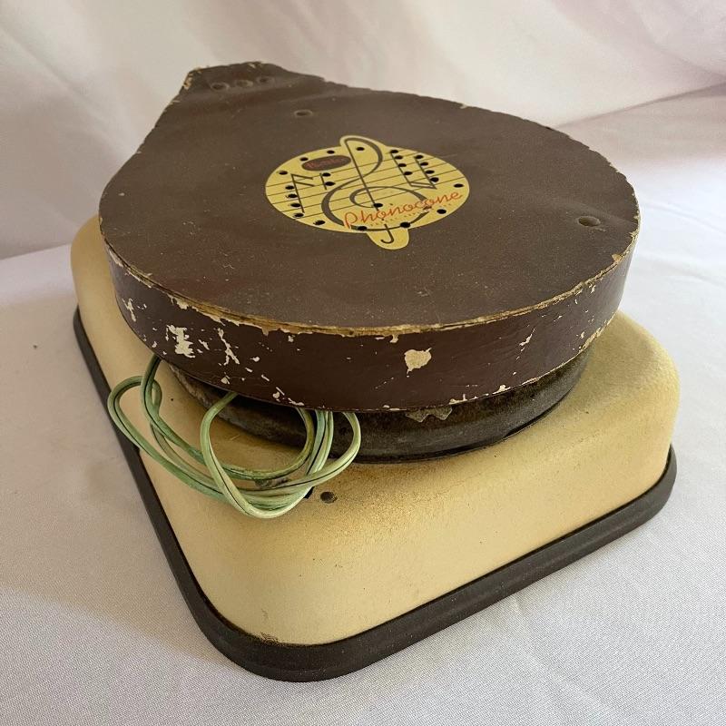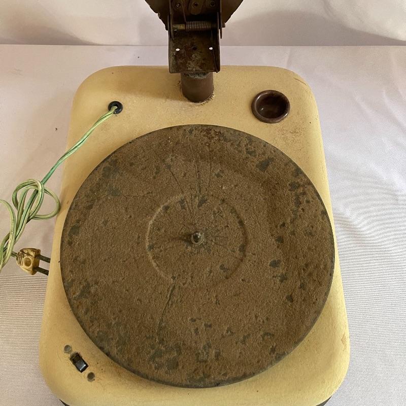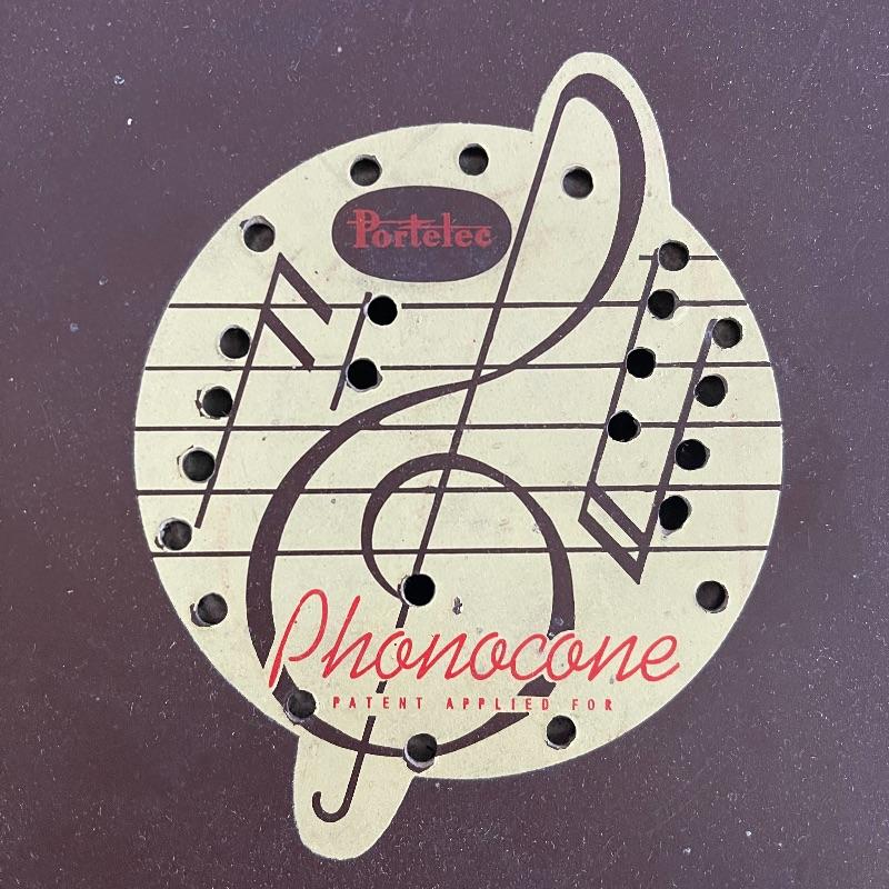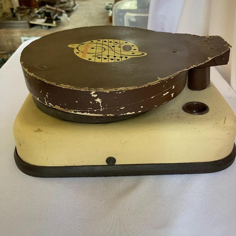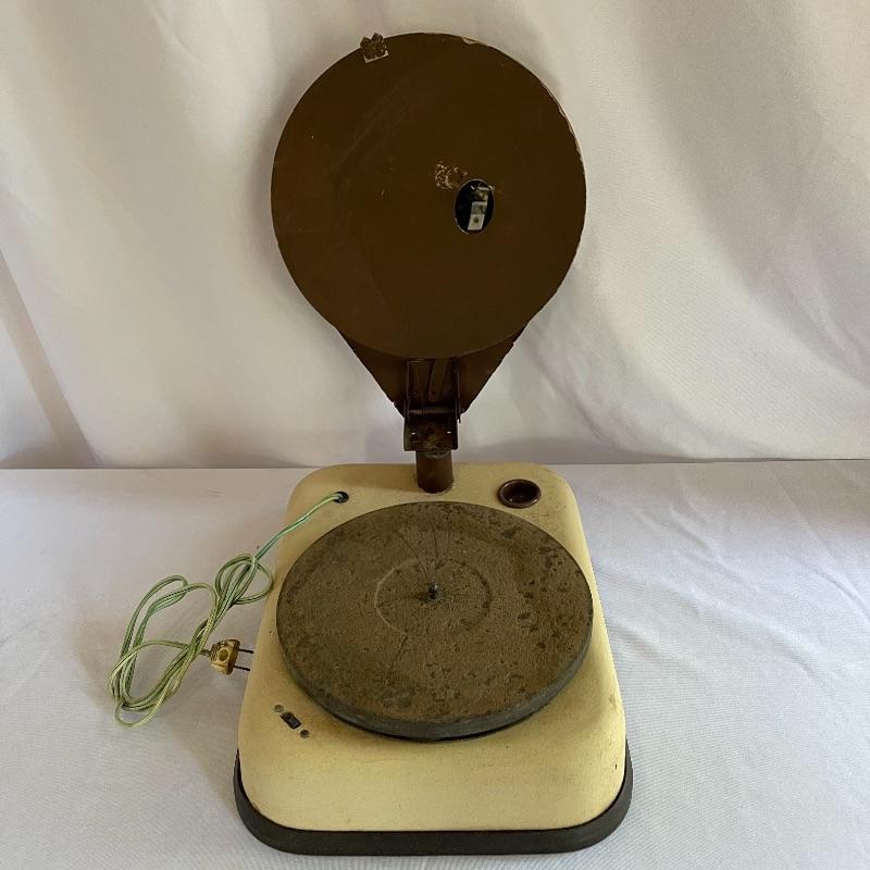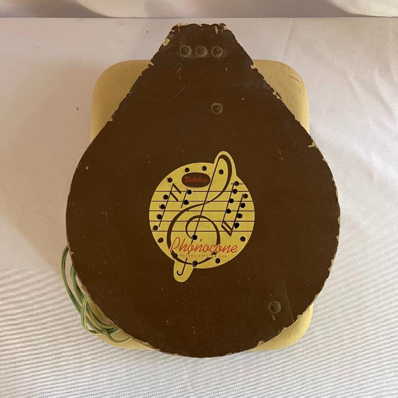 Portetec Phonocone turntable. The model number of this vintage turntable is 64 BR - 1901 B. When plugged in, it powered on and made a humming noise. The lid swivels 360 degrees.