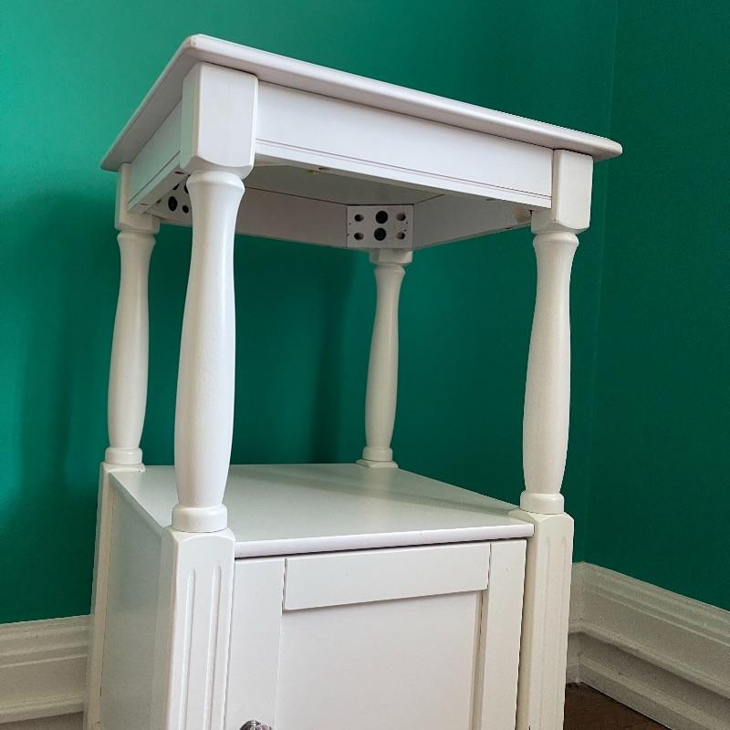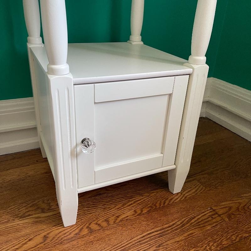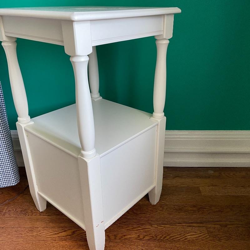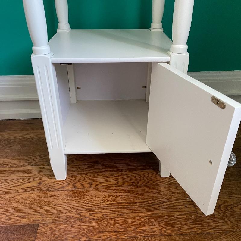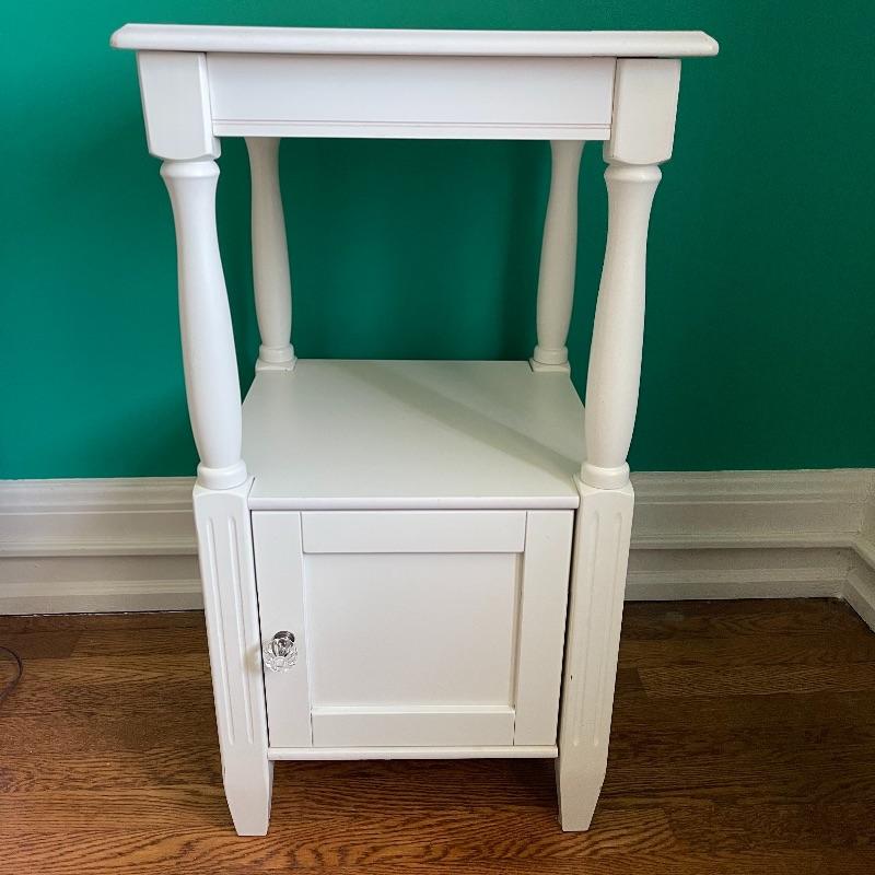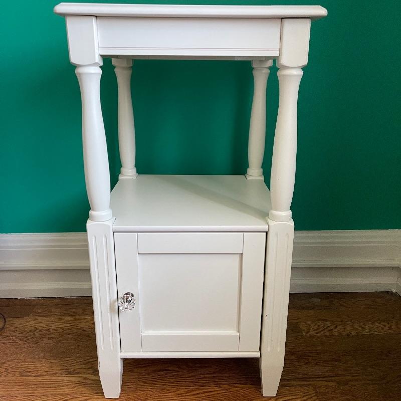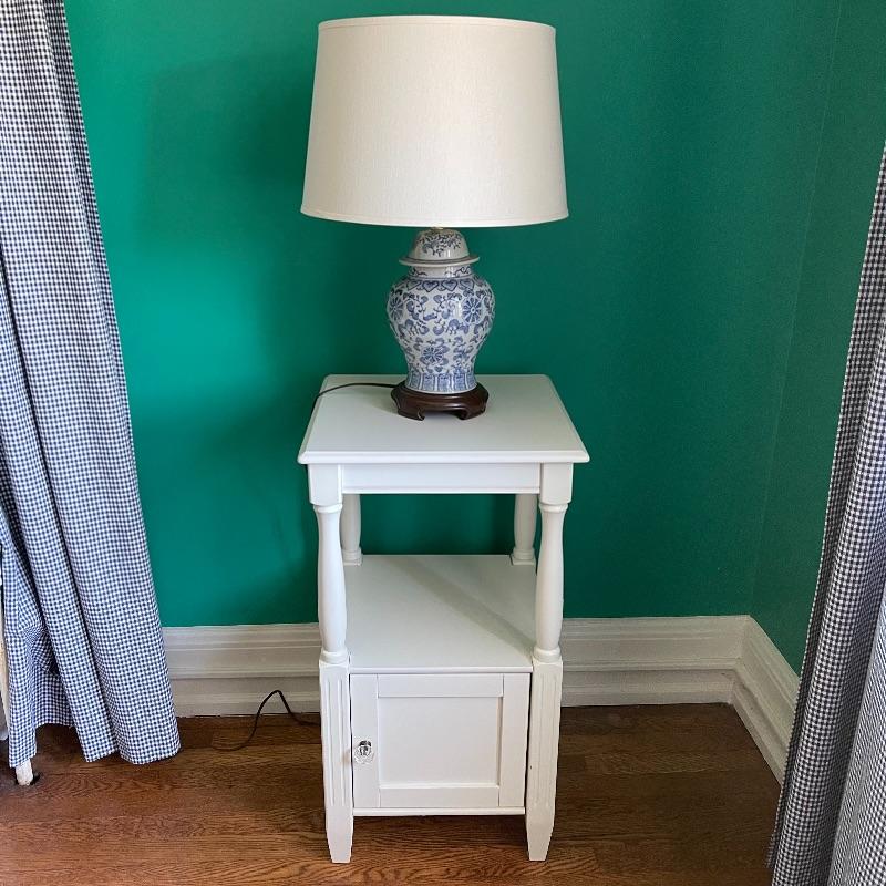 Blue lamp and side table. The side table has a middle shelf and a small cupboard on the bottom. It is 16 x 16 x 29.5 inches. The lamp has a cute white and blue ceramic base, as pictured, it works when plugged in.