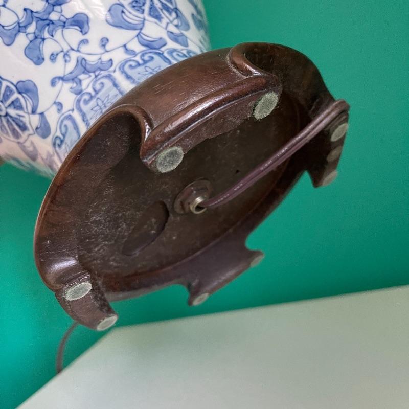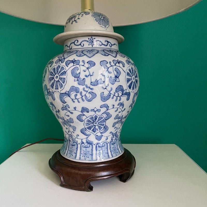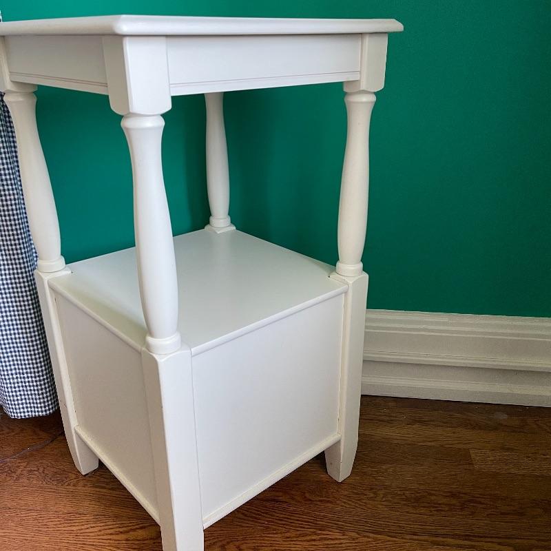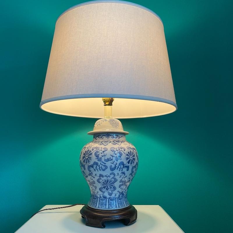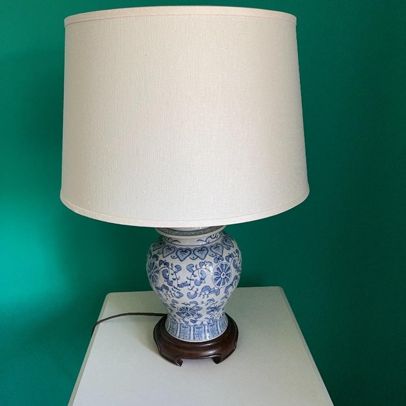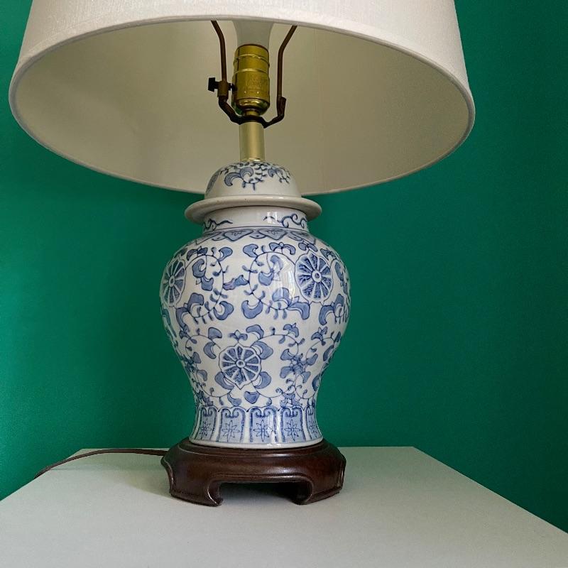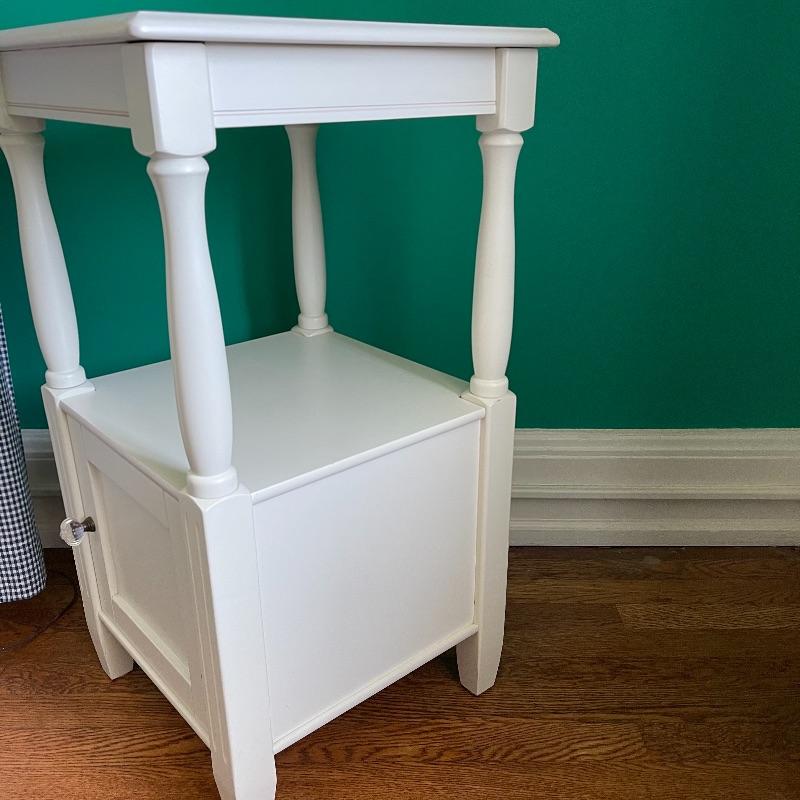 Blue lamp and side table. The side table has a middle shelf and a small cupboard on the bottom. It is 16 x 16 x 29.5 inches. The lamp has a cute white and blue ceramic base, as pictured, it works when plugged in.