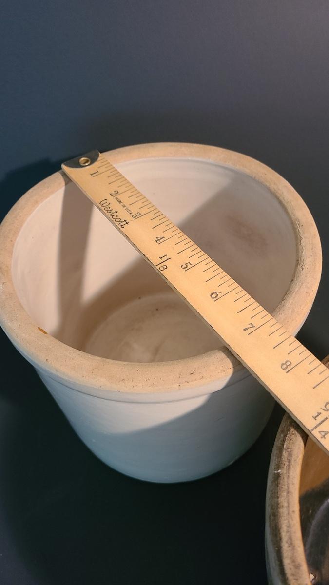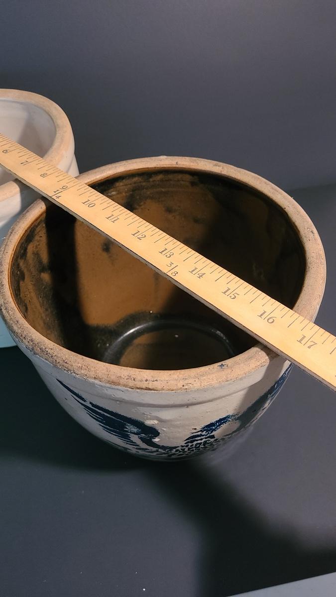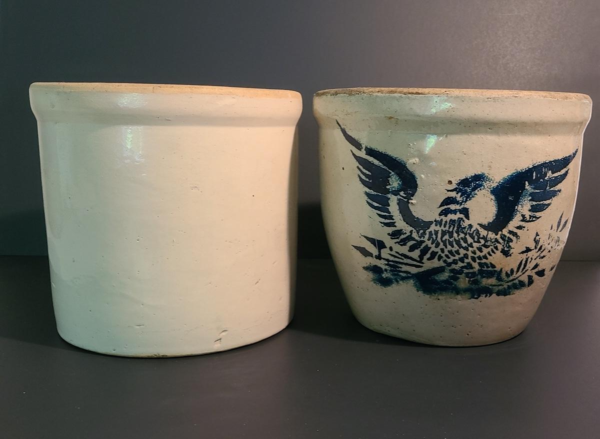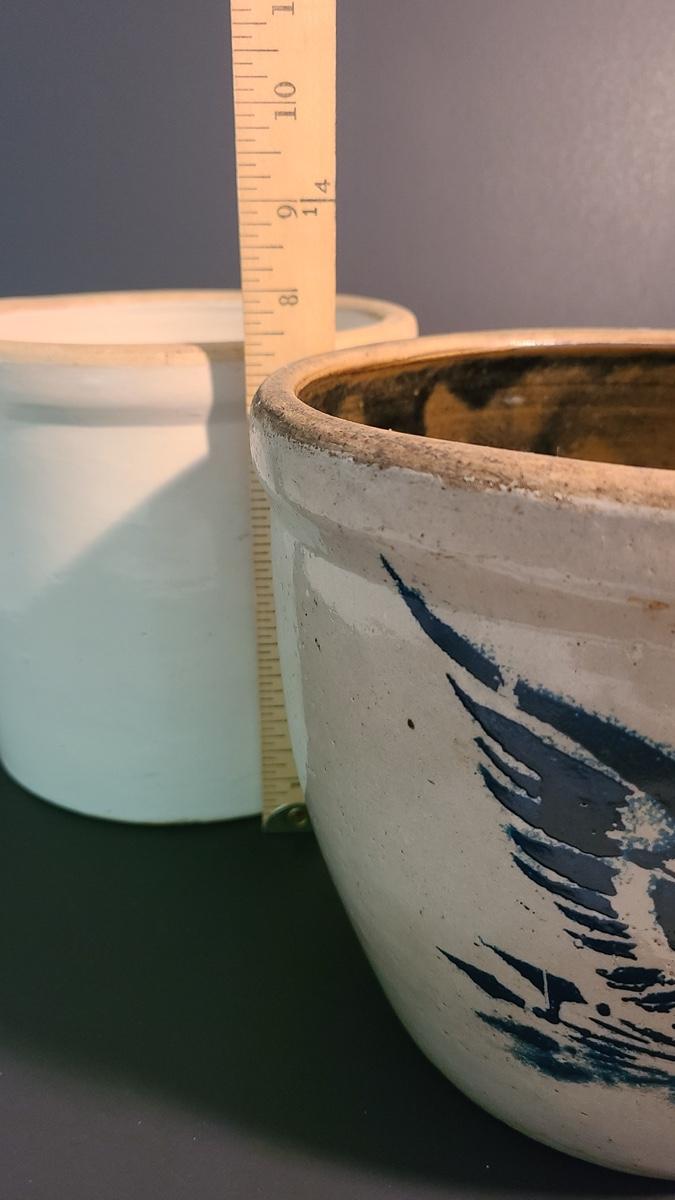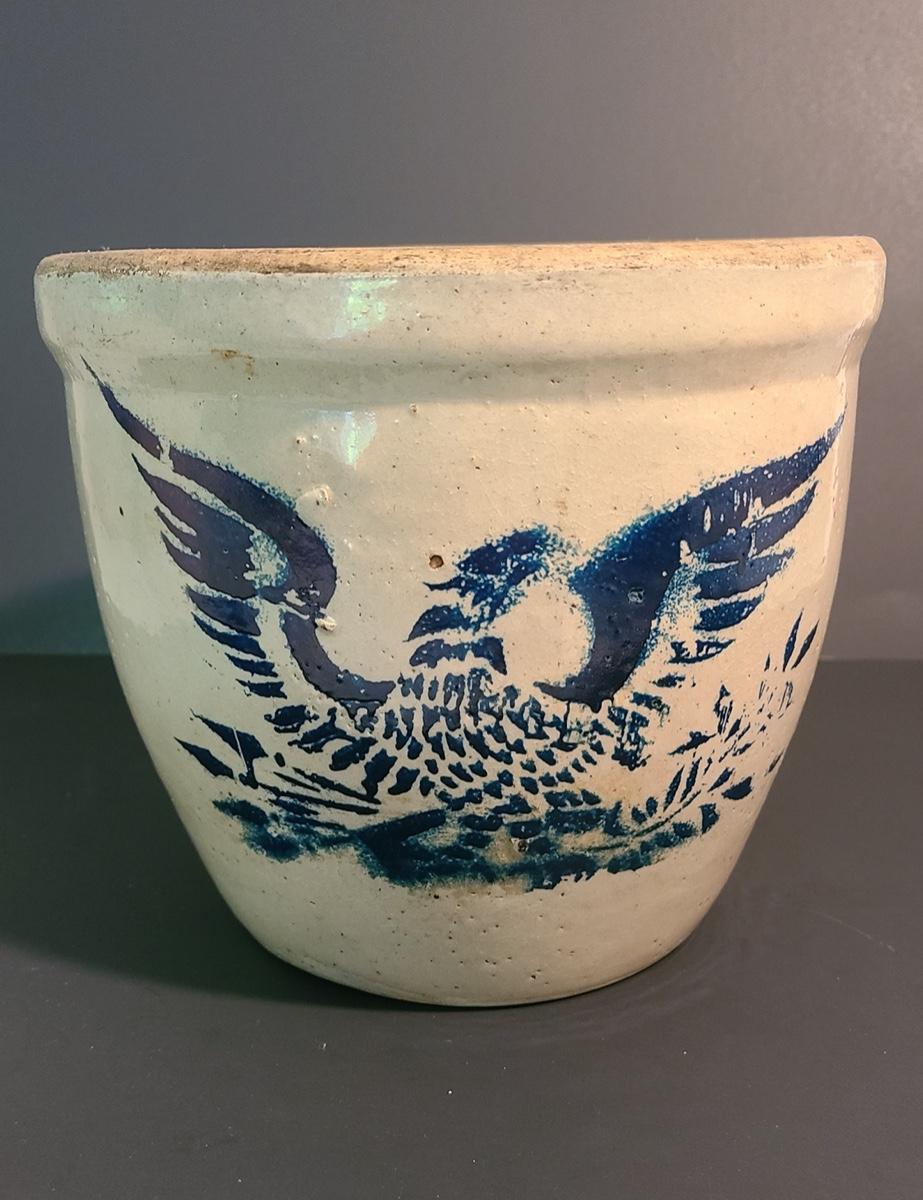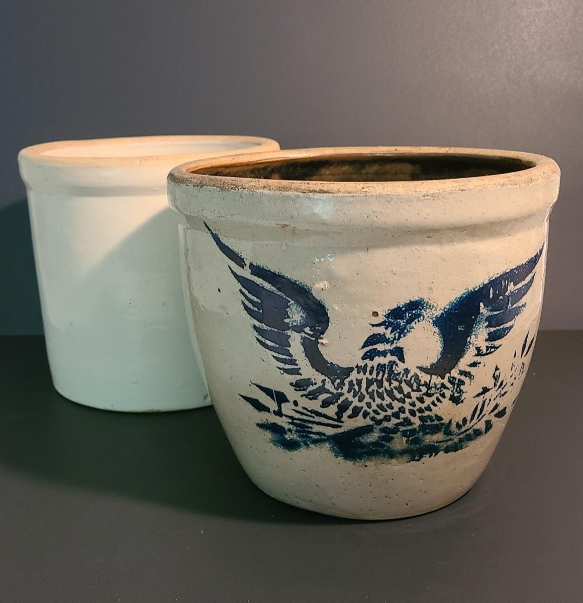 This lot is for two stoneware crocks. One is unmarked and is wonderful condition with no noted chips or cracks, the other has a cobalt eagle on the front with no other markings. Unique glaze colors on the interior, has a small hairline down to handle. Pictures are the best representation of the item in the lot, the condition of the items in the lot, and the size if measurements were taken. All items are sold as-is, since they are pre-owned and antiques. We are not experts and do our best to describe and pictures have been taken from every angle. Thank you for looking and have fun bidding.