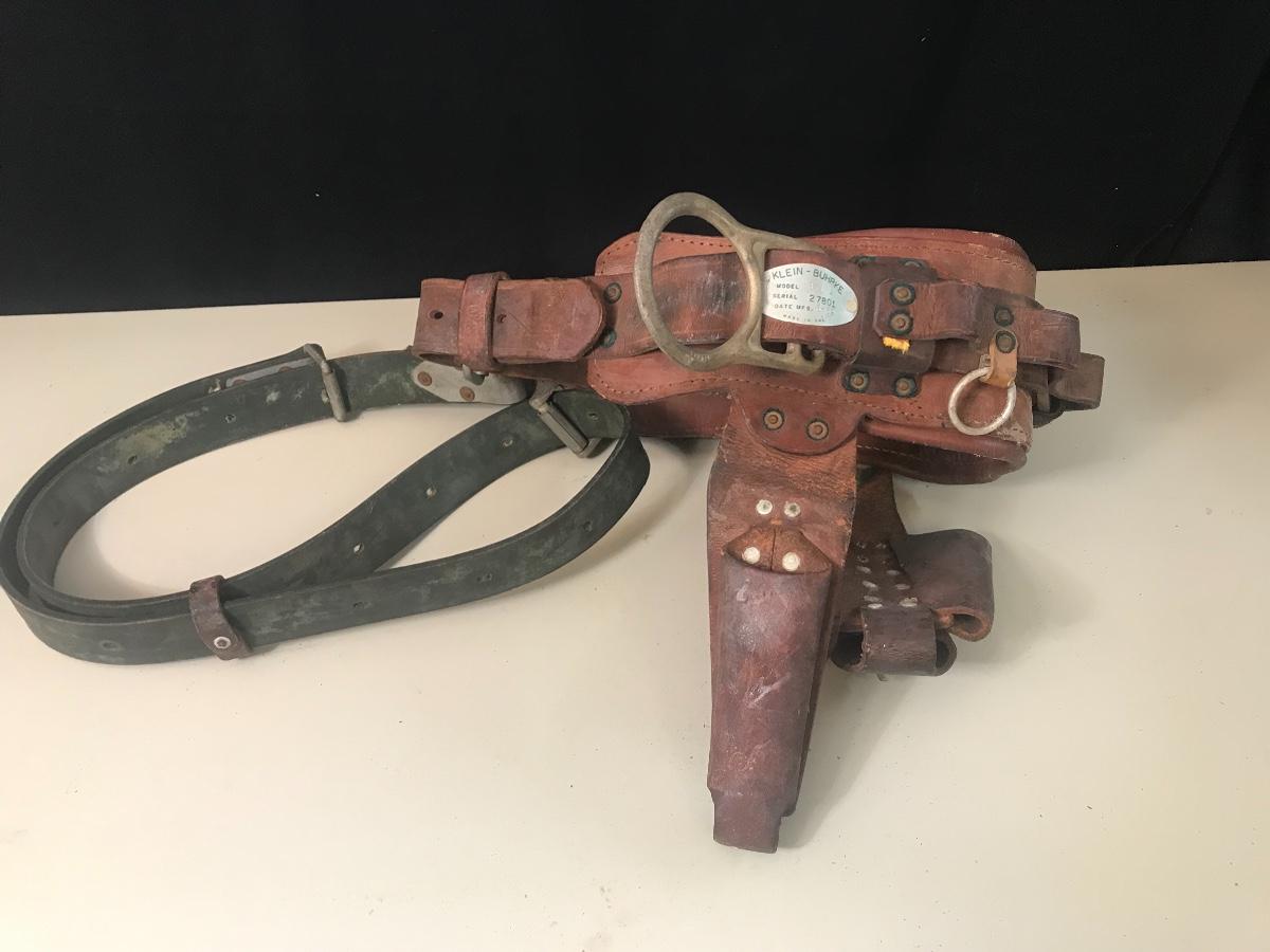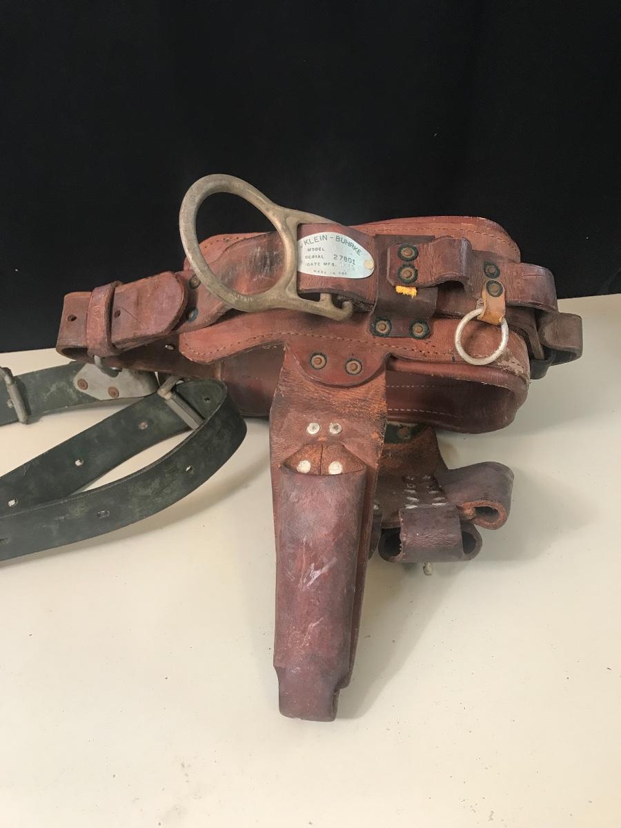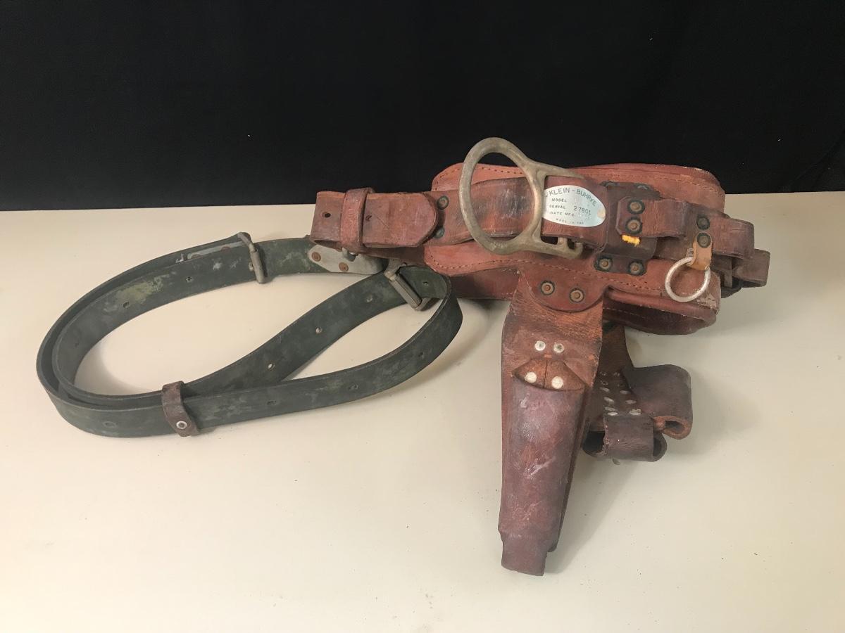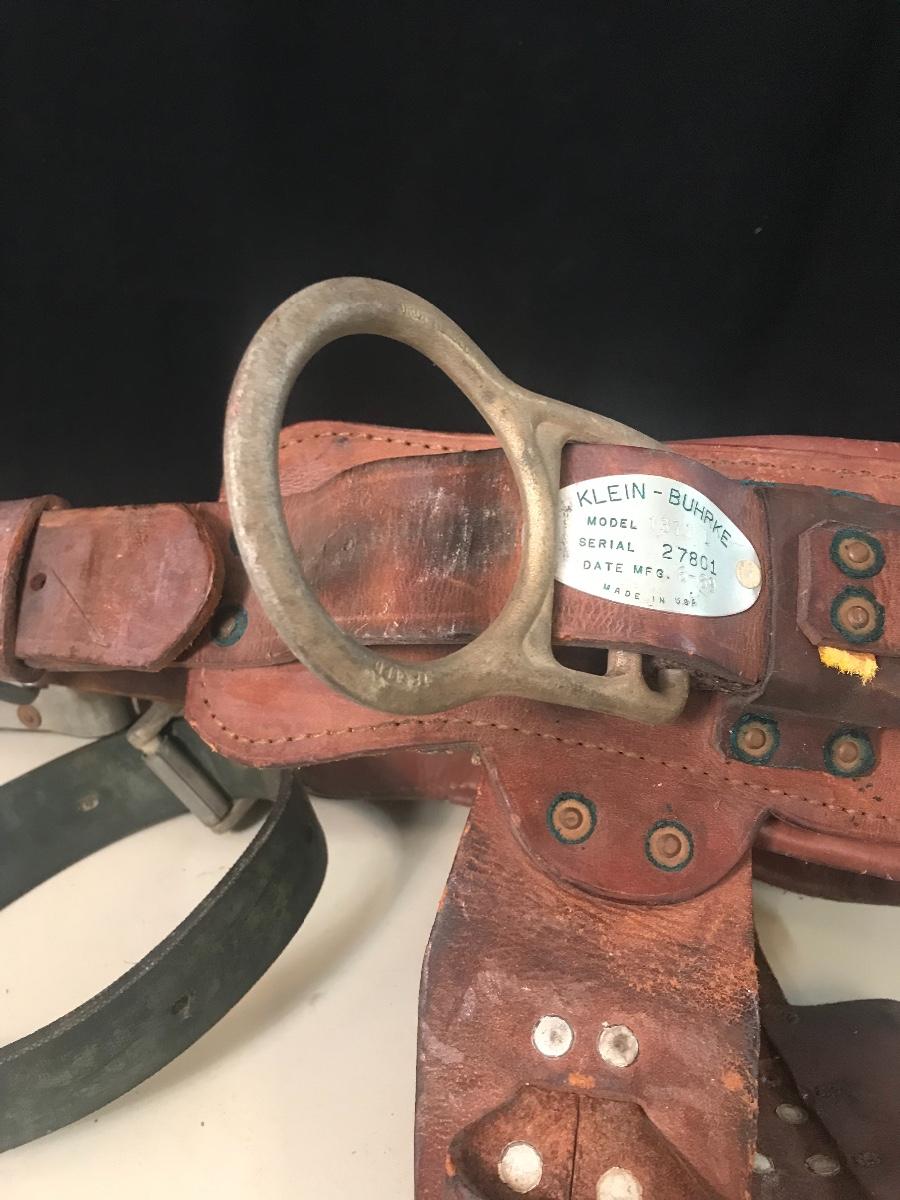 Vintage Leather Pole Climbing Gear/ Tool Belt - made by Klein - Buhrke in 1969. Please see all pictures as they are the best representation of the items. The pictures show condition, measurements if taken, and what is included in the lot. Due to the large amount that we photograph and the time frame, we are not always able to take measurements. All items unless noted, are pre-owned and have been used. If you purchased furniture, you must bring help. We do not allow one person to carry large furniture out on their own. Bring help, tools and a truck for the safety of our client’s homes, and your personal safety. Company policy. Thank you.