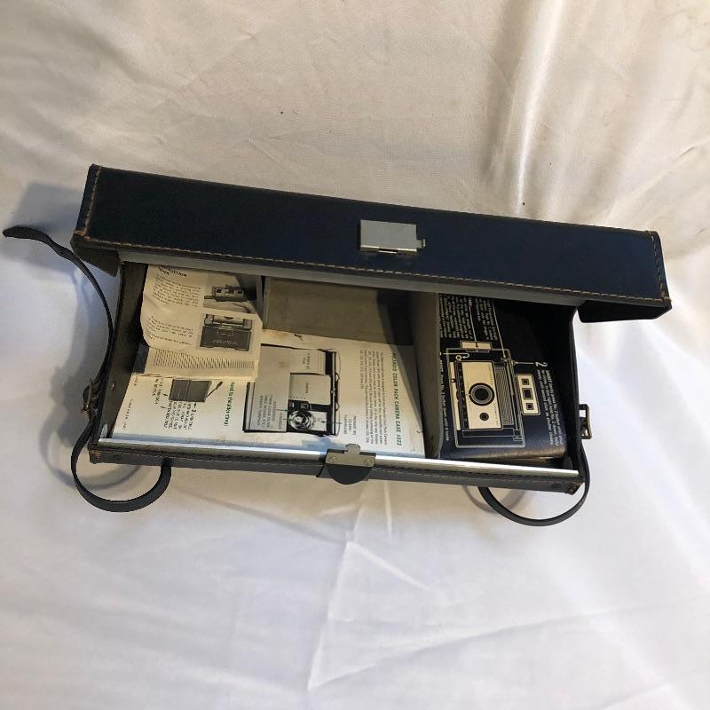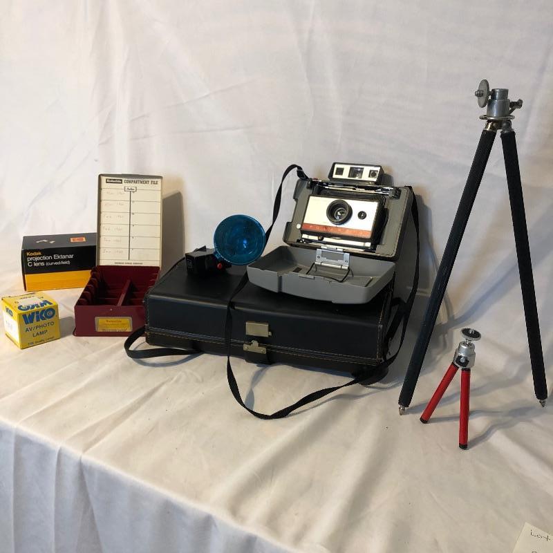 This lot has a mixture of Poloroid and Kodak items. The two tripods are screw-topped and measure 15” and 5”. The Kodak slide file has shifting compartments and measures 4.5” x 7”. Also included is an AV/photo lamp and a Kodak projection Ektanar C-lens. The beautiful and nicely maintained camera is a Polaroid 200 Land Camera in a nice case. It also includes the original manual and a flash. The case measures 14” x 9”. Shipping Available.