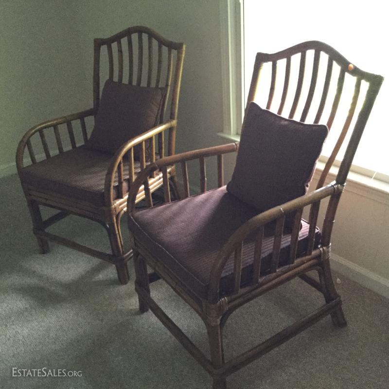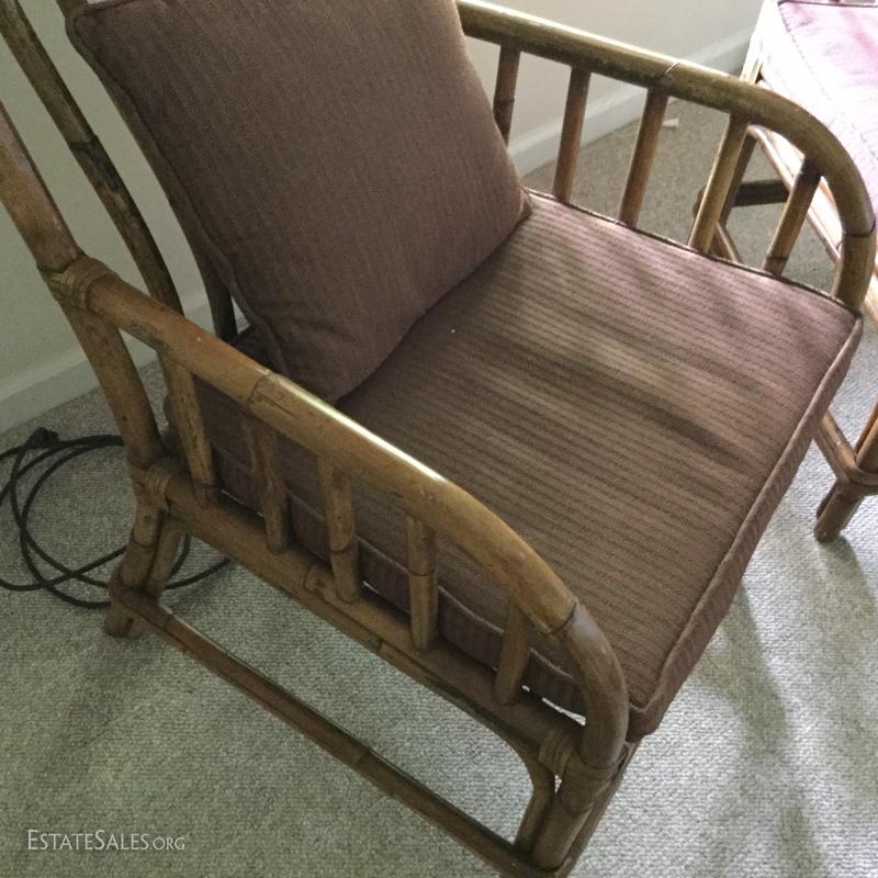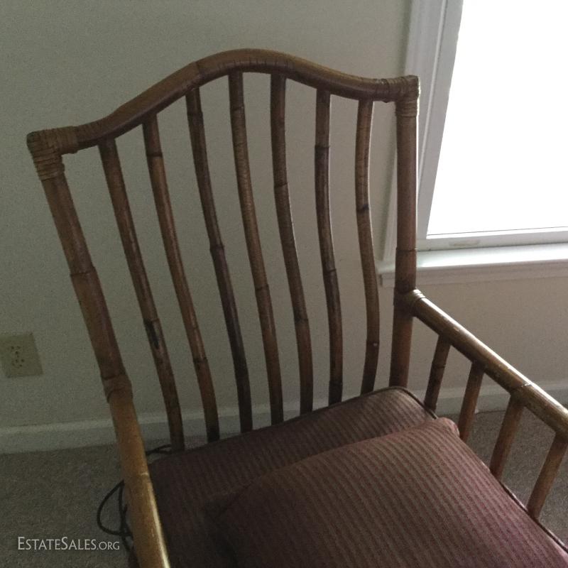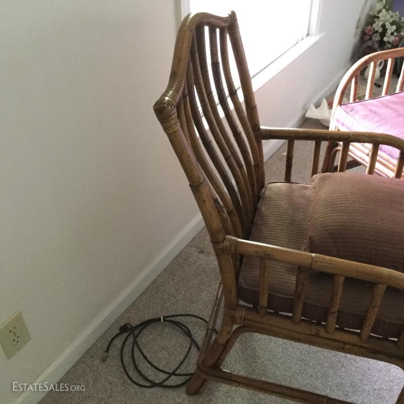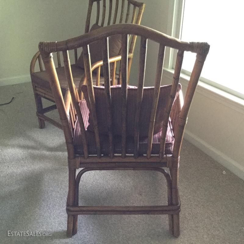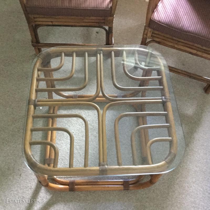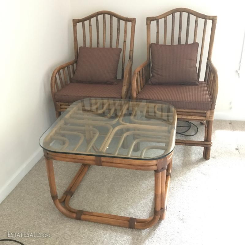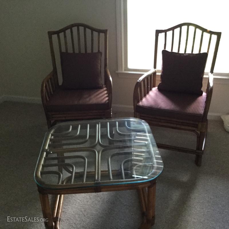 Bamboo table and chair set. Glass top table. Red cushion and throw pillow on chairs in great condition. Some normal wear and tear on bamboo. Table is 28"l x 28"w x 19"h. Chairs 23"l x 22"w x 37"h.