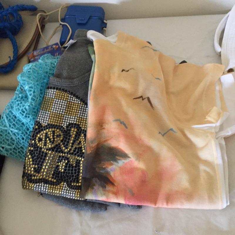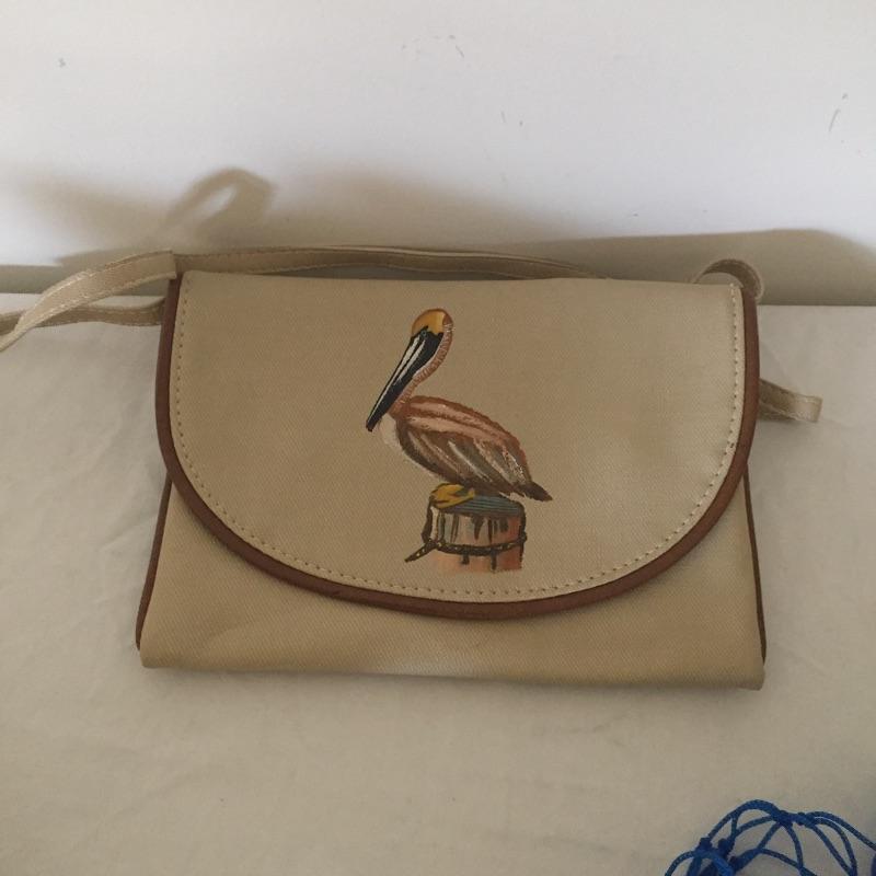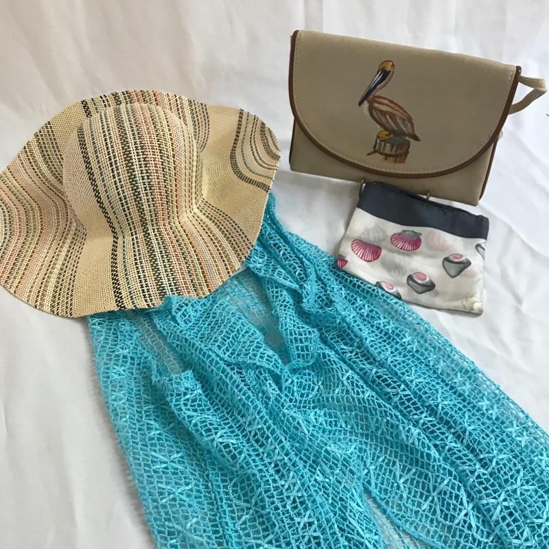 Lovely selection of beach items. Go to the beach with a new hat, cover ups , pelican adorned purse , waterproof storage container, shell scarf, games and more.