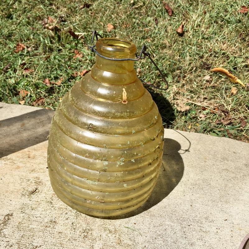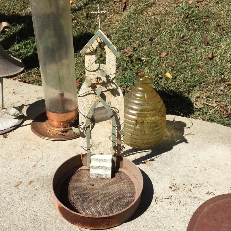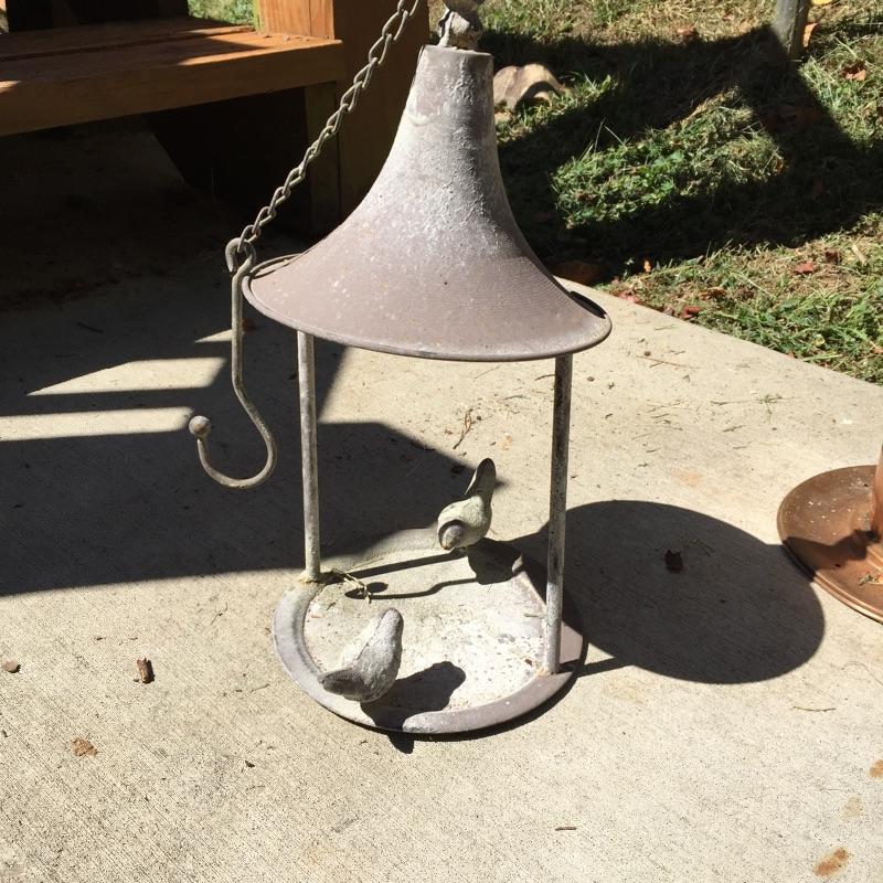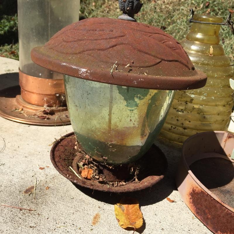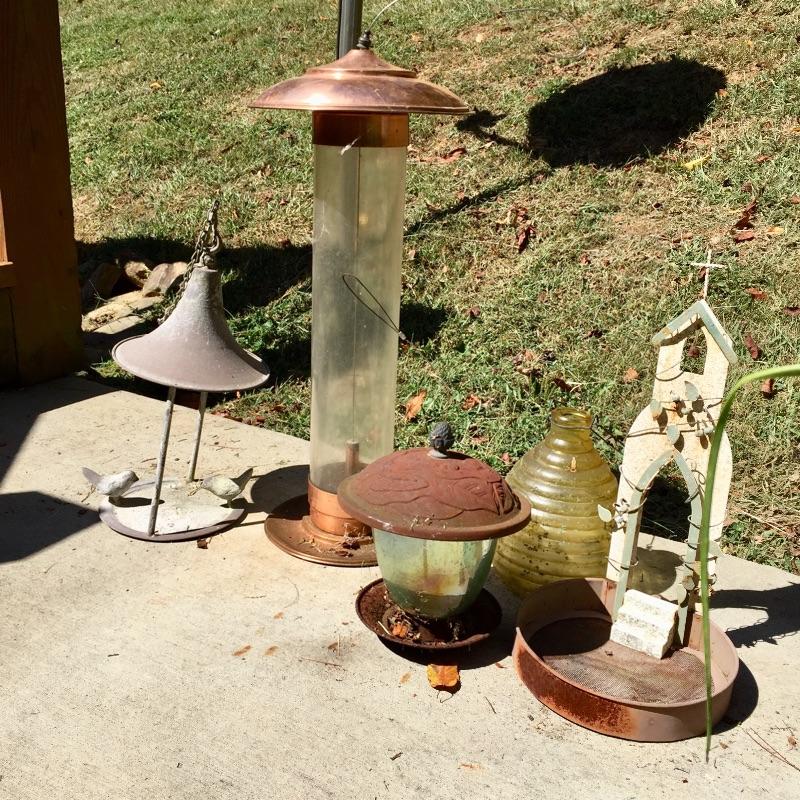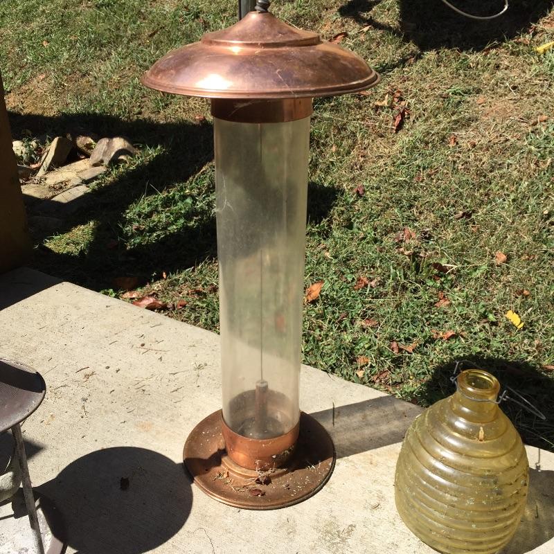 An assortment of five bird feeders ranging in size, the largest being the copper topped feeder measuring approximately 20”. Each feeder is unique from the glass honey jar to a very cool looking blown glass and metal feeder that looks like an acorn. Copper topped one is likely squirrel proof.