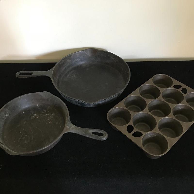 Lot includes three cast iron pieces with no markings. No shipping available. Local pickup only in Hendersonville, abc.