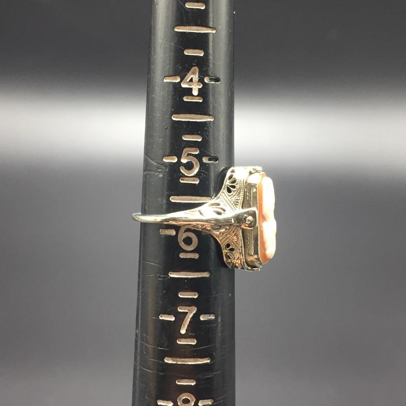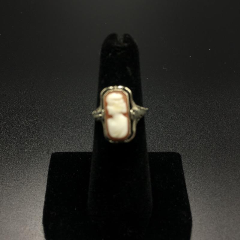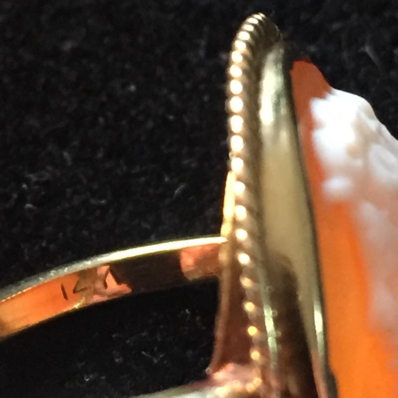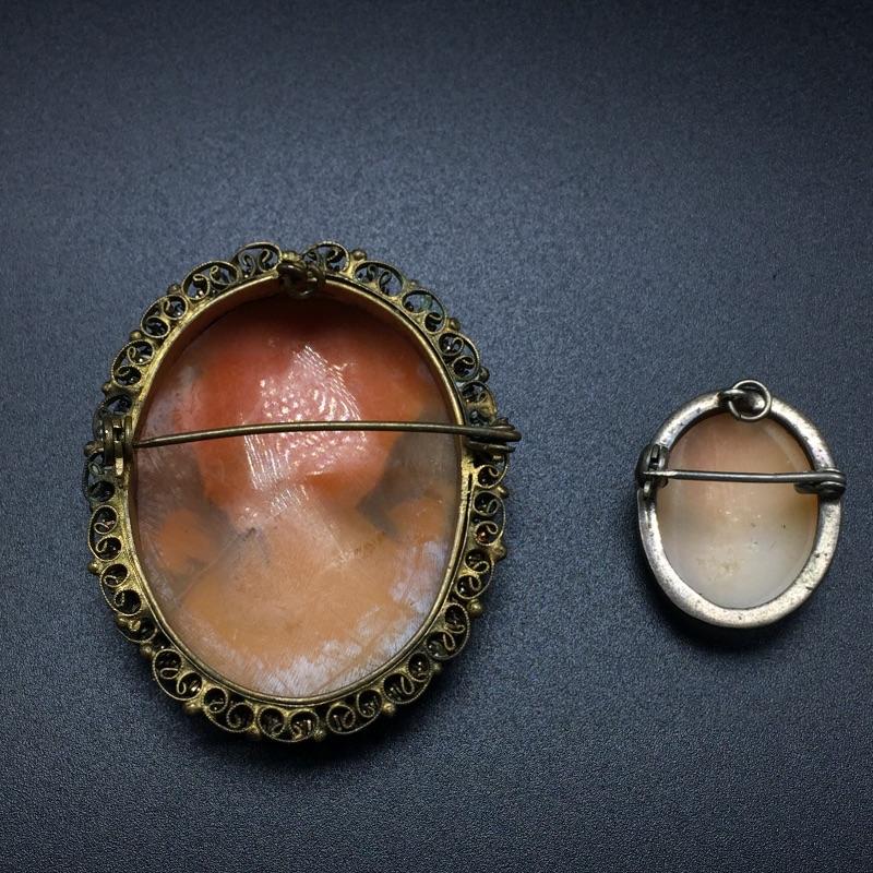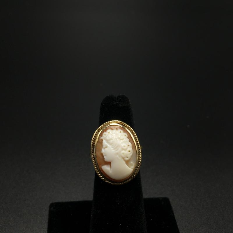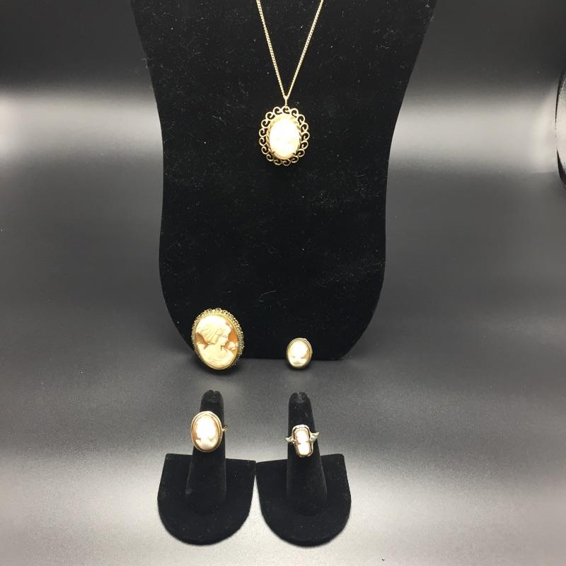 Lovely array of Cameos including two rings with one marked 14K and one that flips to another stone, two pins that can also be pendants and one pendant with chain. For ring sizes - see pictures.