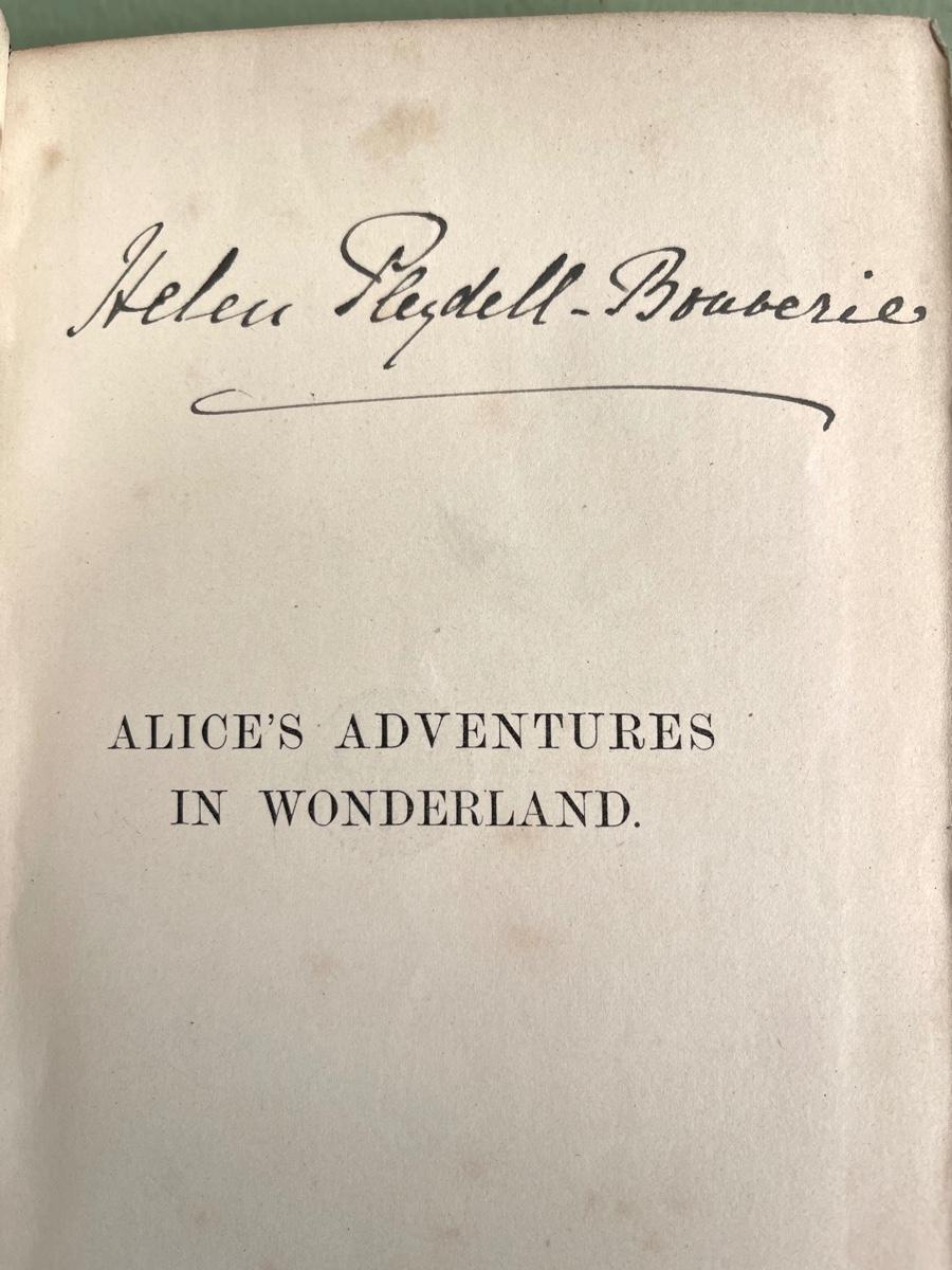 LOT 96 - Early Alice's Adventures in Wonderland by Lewis Carroll. This edition is an early one published in 1874 MacMillan and Co of London. This edition includes forty-two illustrations by John Tenniel. This is the forty-fifth thousand edition of these books. This book has Helen Pleydell-Bouverie's signature on the first inside page. "Helen Pleydell-Bouverie, the Countess of Radnor, who conducted an amateur ladies' orchestra from 1881 until 1896, was a critical early pioneer in the development of female orchestral performance in England. Lady Radnor's orchestra was widely praised, and she herself was highly regarded by British royalty, artistic elite, and lower-class audiences alike." This book was part of the David-Pleydell-Bouverie library at Bouverie Ranch in Glen Ellen. This item can be viewed at our Green + Cate Showroom in Sebastopol from July 15th - July 18th between the hours of 9am-5pm. For the benefit of the Bouverie Preserve of Audubon Canyon Ranch.