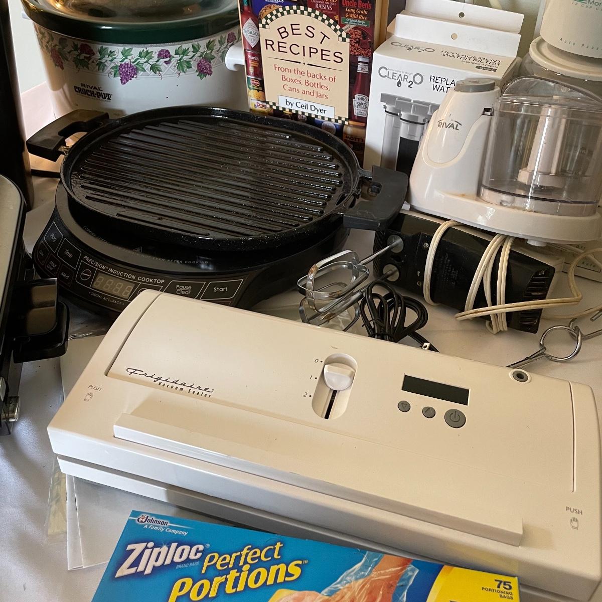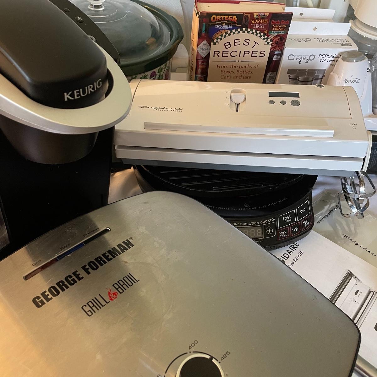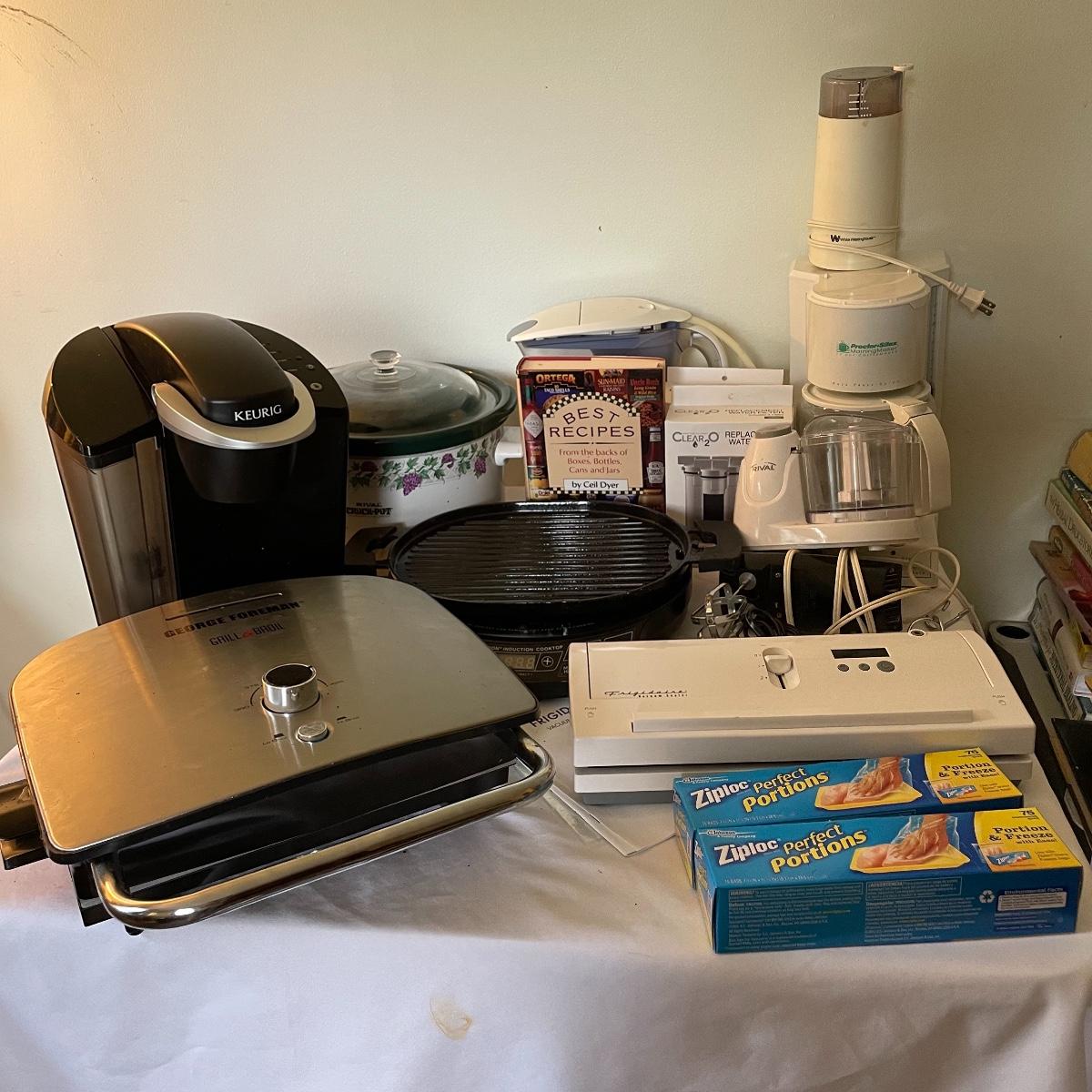 All of these items are a “must-have” in any kitchen! Lot features a Keurig single cup brewer and a Frigidaire vacuum sealer. Freshen up your water with a Clear20 pitcher with five unused filters. Lot also includes a George Foreman Grill & Broil with waffle grates, regular fat-dripping grates and a shallow basin. We’ve added a NuWave precision induction cooktop and enamel griddle. Lastly, some portion bags, Frigidaire sealer bags, Rival Crock Pot and food processor and a handheld mixer. Most items need a little cleaning and all powered on when prompted. See images for al items and model numbers. Local pick up only.