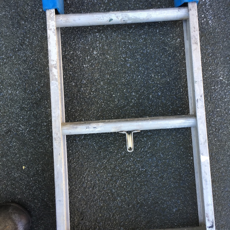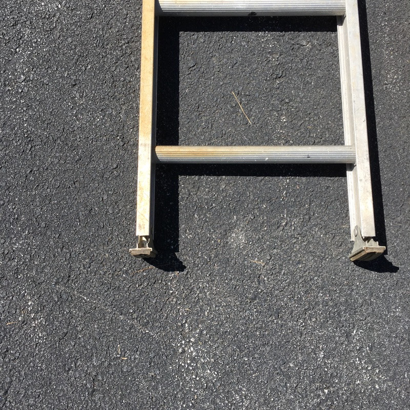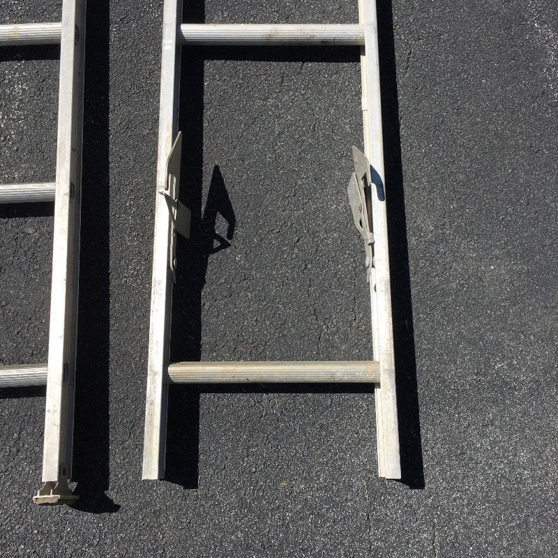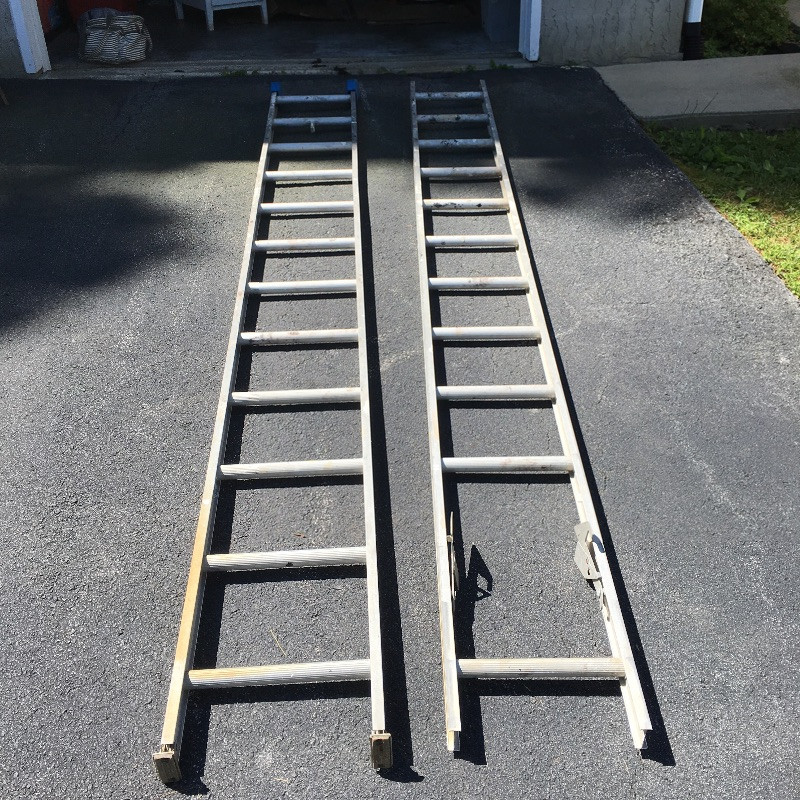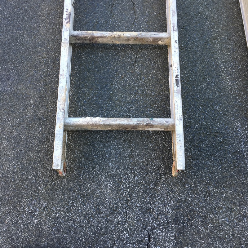 The sky is the limit with this aluminum extension ladder that is in two pieces and will need to be fixed to be a working extension ladder again. Each piece measures 146”.