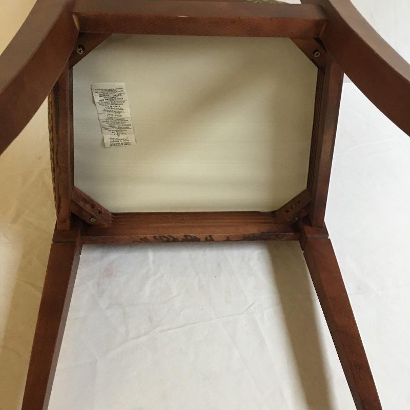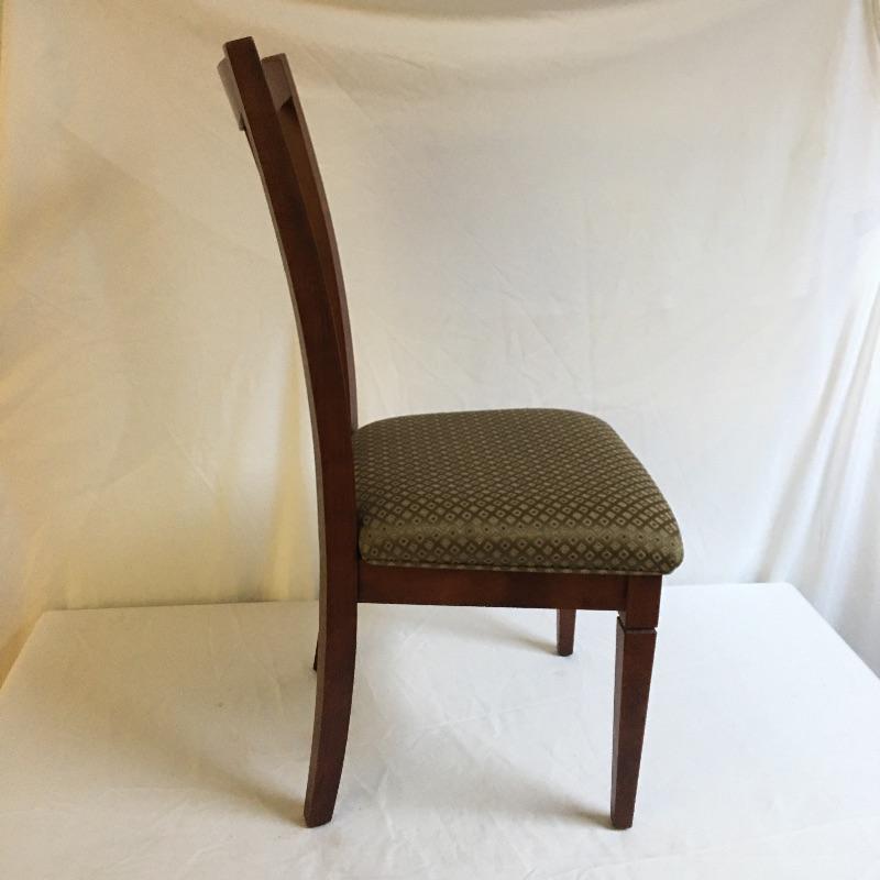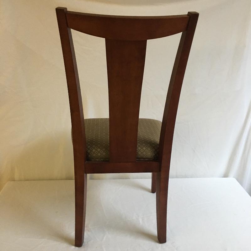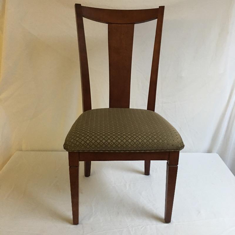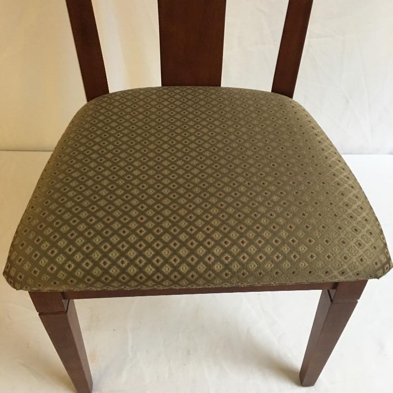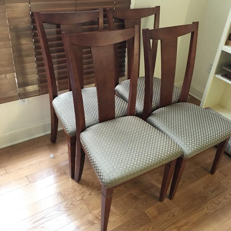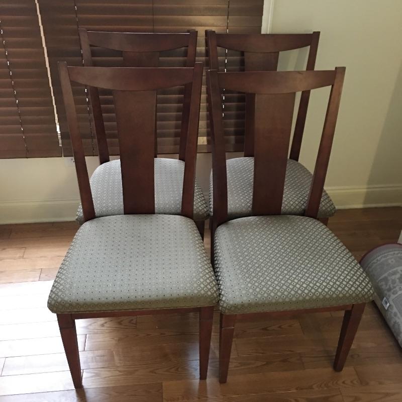 Four dining chairs with padded seats. These nice wooden chairs have a classic design and a neutral fabric seat to match your decor.