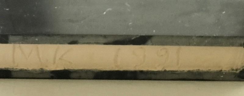 Signed M.K. 1991. Measures 20” long 17-1/2” tall and 4-1/2” deep. Top part is metal and the base is marble and filled. Very heavy