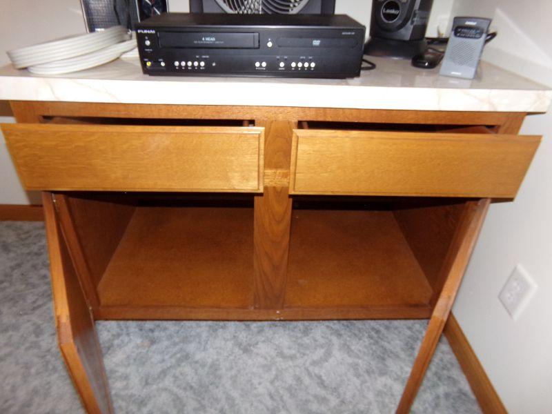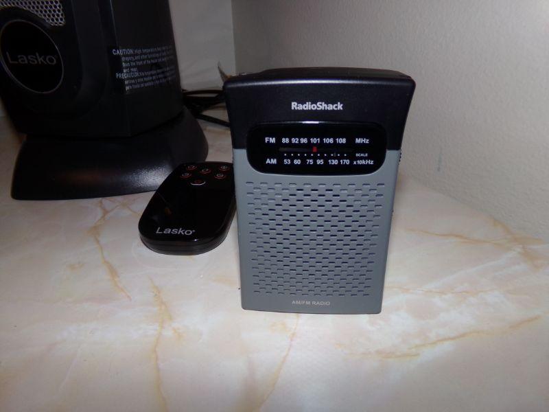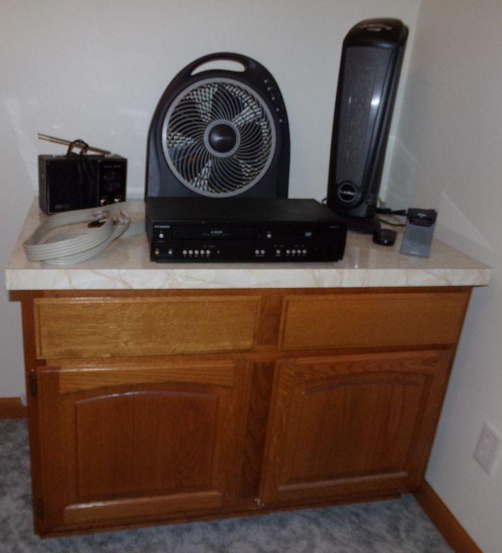 2 DOOR 2 DRAWER CABINET, FAN, HEATER, COMBO VCR/DVD PLAYER, 2 RADIOS, AND A MONSTER CABLE