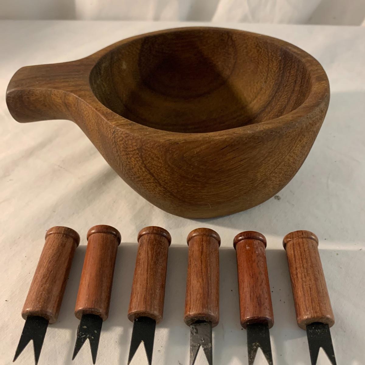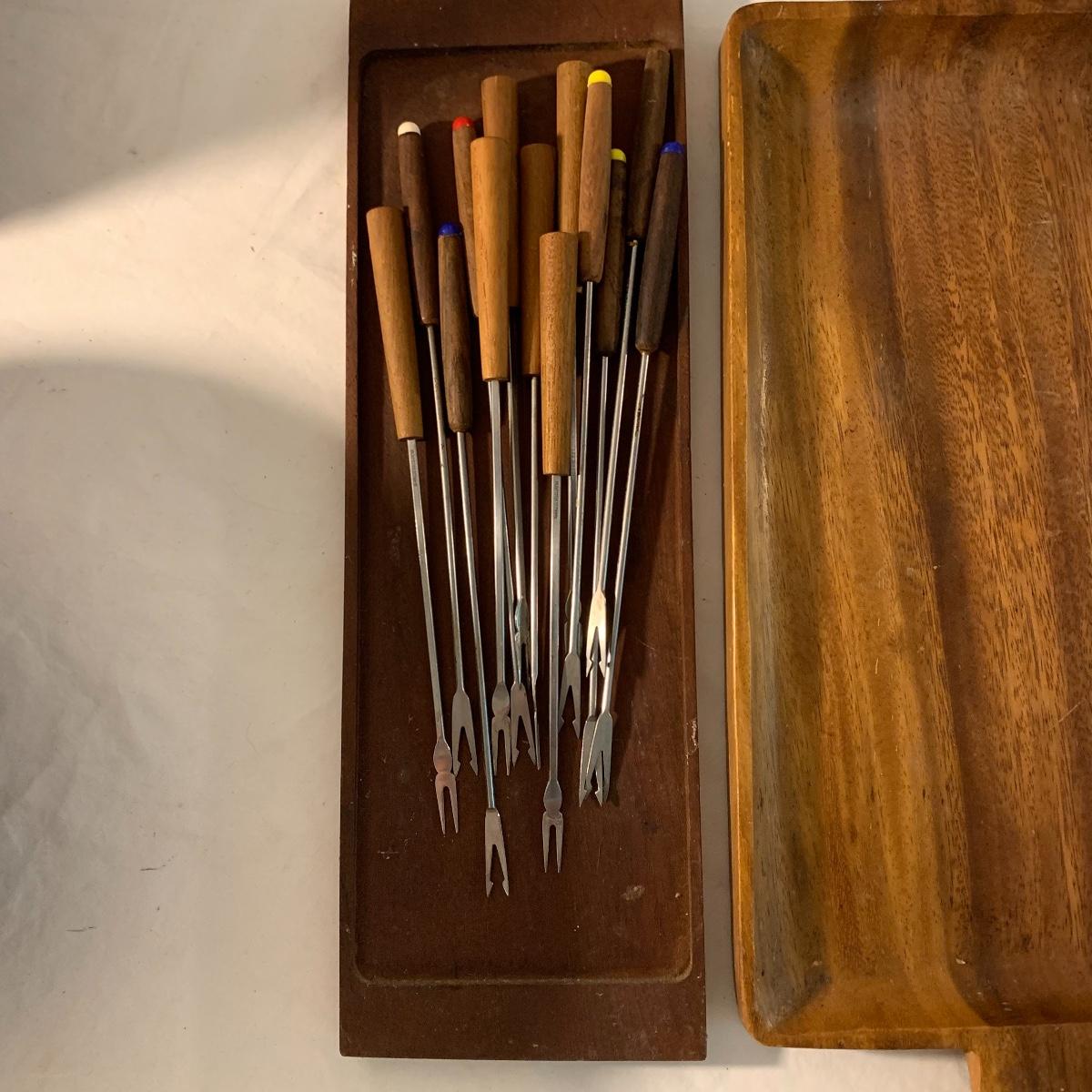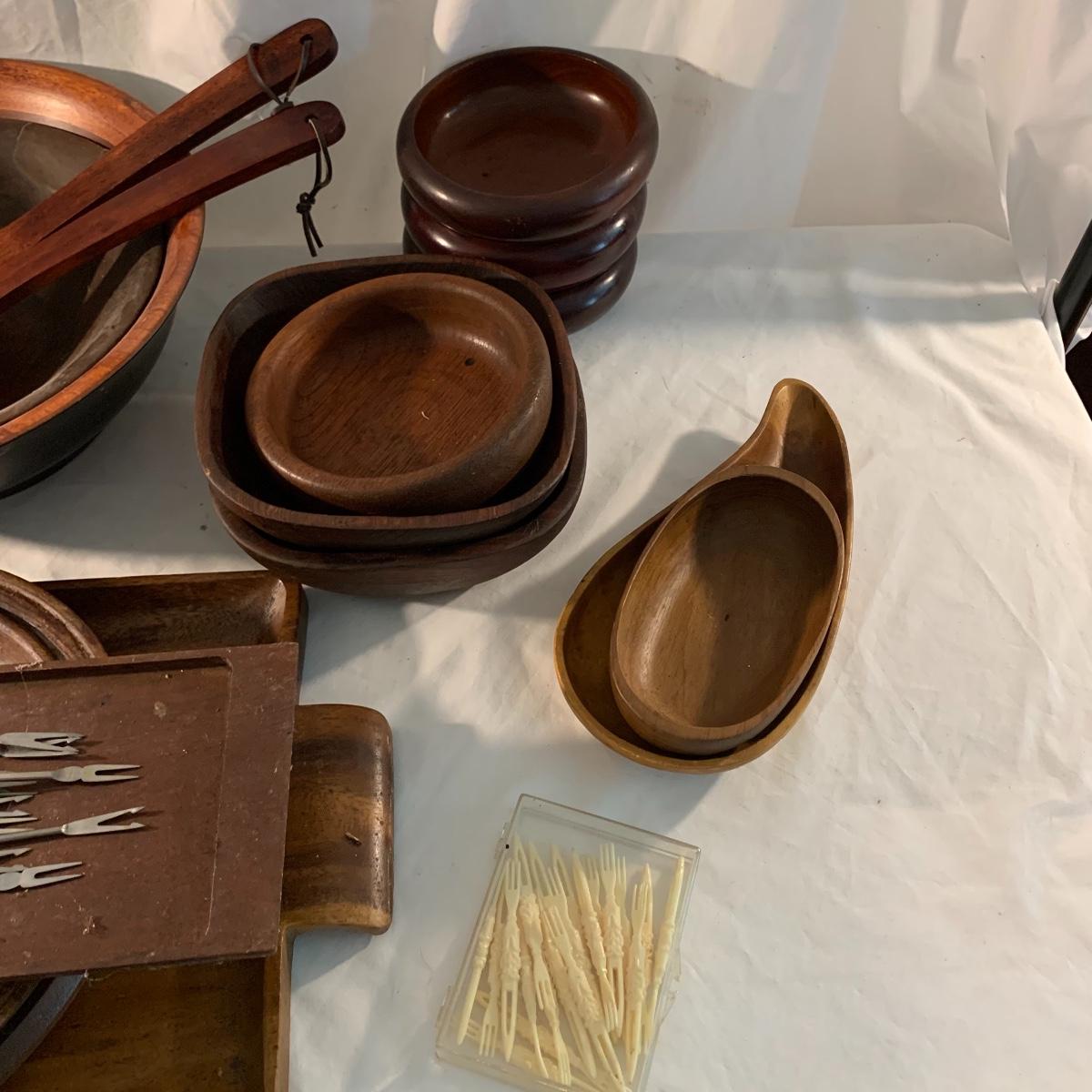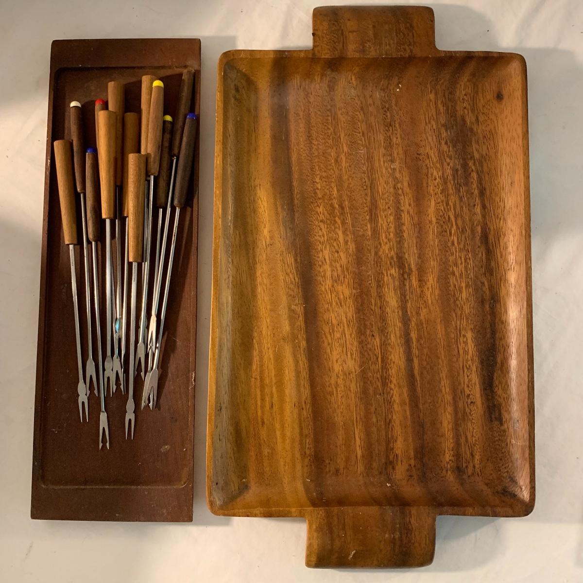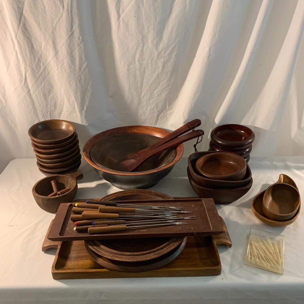 This set of wooden serving trays and bowls will be a hit at your next get together! Featured are two large salad bowls (one is cracked see pic), the largest bowl measures 14"x5", salad serving spoons (14"), a set of eight salad bowls (6"x2"), other assorted bowls, four serving trays, the largest measuring 11"x20"x1", a set of fondue forks, a set of plastic cocktail forks, and even a set of corn holders. See pics for details.