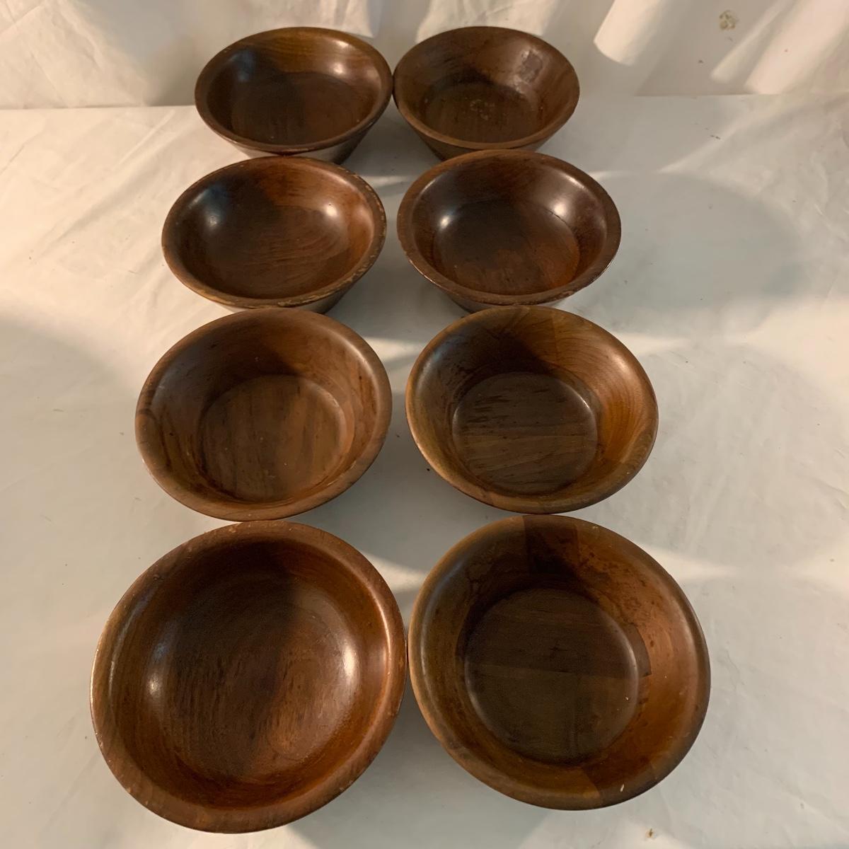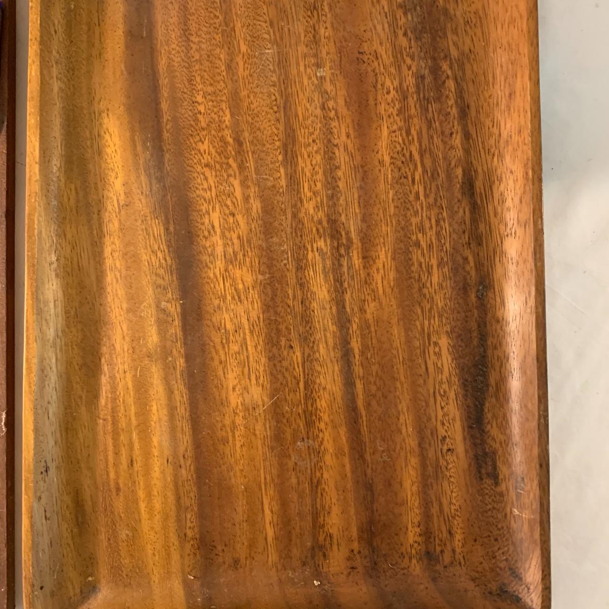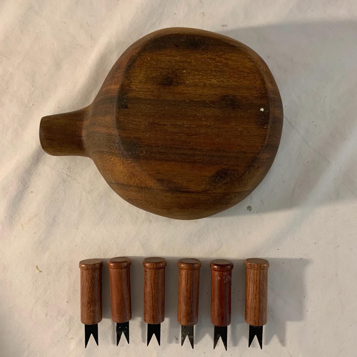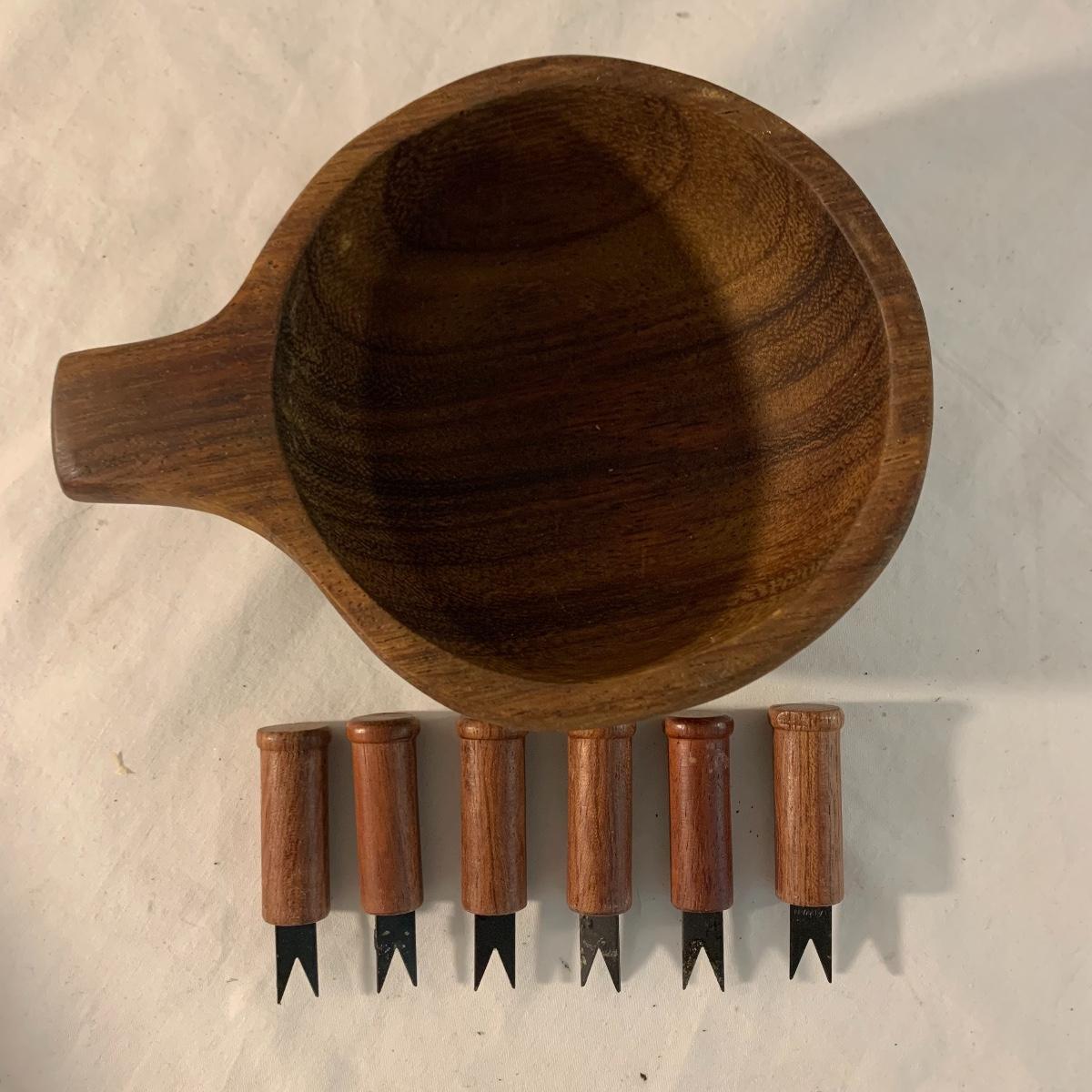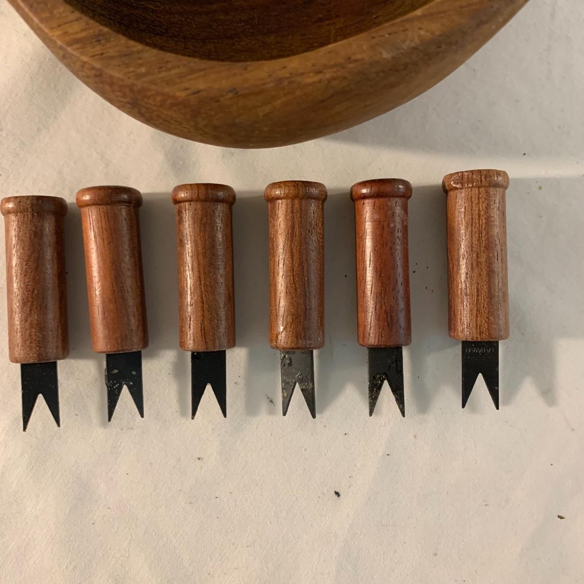 This set of wooden serving trays and bowls will be a hit at your next get together! Featured are two large salad bowls (one is cracked see pic), the largest bowl measures 14"x5", salad serving spoons (14"), a set of eight salad bowls (6"x2"), other assorted bowls, four serving trays, the largest measuring 11"x20"x1", a set of fondue forks, a set of plastic cocktail forks, and even a set of corn holders. See pics for details.