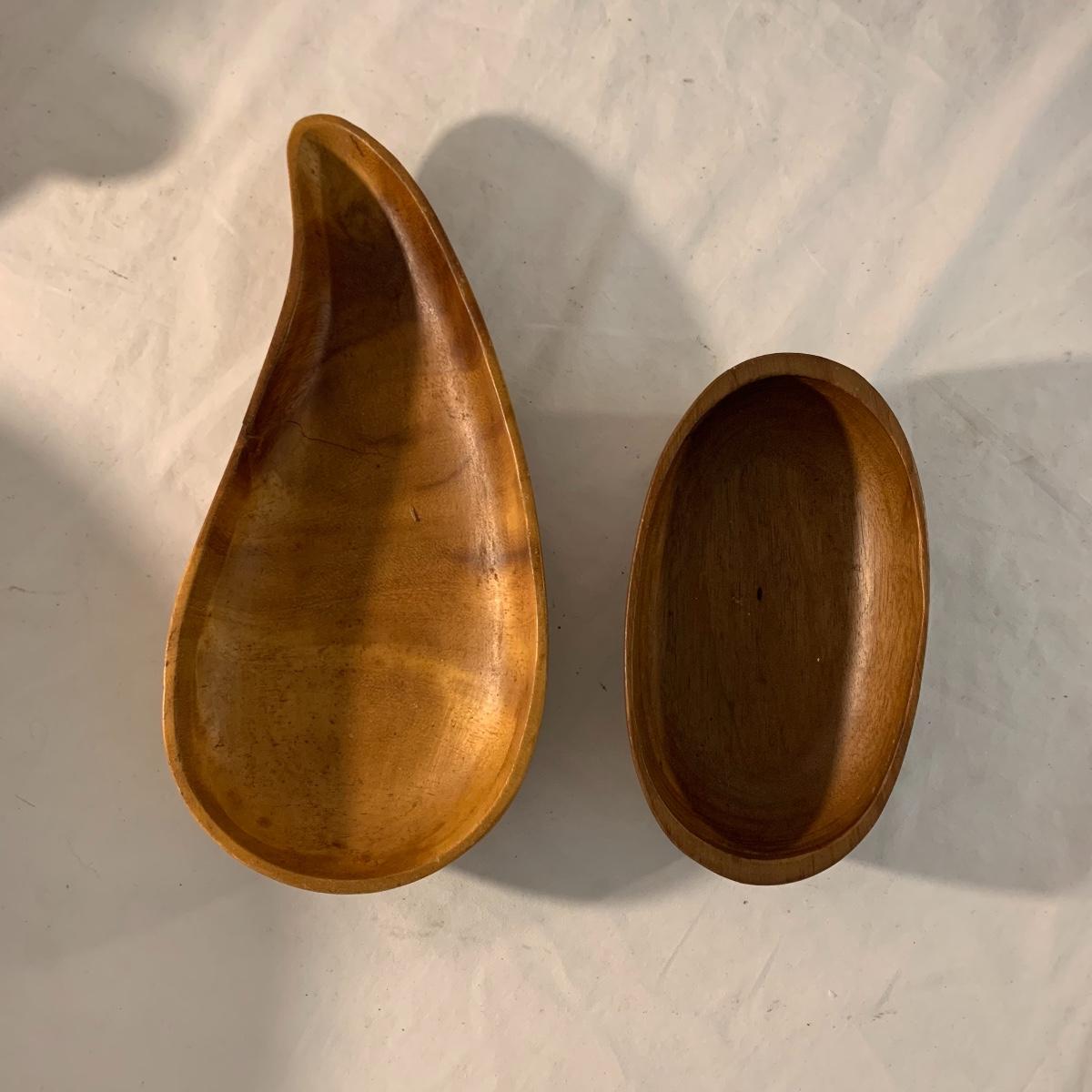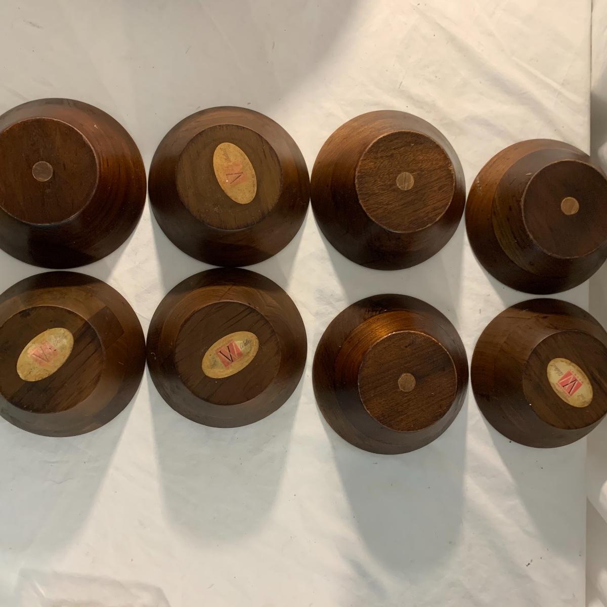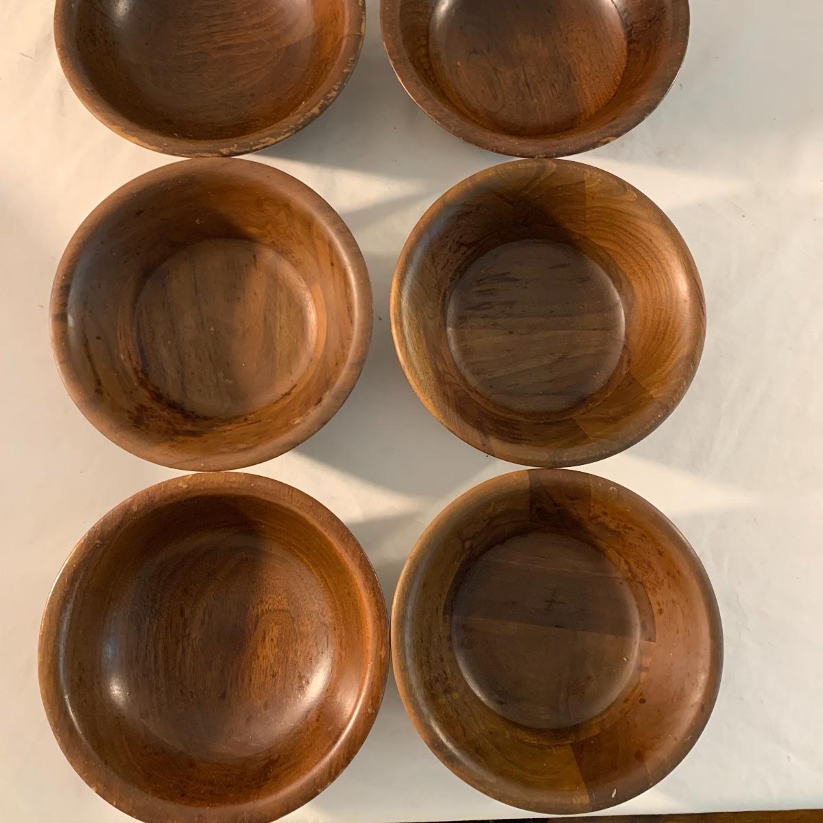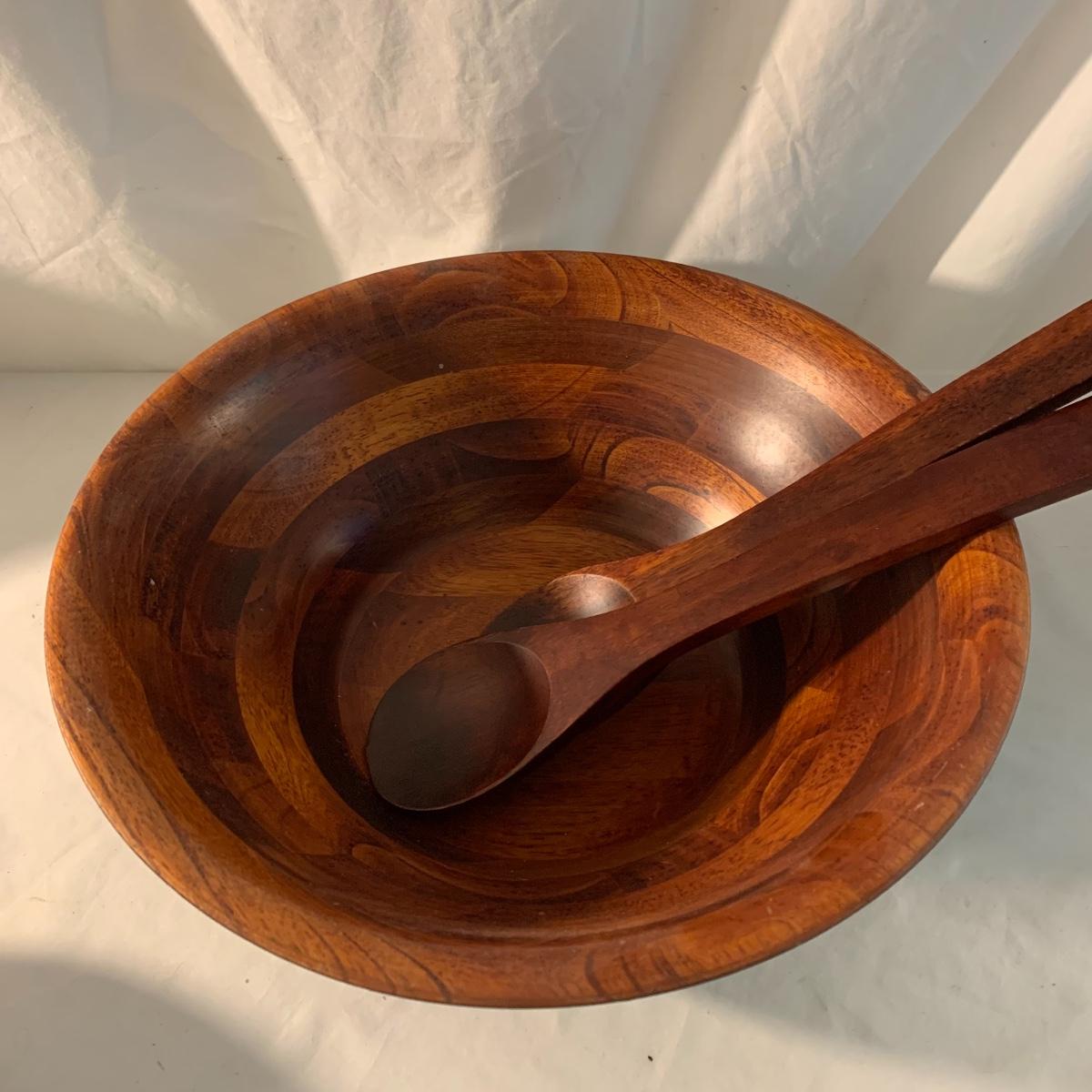This set of wooden serving trays and bowls will be a hit at your next get together! Featured are two large salad bowls (one is cracked see pic), the largest bowl measures 14"x5", salad serving spoons (14"), a set of eight salad bowls (6"x2"), other assorted bowls, four serving trays, the largest measuring 11"x20"x1", a set of fondue forks, a set of plastic cocktail forks, and even a set of corn holders. See pics for details.