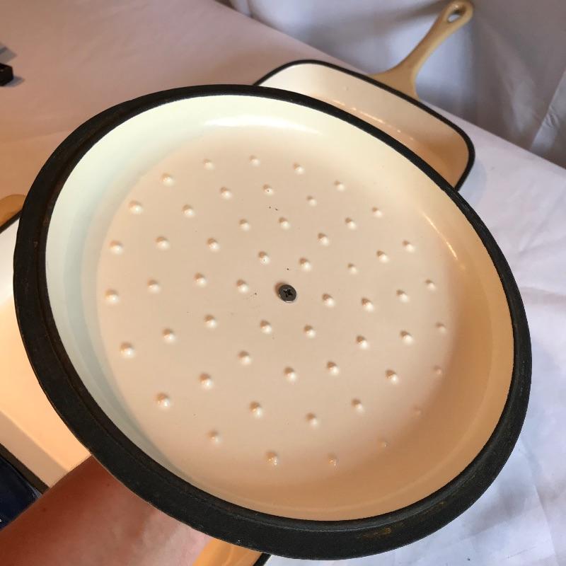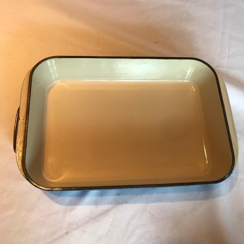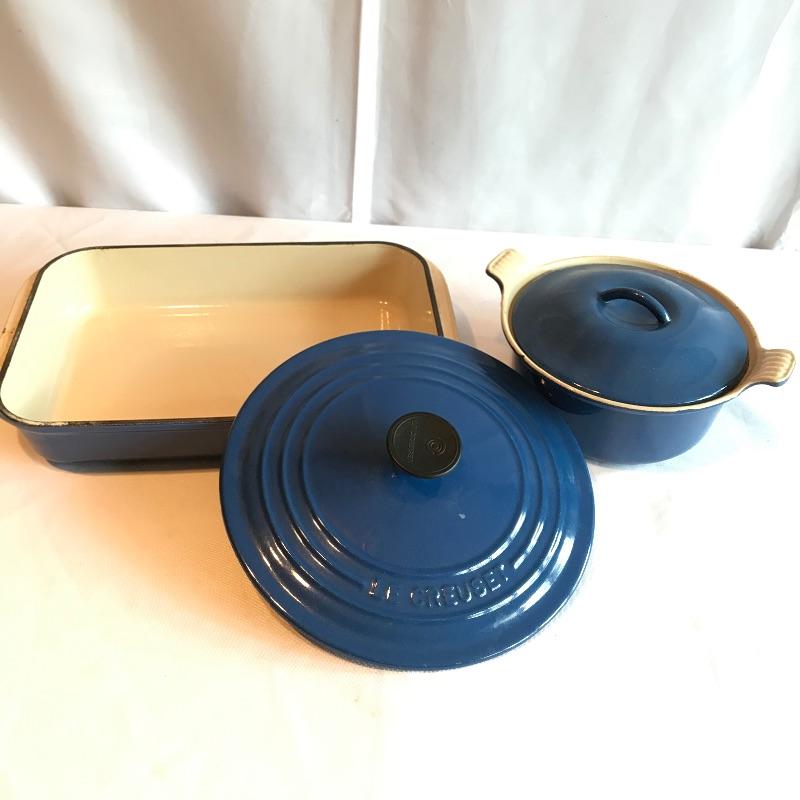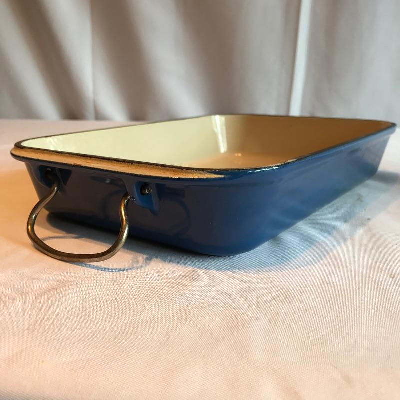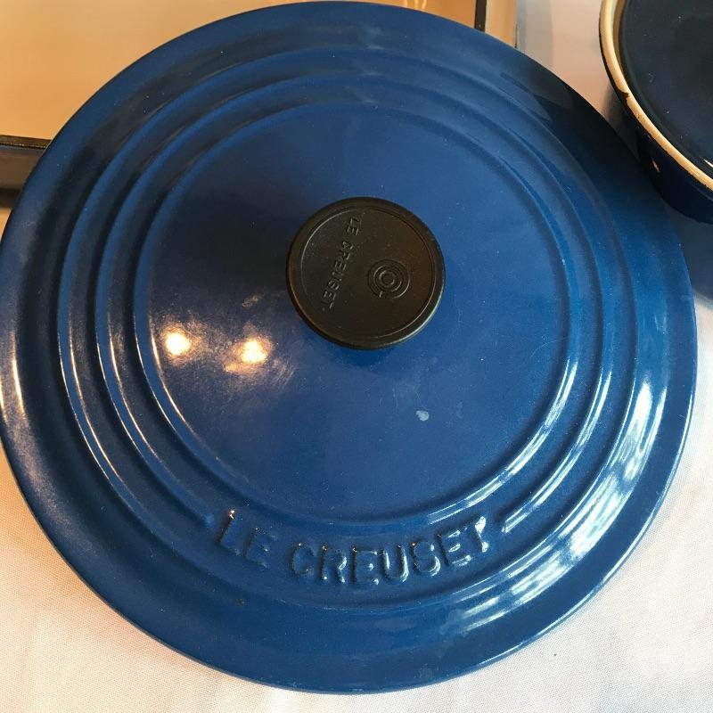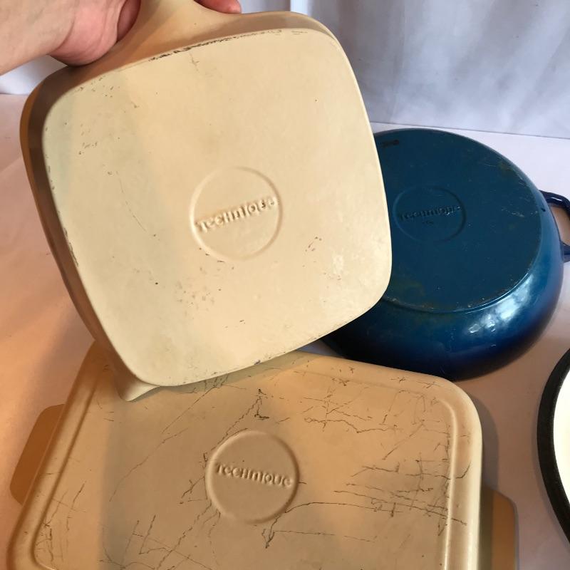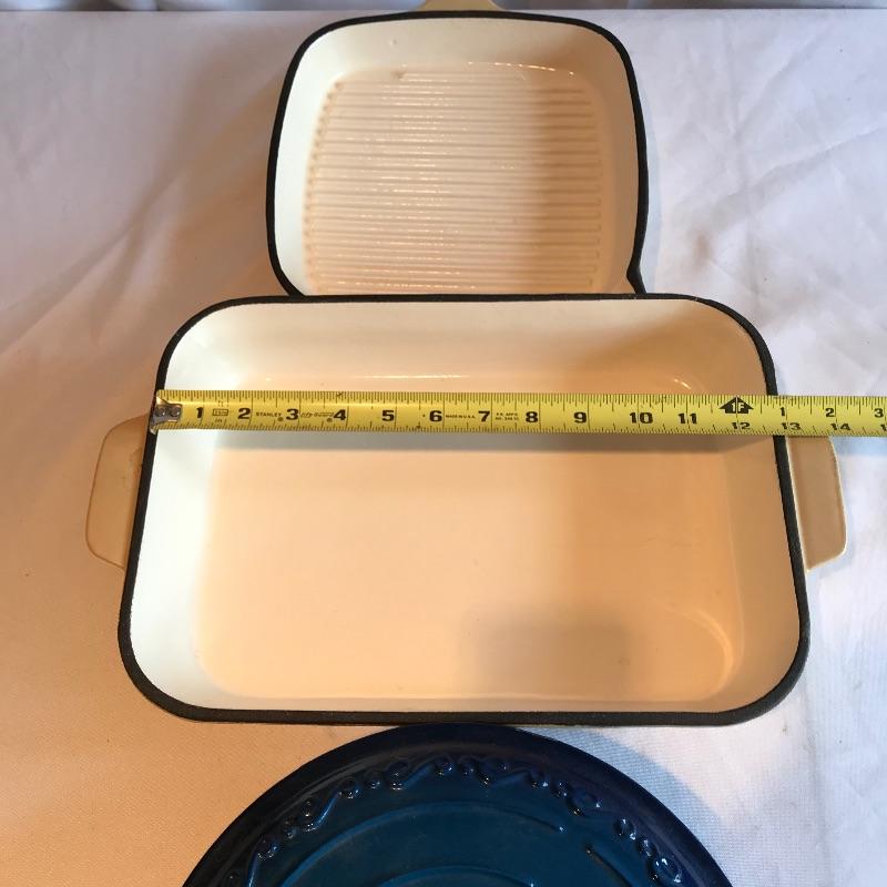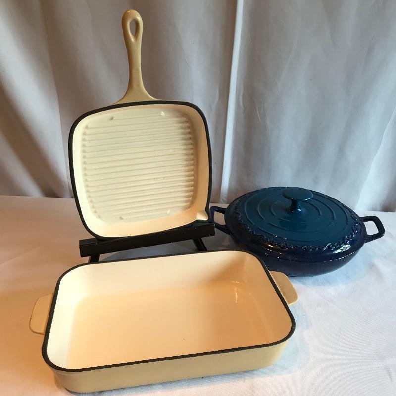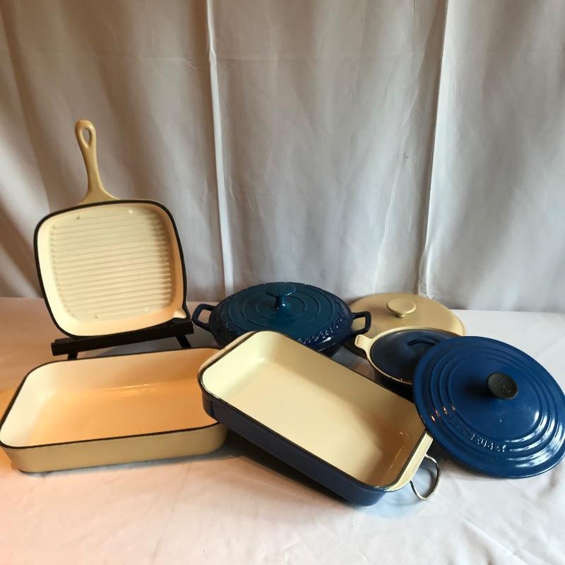 Le Creuset always stands up to its reputation! We have two pieces of blue and cream colored Le Creuset enameled iron oven ware. The #18 pot has a lid that fits, but doesn’t fit the Le Creuset style found in lot 93. The casserole dish has metal handles, see photos for measurements. Lot also features three pieces by Technique. An ivory baking pan and grill skillet with a beautiful blue oven safe lidded dish. We’ve thrown in two extra lids- they appear to be one of each brand. Some small chips were noticed throughout collection. See photos. Check out lot 93 for more Le Creuset and enameled iron cookware. Local pick up only.