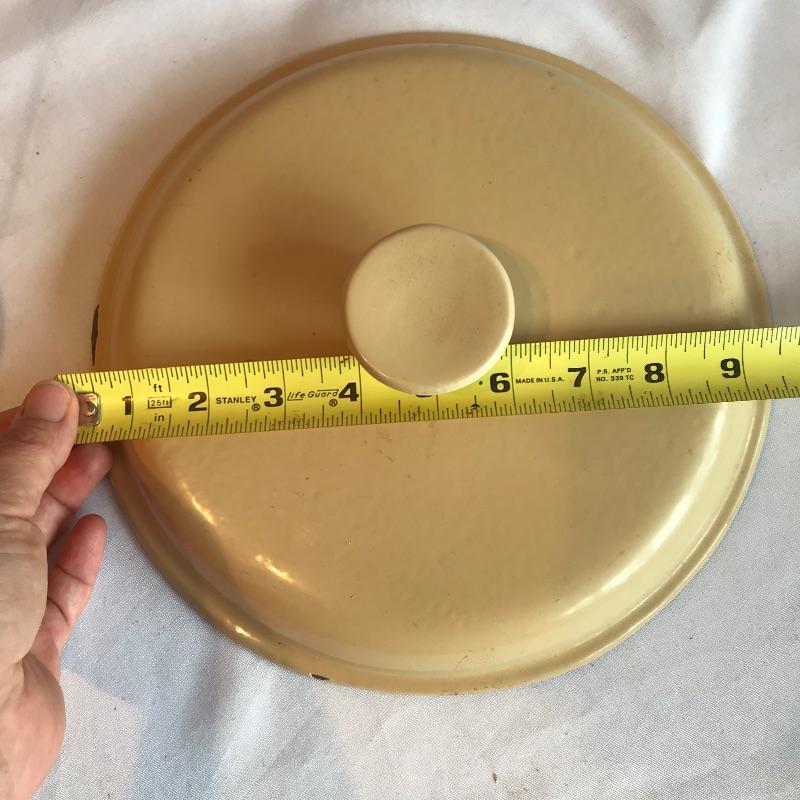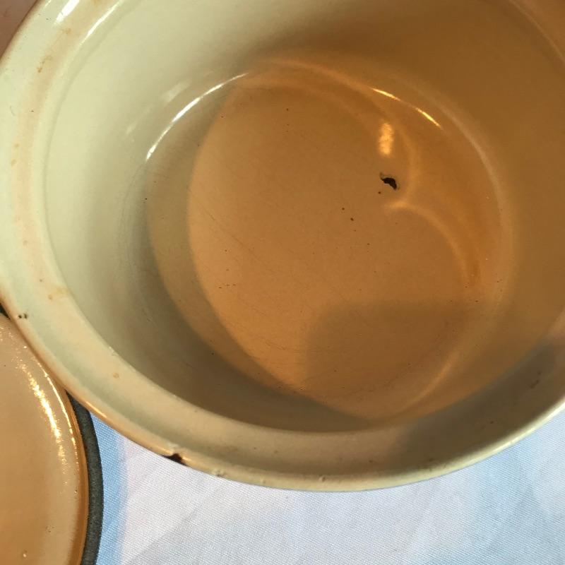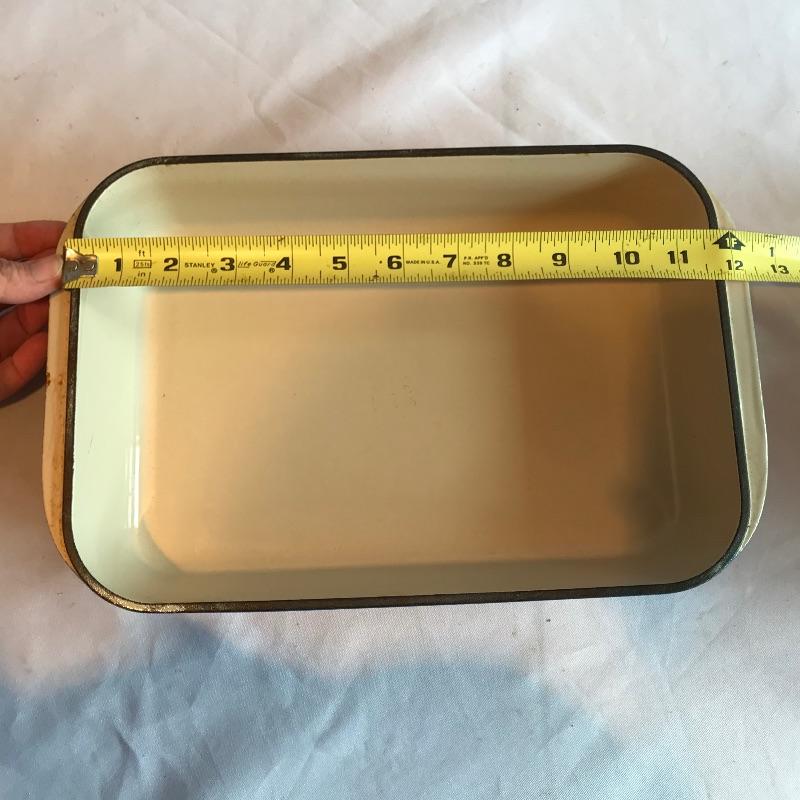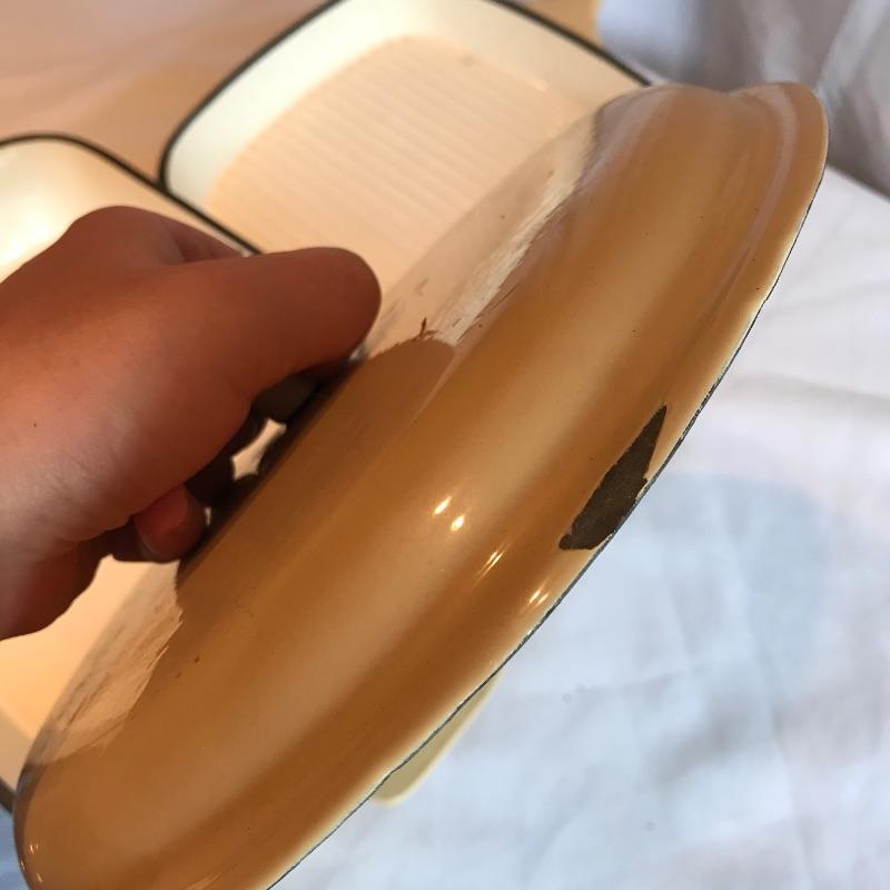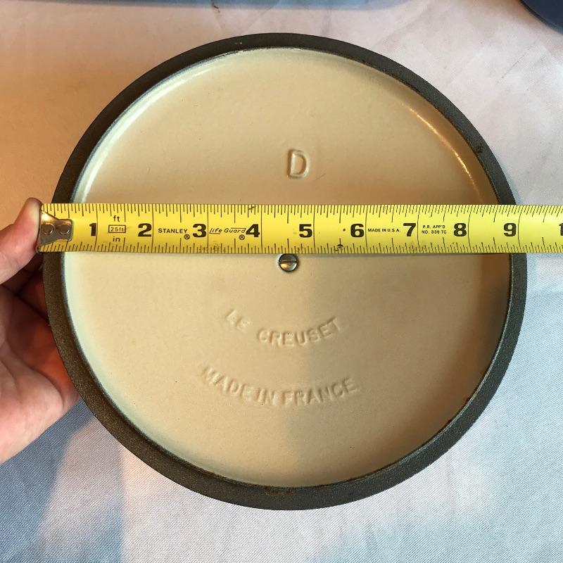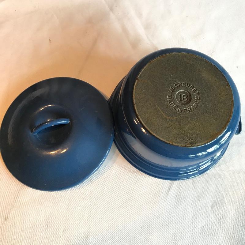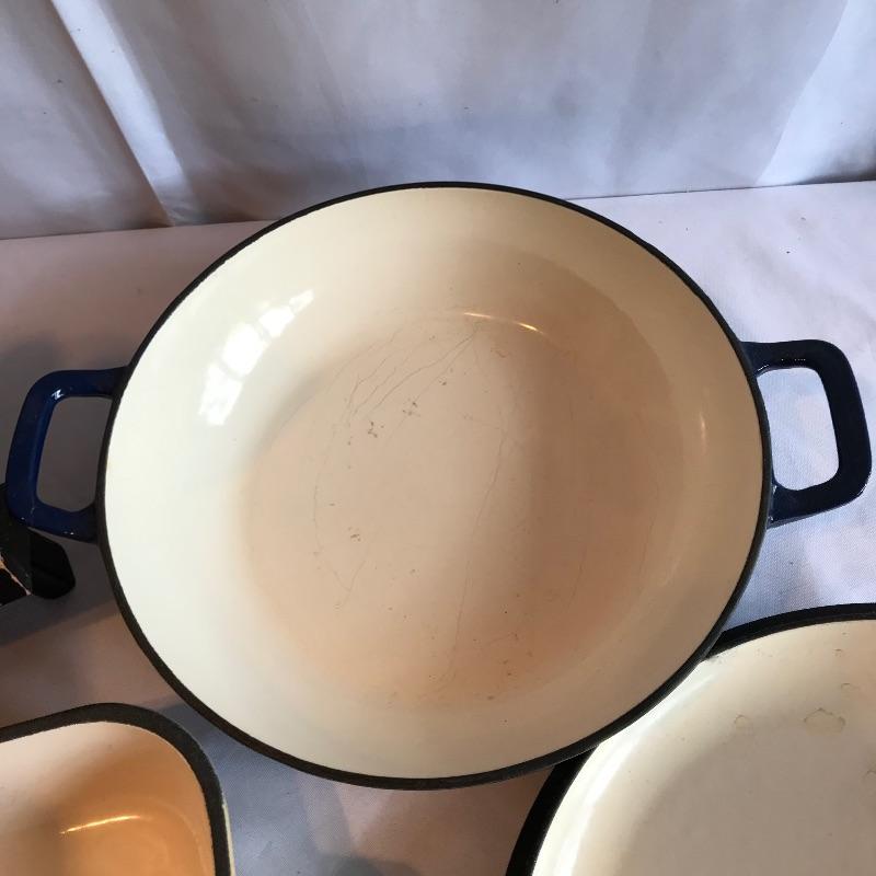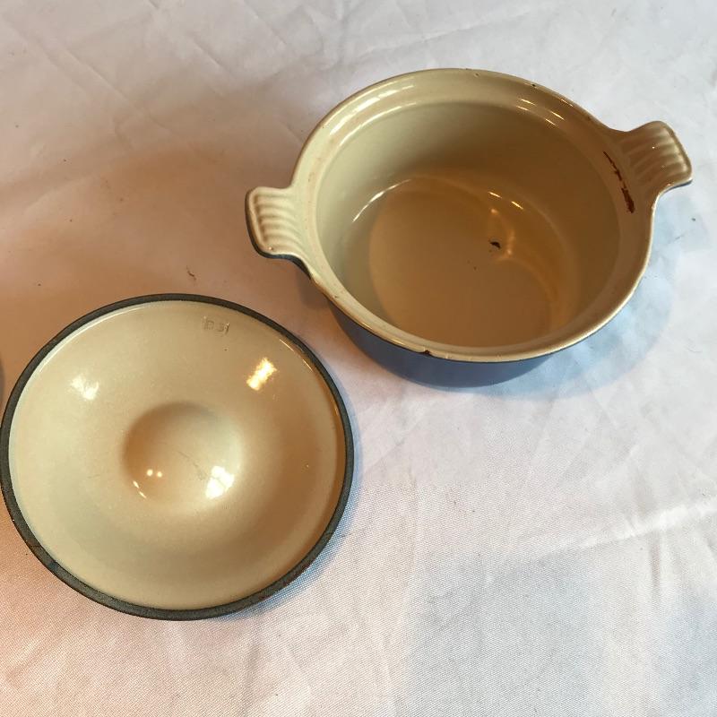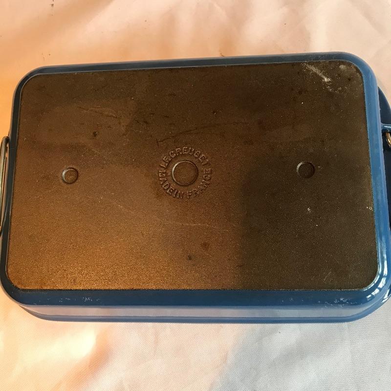 Le Creuset always stands up to its reputation! We have two pieces of blue and cream colored Le Creuset enameled iron oven ware. The #18 pot has a lid that fits, but doesn’t fit the Le Creuset style found in lot 93. The casserole dish has metal handles, see photos for measurements. Lot also features three pieces by Technique. An ivory baking pan and grill skillet with a beautiful blue oven safe lidded dish. We’ve thrown in two extra lids- they appear to be one of each brand. Some small chips were noticed throughout collection. See photos. Check out lot 93 for more Le Creuset and enameled iron cookware. Local pick up only.