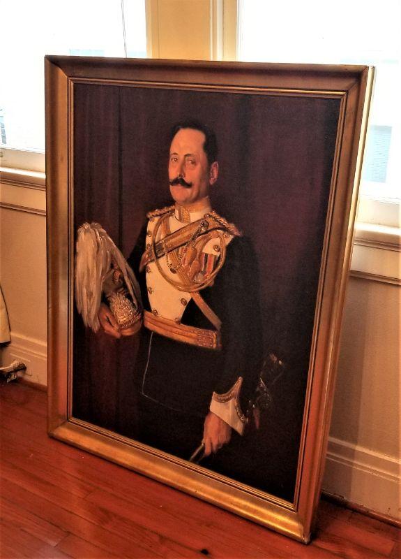 Large, nicely rendered oil on board painting of a military figure - unsigned. Good condition. His eyes follow you everywhere! Measures 39" across, 49.5" tall. There are conflicting reports on the original of this painting. Family members believe that my client's first wife bought this for him at auction some years ago - however, after examination, we believe this may be a contemporary movie prop from one of the many films our client worked on. Done in the antique style with a GREAT look.
