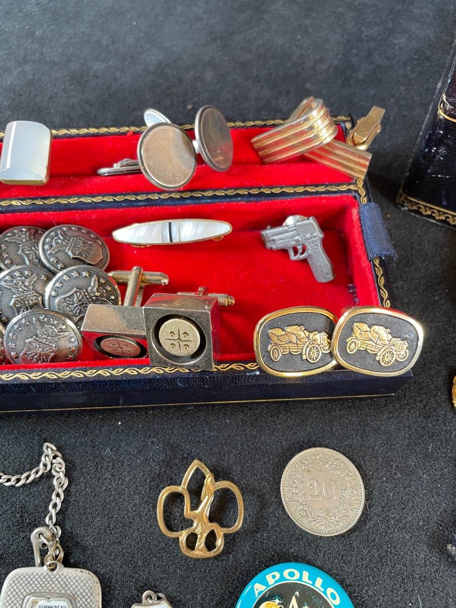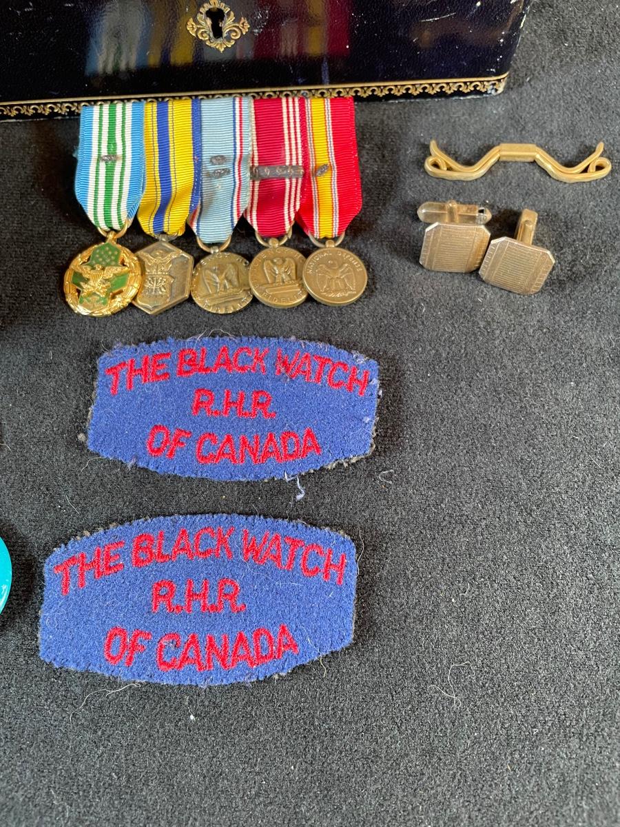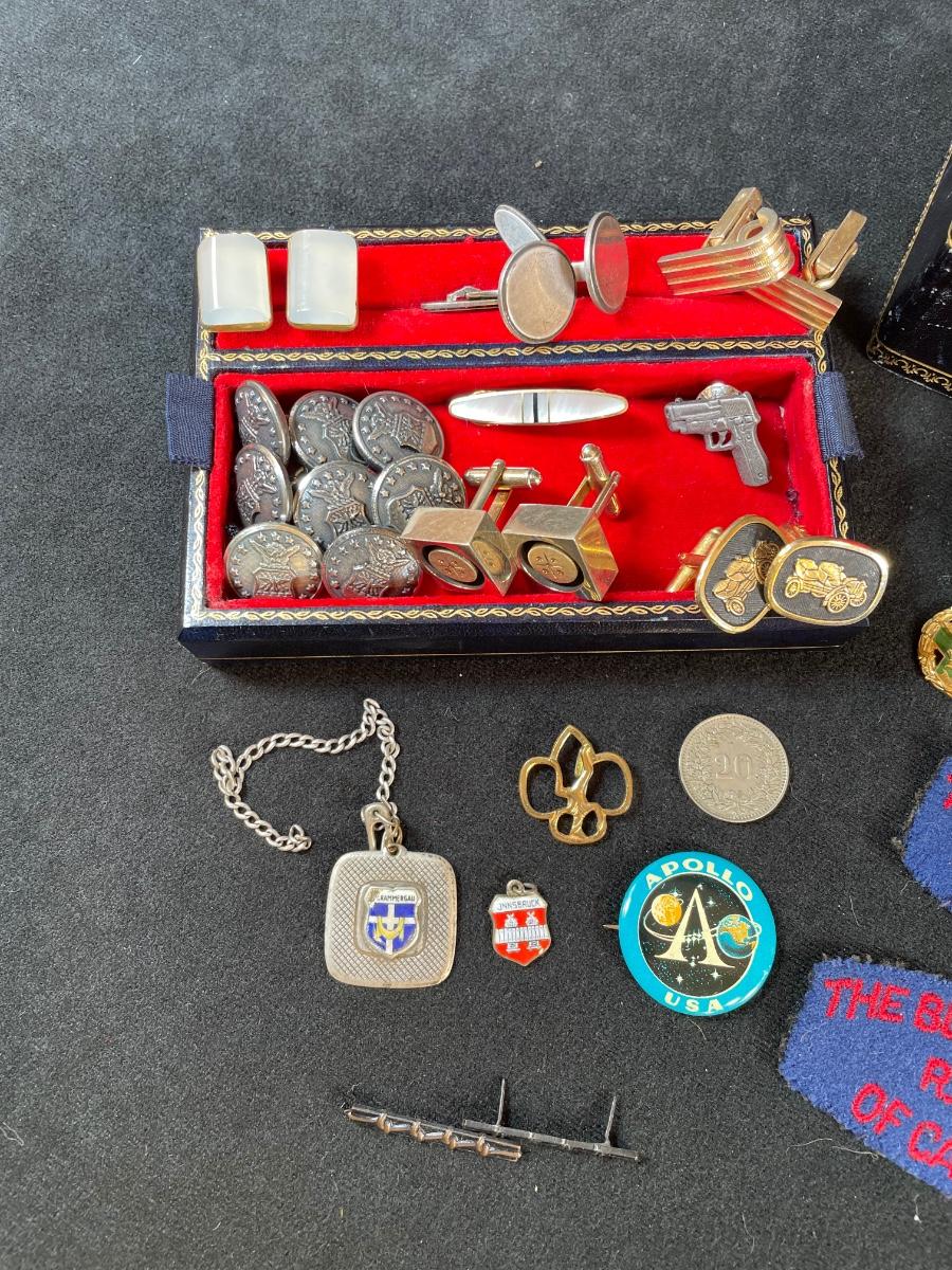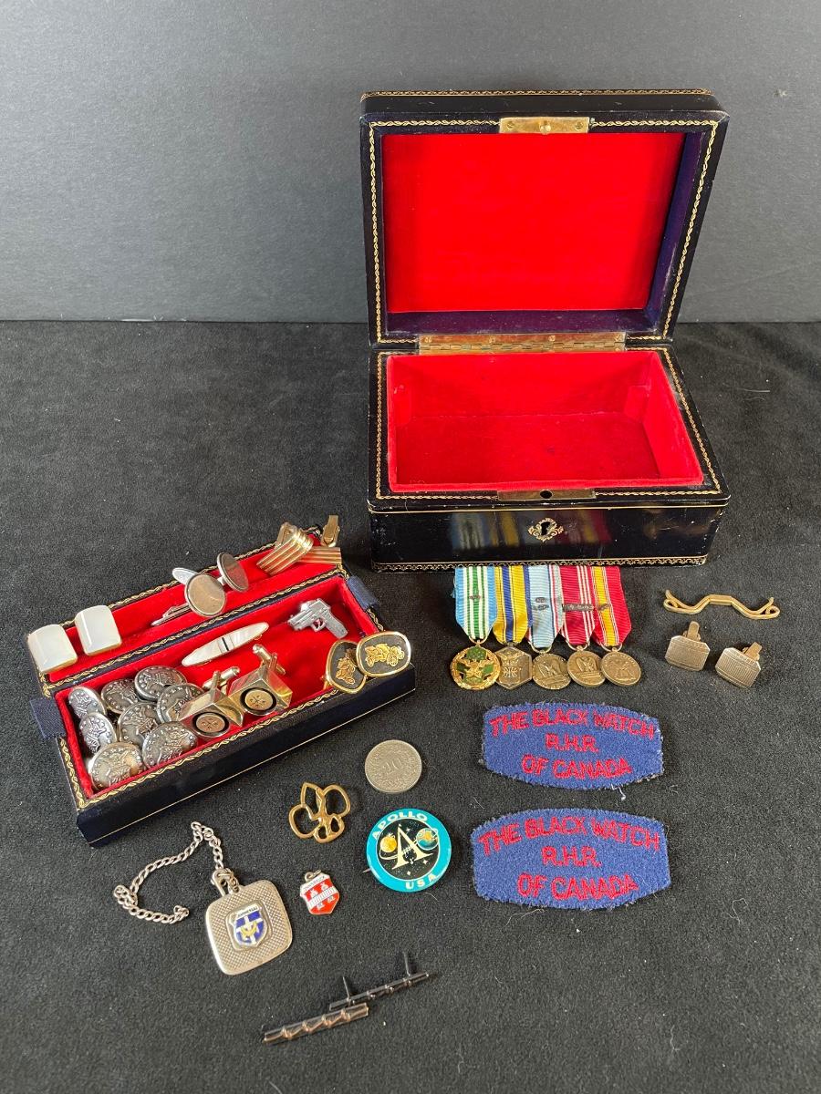 Assortment of military medals, buttons and patches and cufflinks, Charles, etc with a leather jejwelry box in excellent condition