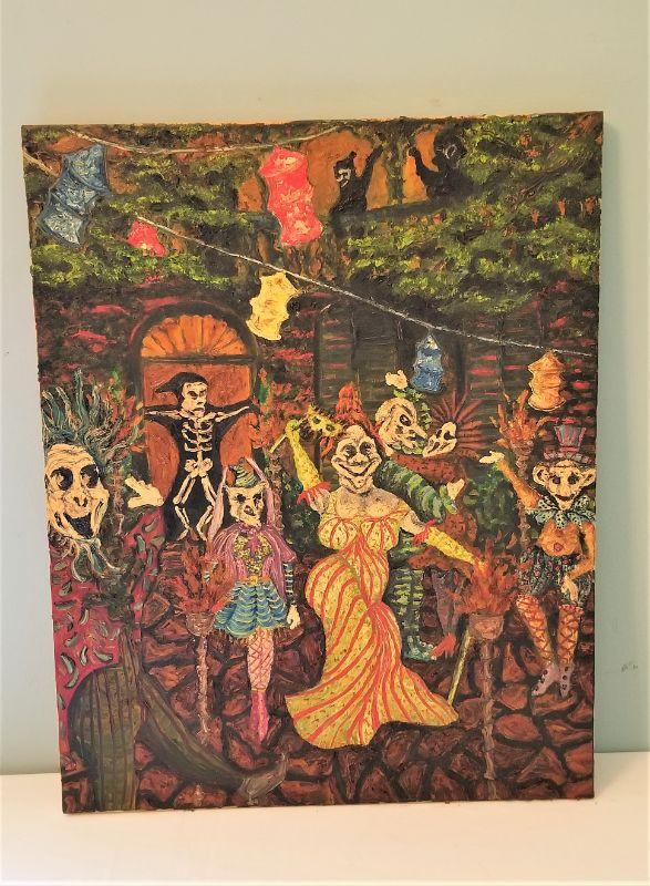 Large canvas - 24" x 30" - title on reverse appears to be "wire-tapped soiree" - dated 2001.. A strange mix of Carnival and Halloween.