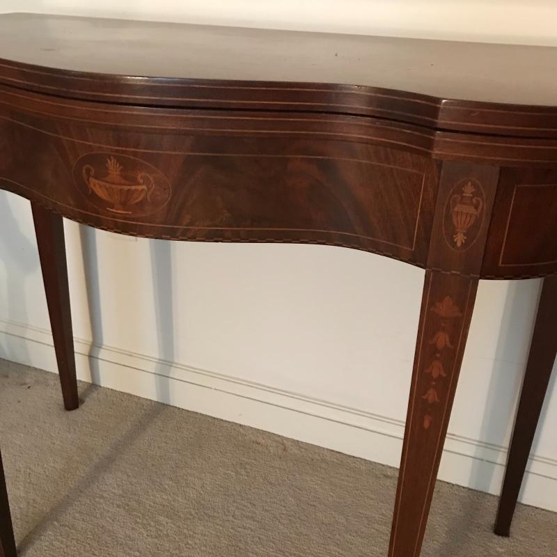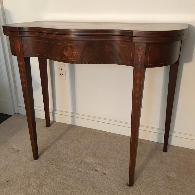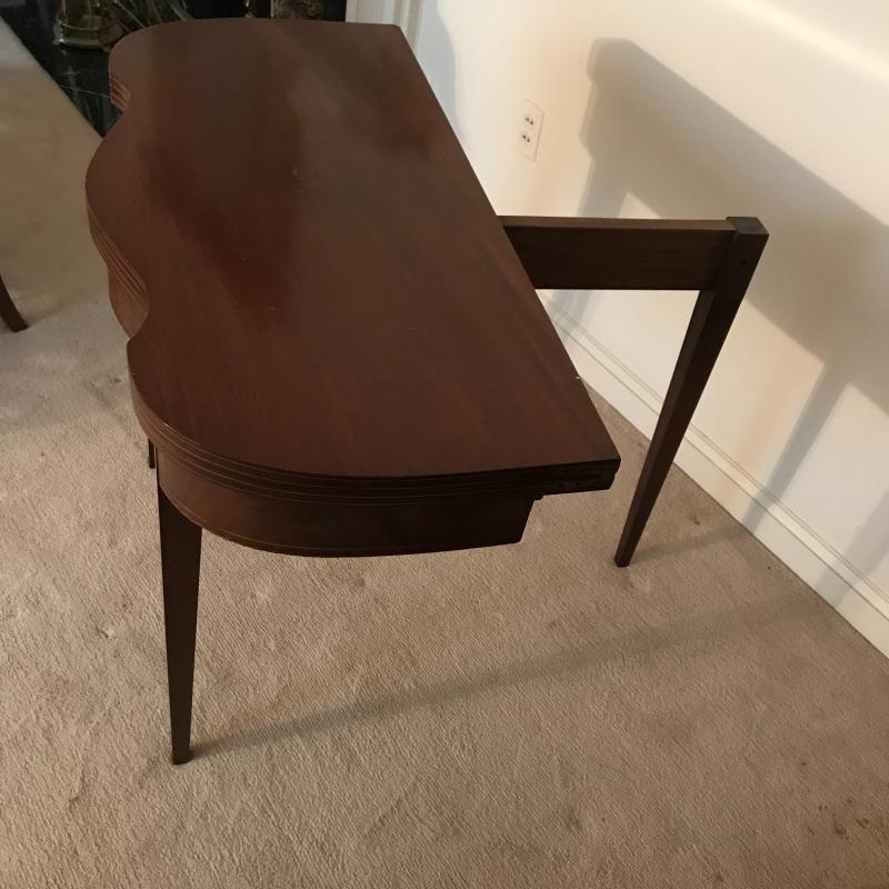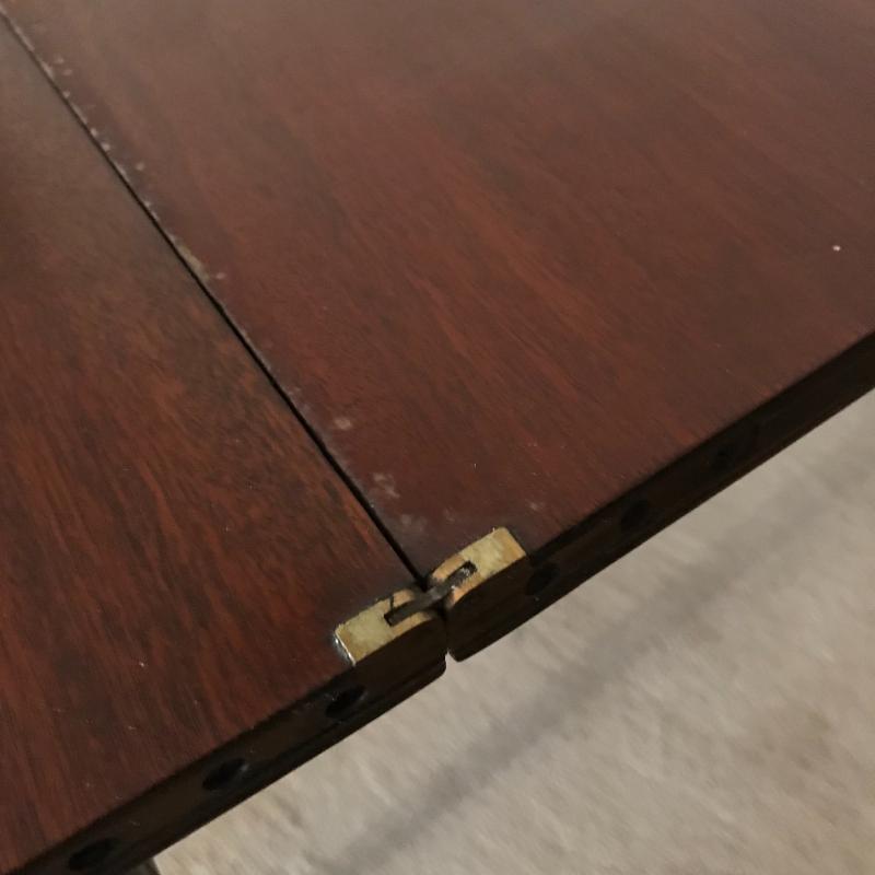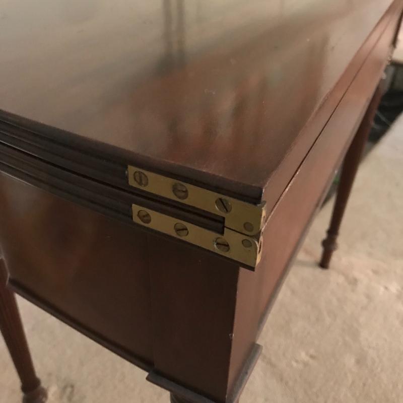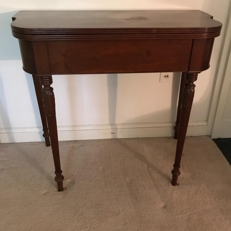 Terrific duo of gaming tables, both collapse over top. First table in photos measures approx. 36x18” and has more ornate designs including an old fashioned designs on the face and a dovetail hinge to support the table while opened. See photos for damaged areas. The second table has beautifully carved legs and less wear. It measures approx. 34.5x17.5”. No shipping.