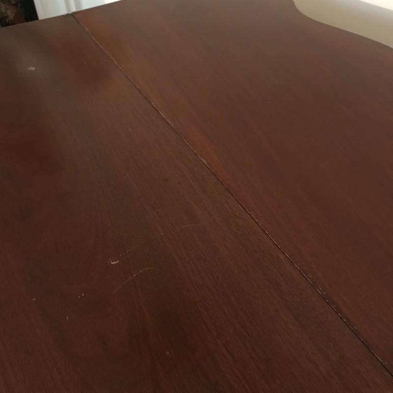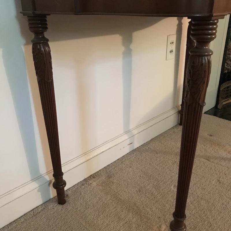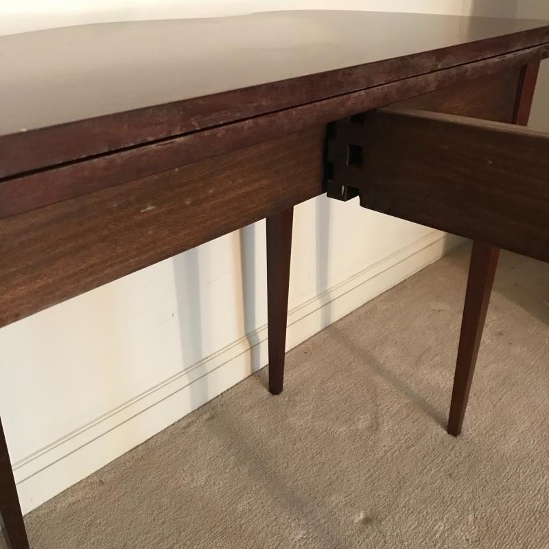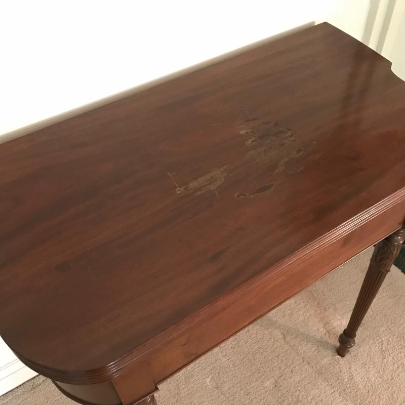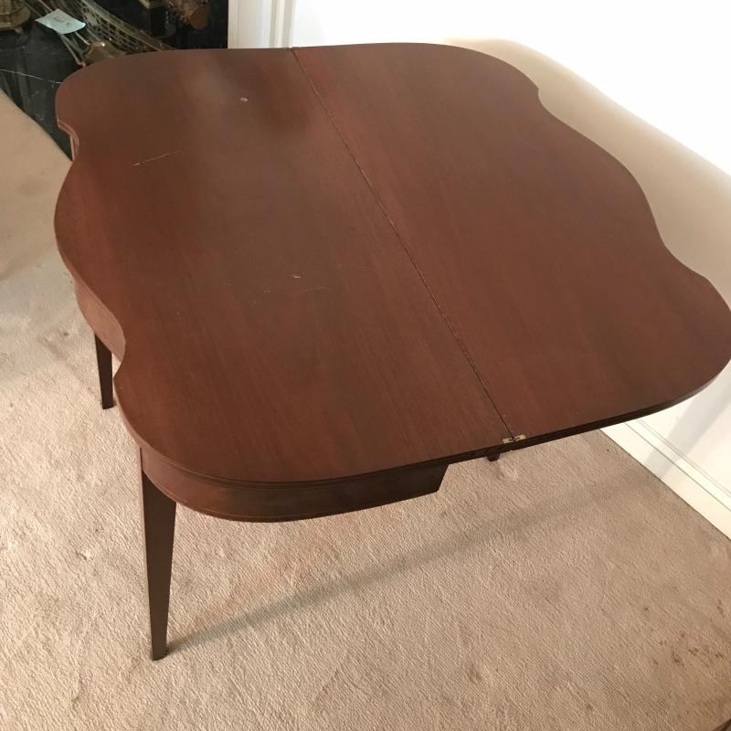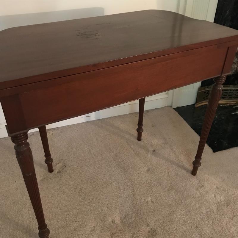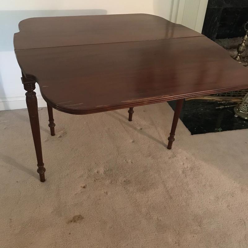 Terrific duo of gaming tables, both collapse over top. First table in photos measures approx. 36x18” and has more ornate designs including an old fashioned designs on the face and a dovetail hinge to support the table while opened. See photos for damaged areas. The second table has beautifully carved legs and less wear. It measures approx. 34.5x17.5”. No shipping.
