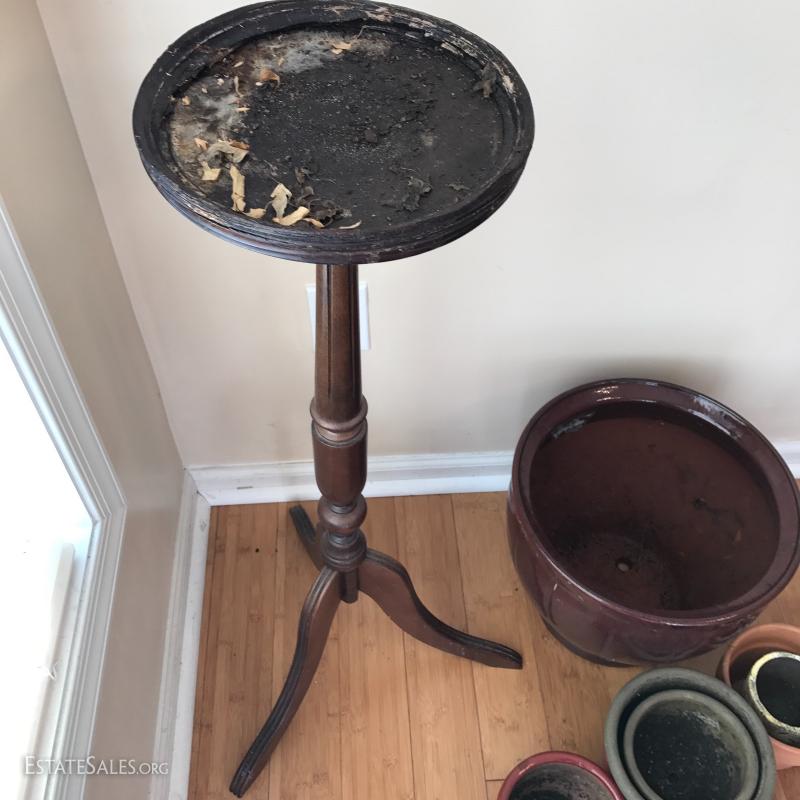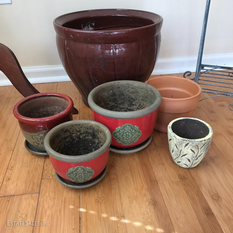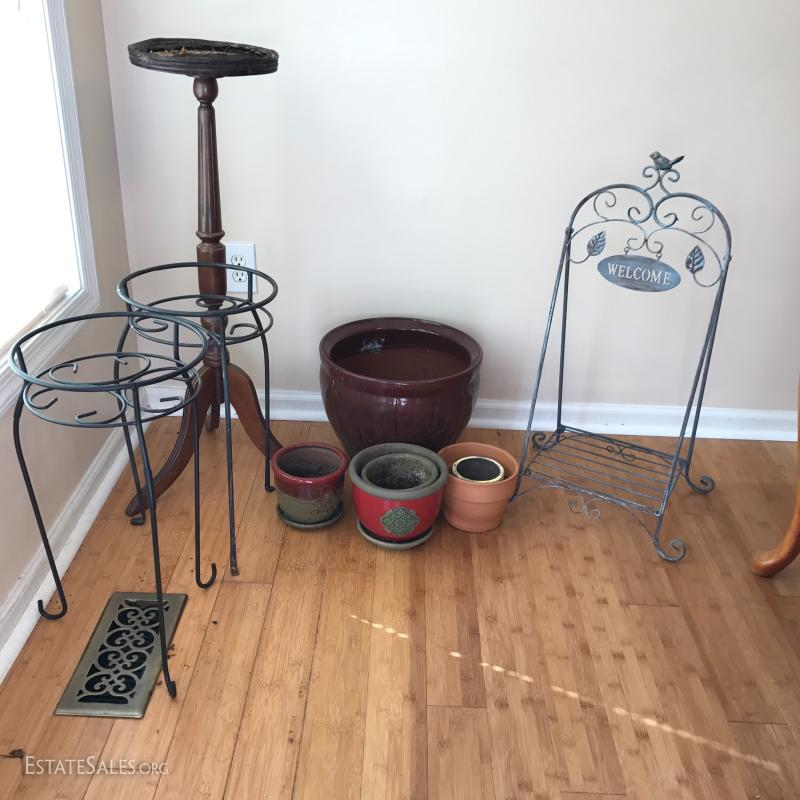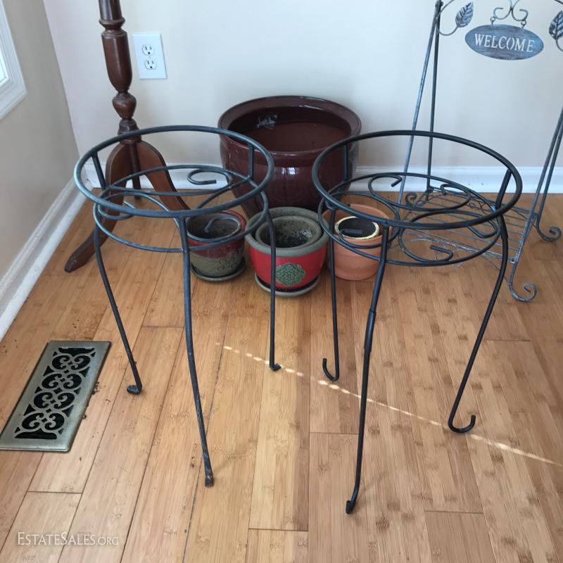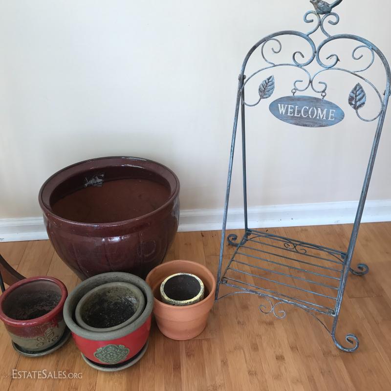 2 metal plant stands measuring 21" tall and a metal welcome stand with small shelf for pot. 6 clay or terra-cotta pots and one wood plant stand with water damage on the top but still useable. This lot is available for local pick up in Mills River, NC only.