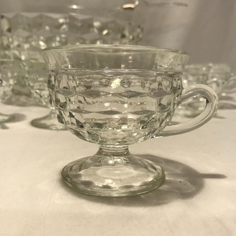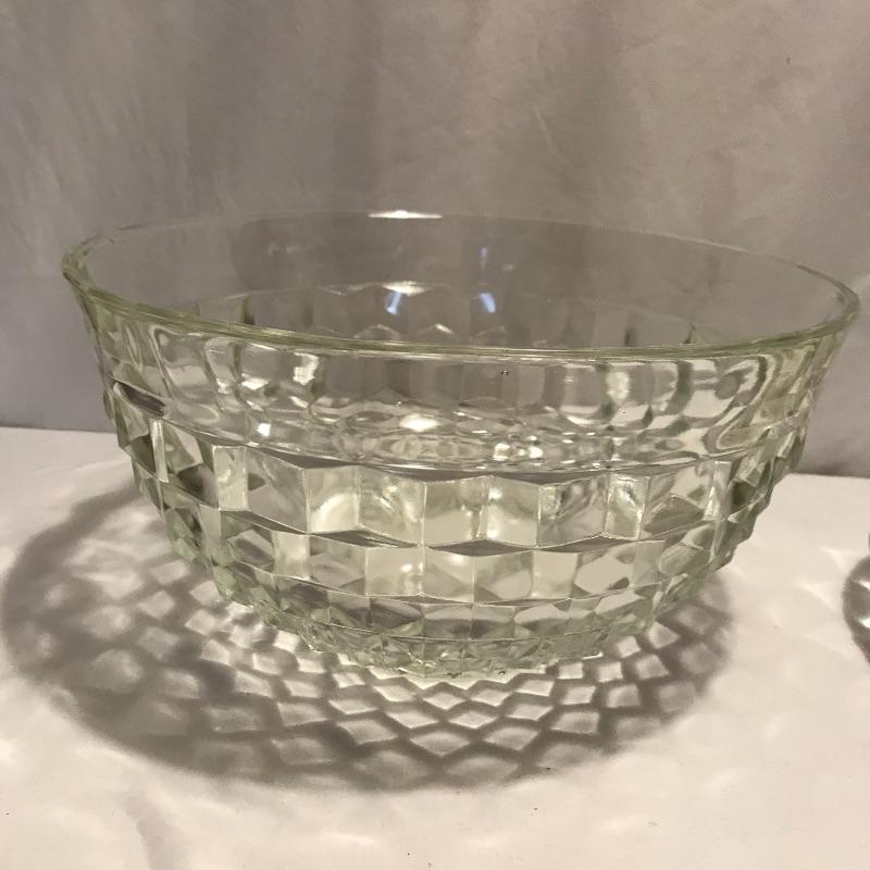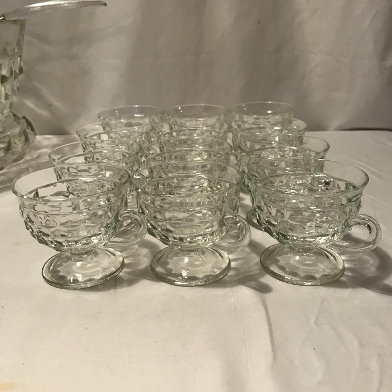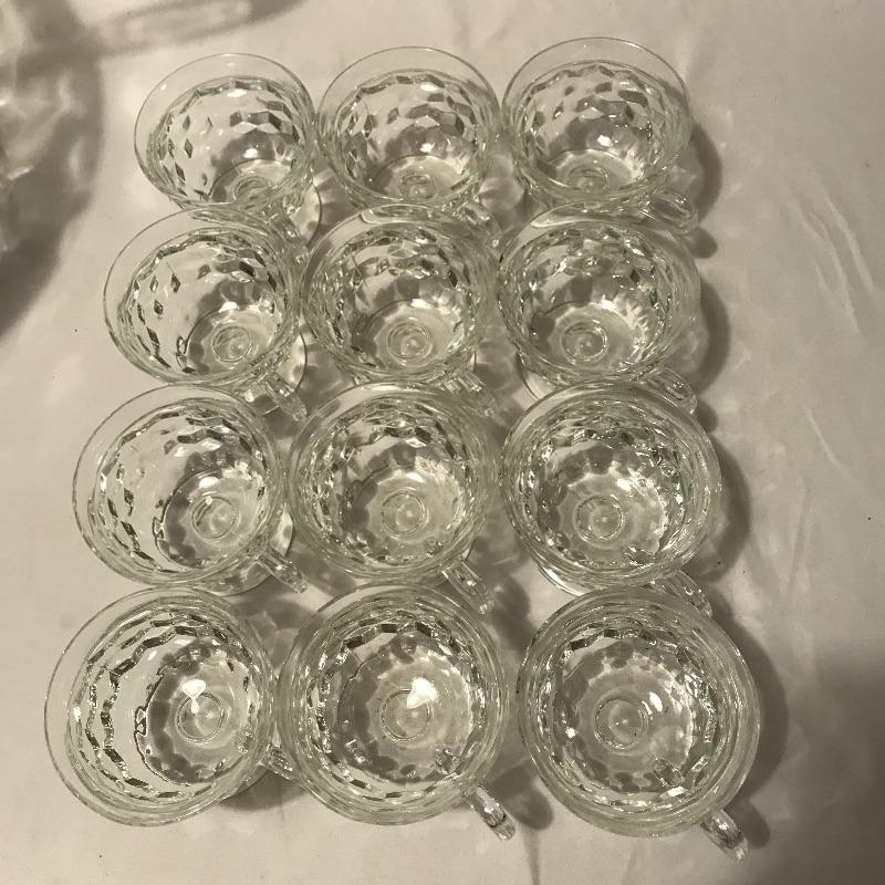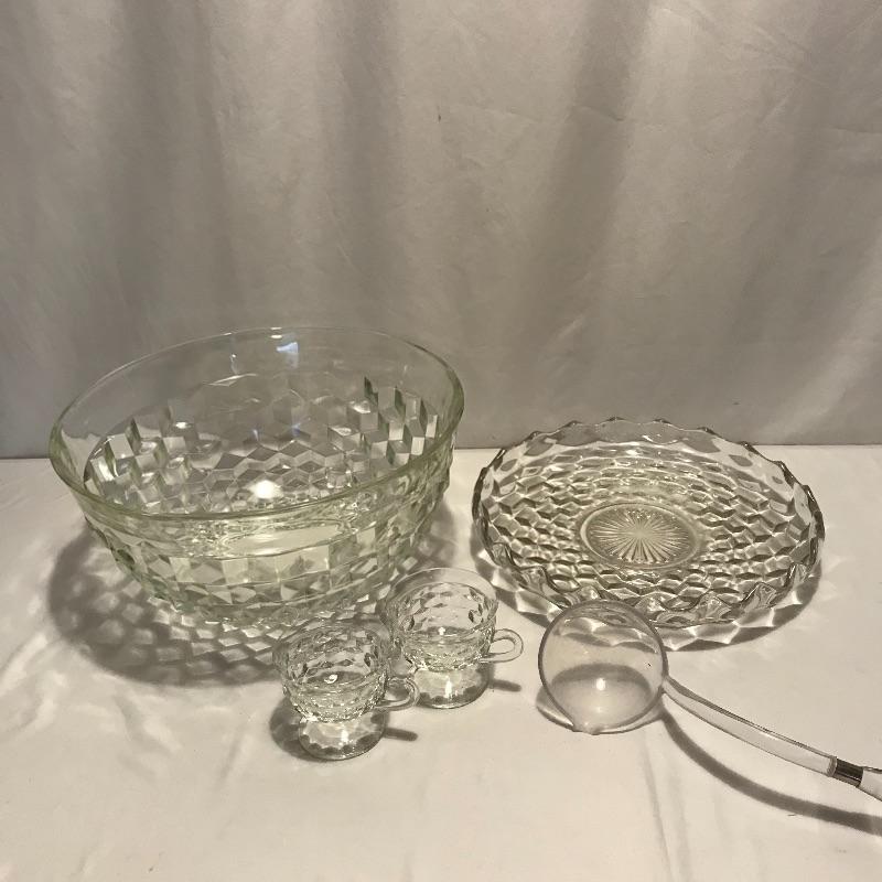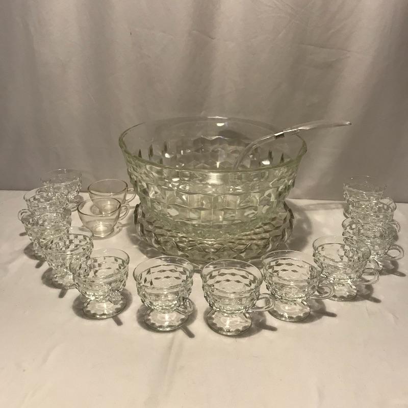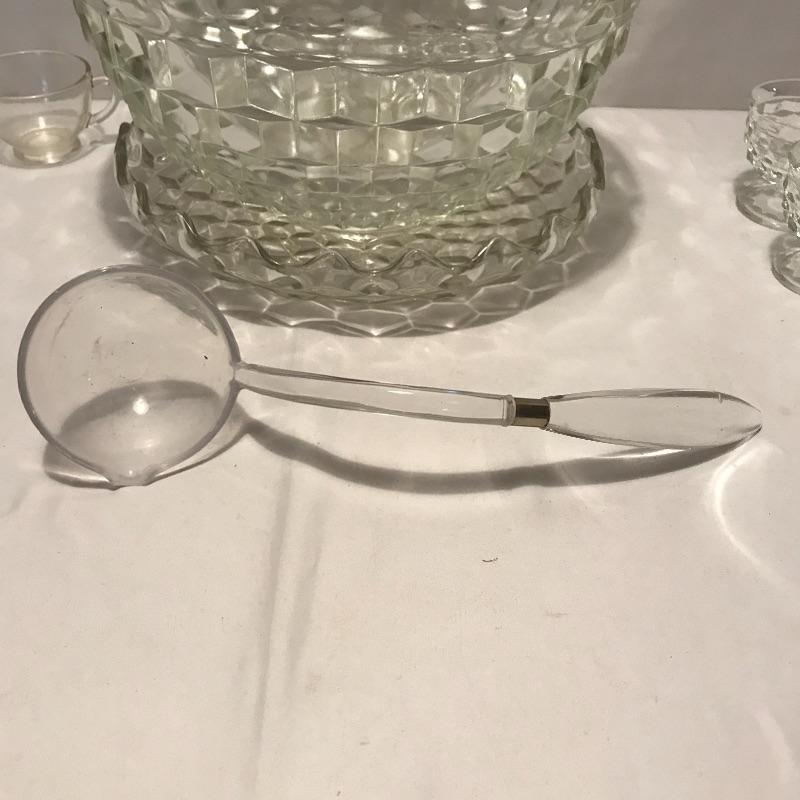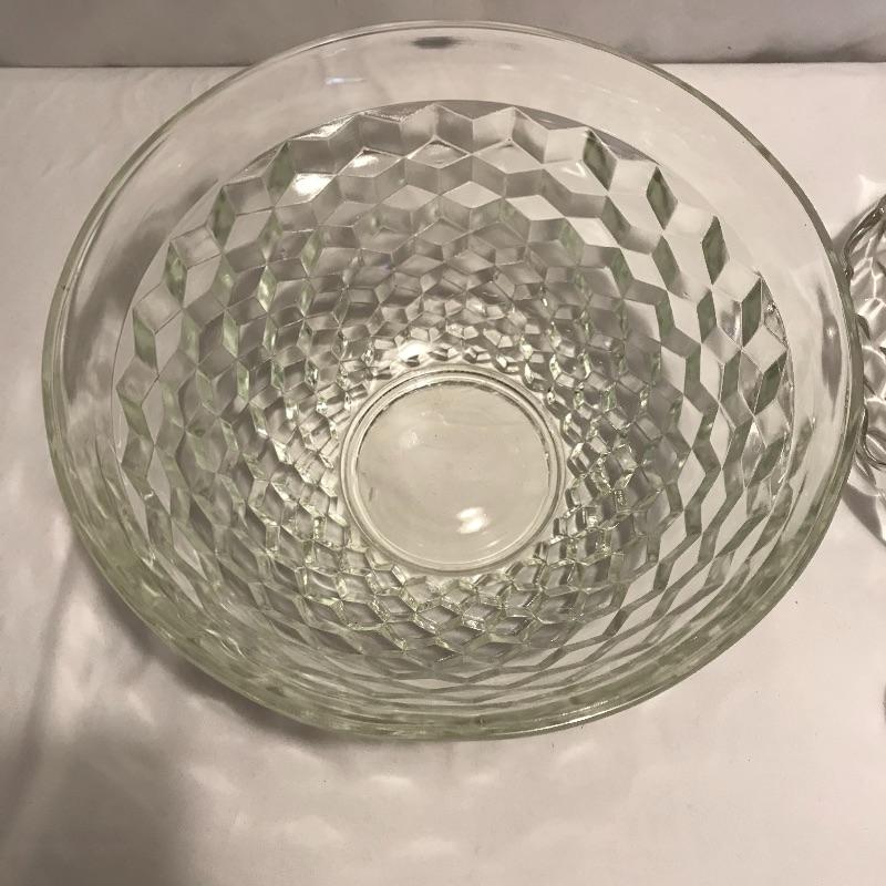 Why not celebrate in style once we’re allowed to celebrate again! Nice glass punch bowl and tray with a plastic serving spoon and twelve matching footed glasses.No manufacture marks on bottom. We’ve added two more glass mugs with a smooth texture for an extra friend or two. The large bowl is about 13.5”d x 7”. See photos and enjoy your punch! Local pick up only.