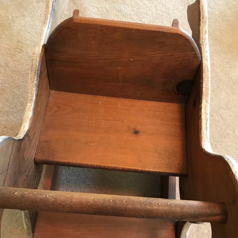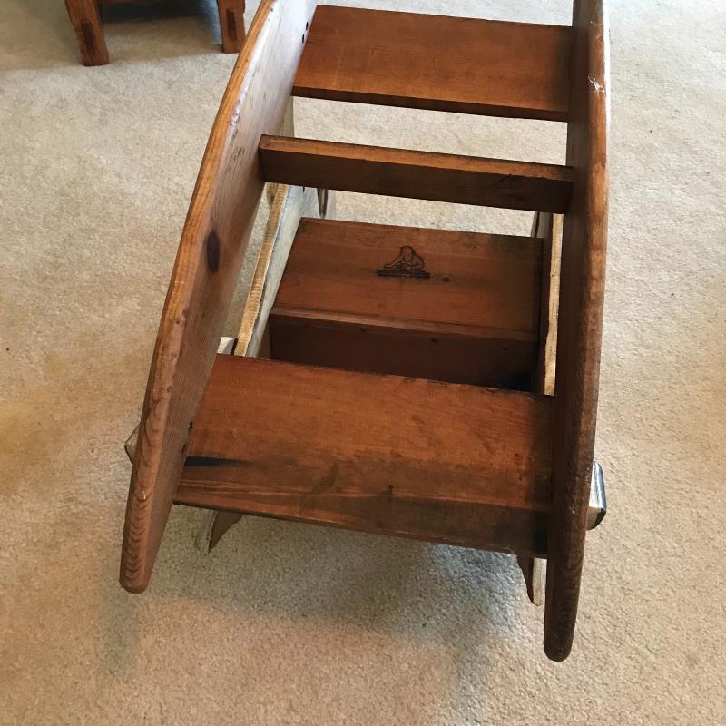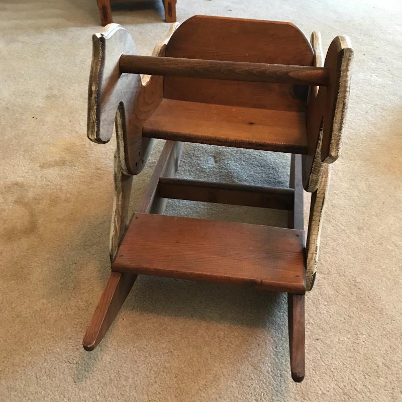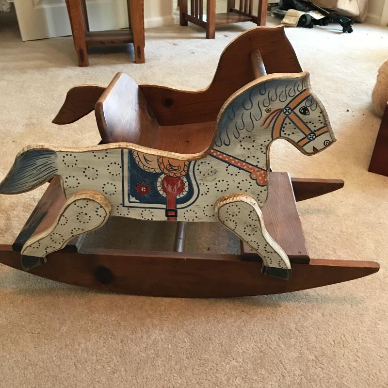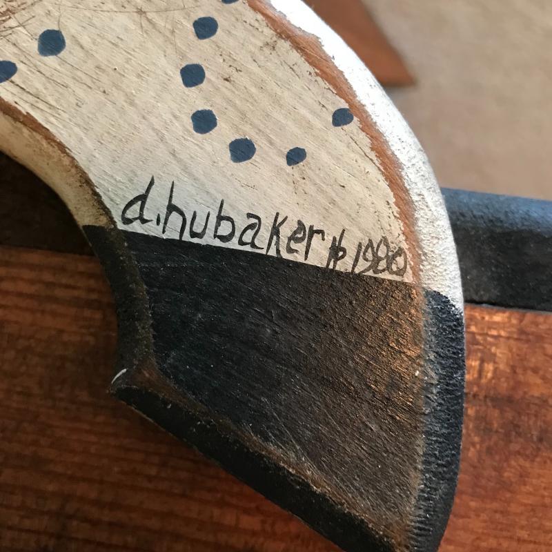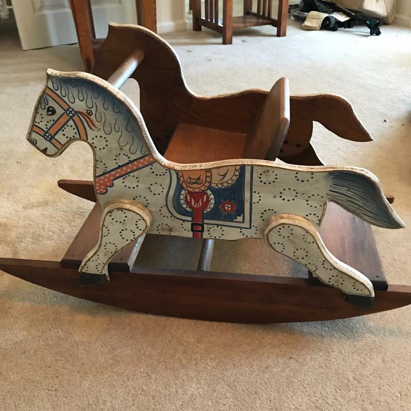 This hand-painted rocking horse is in good condition and very sturdy. Looks to have been built by Habersham Plantation and painted by D. Hubaker. Approx. 34”l x 13”w x 21”h.