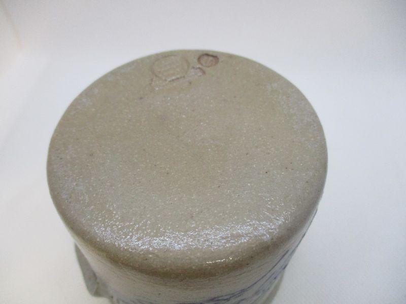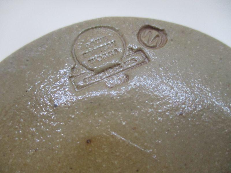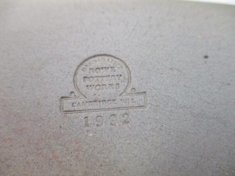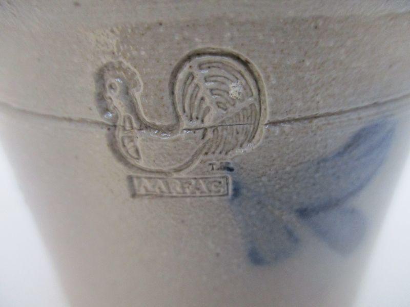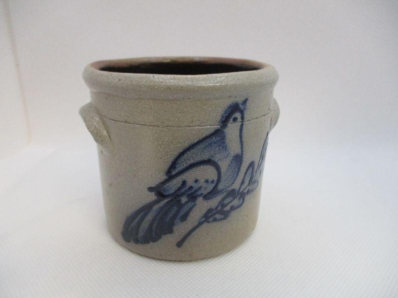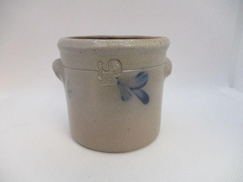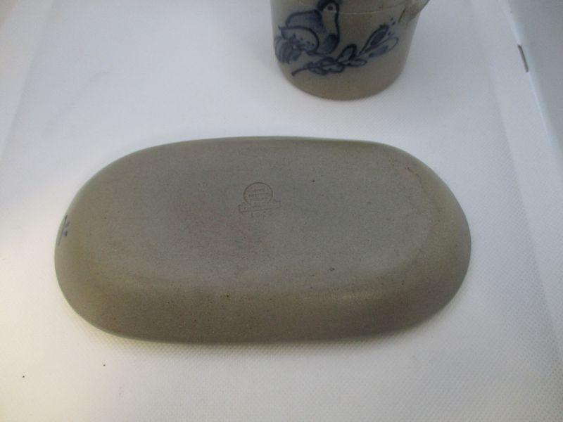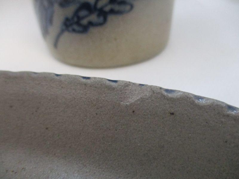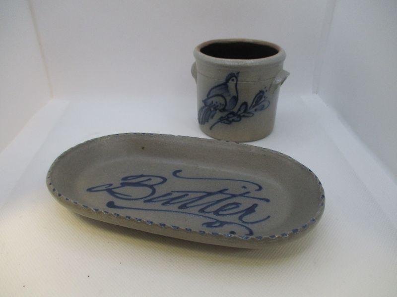 The crock is about 3" tall and the butter dish is 7.5" long and from 1992. The only issue found is the tiny flat chip on the edge of the butter dish.