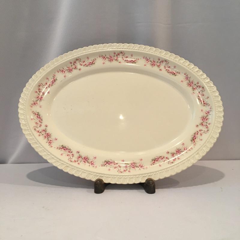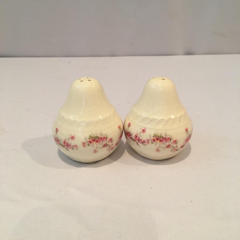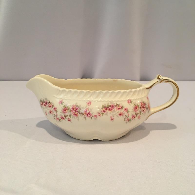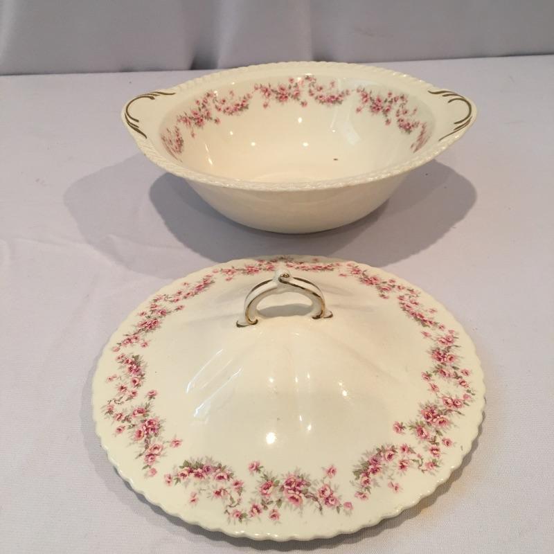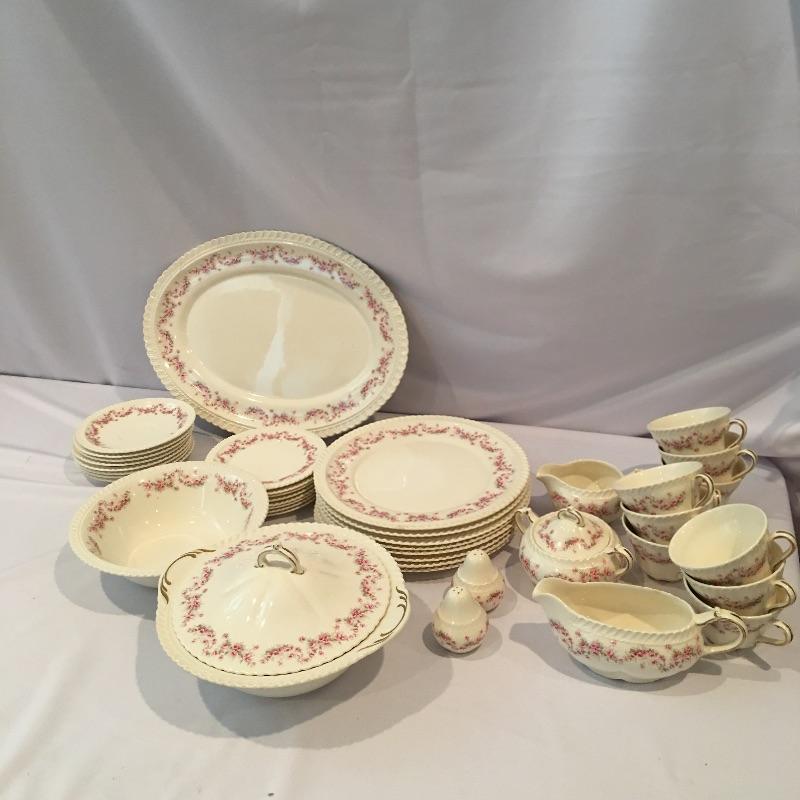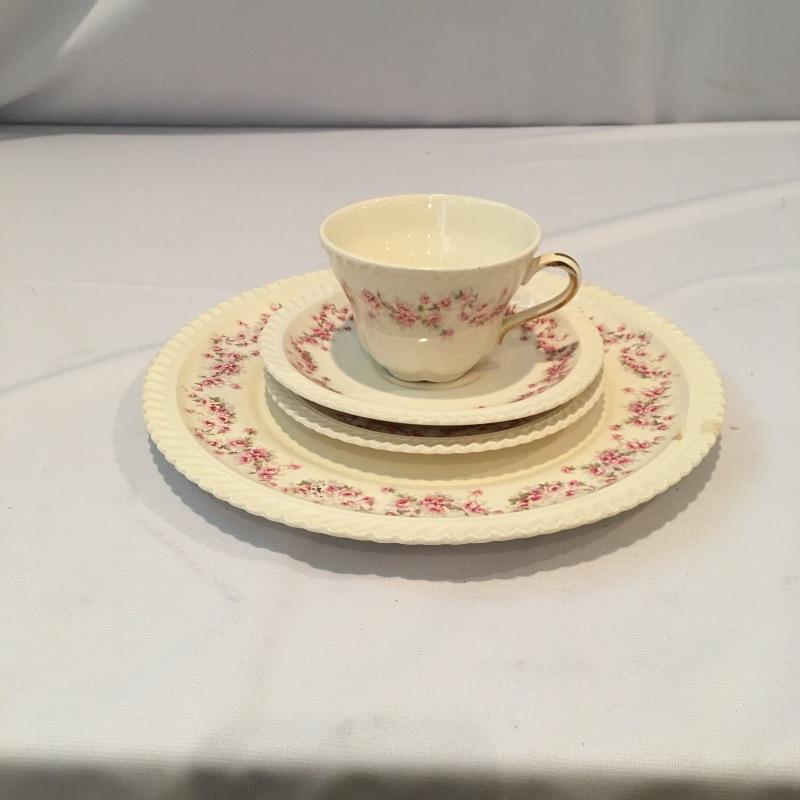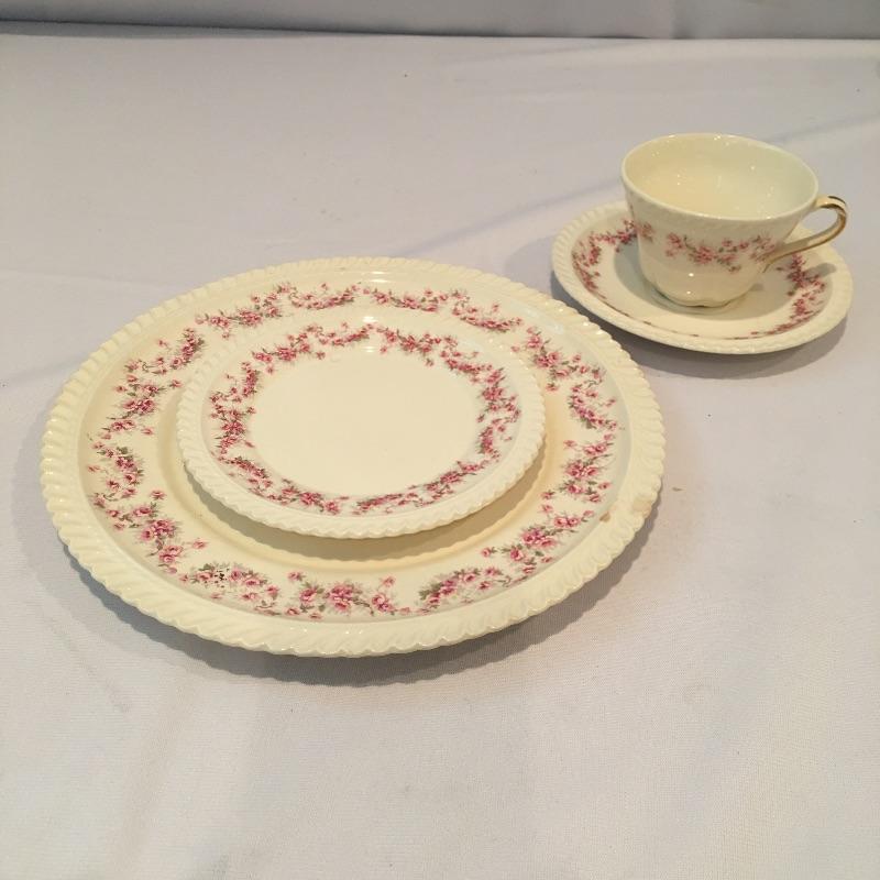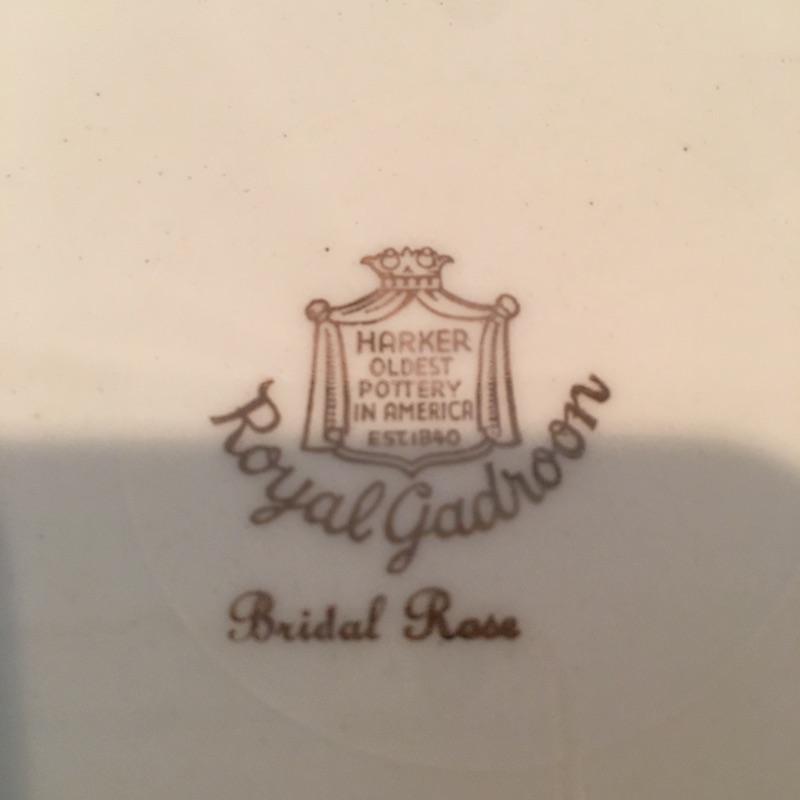 Royal Gadroon Bridal Rose pattern China includes four piece, eight place settings with platter,salt and pepper shakers, cream and sugar bowls, gray boat and two bowls with one lid. Beautiful China will make you smile every time you use it. Platter measures 11.75” x 16”.