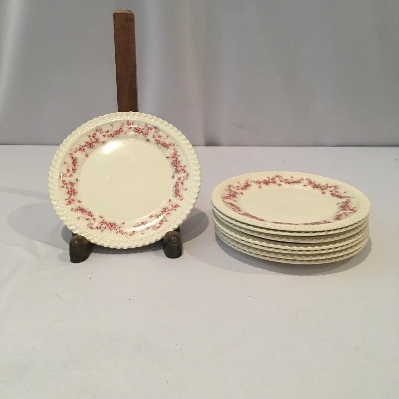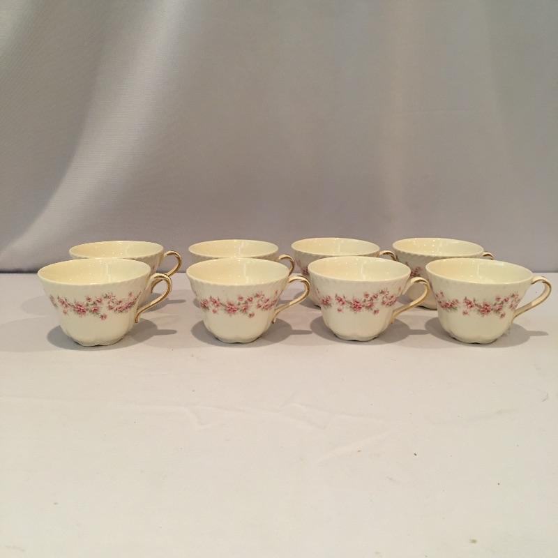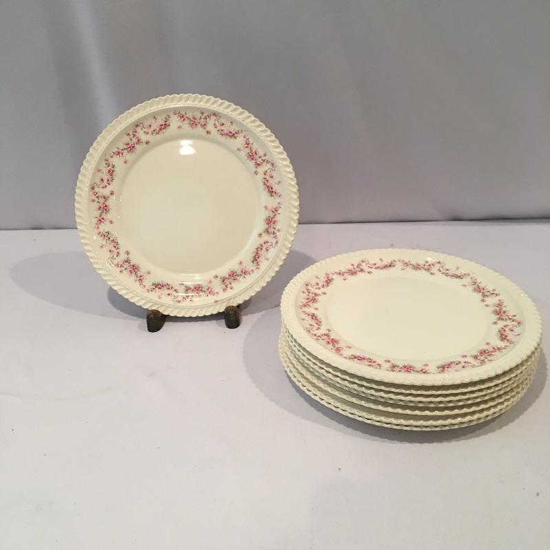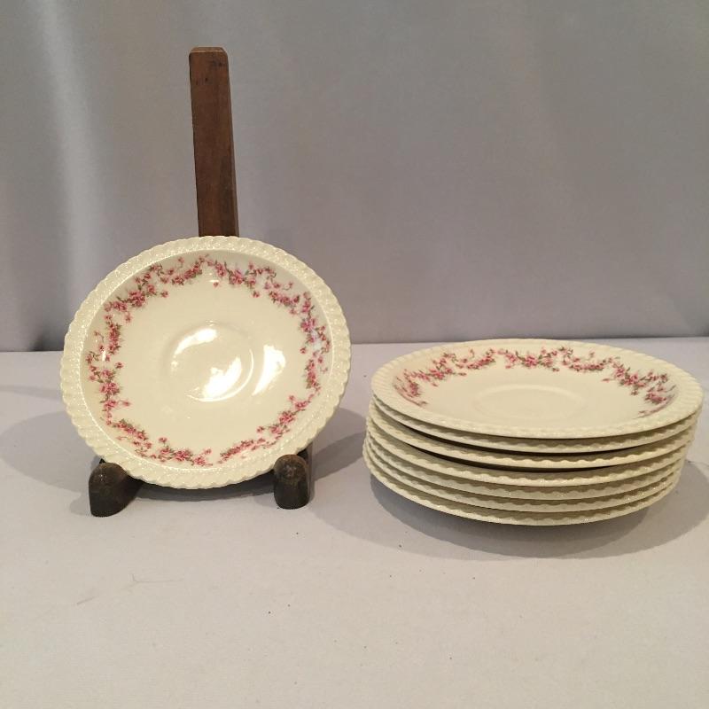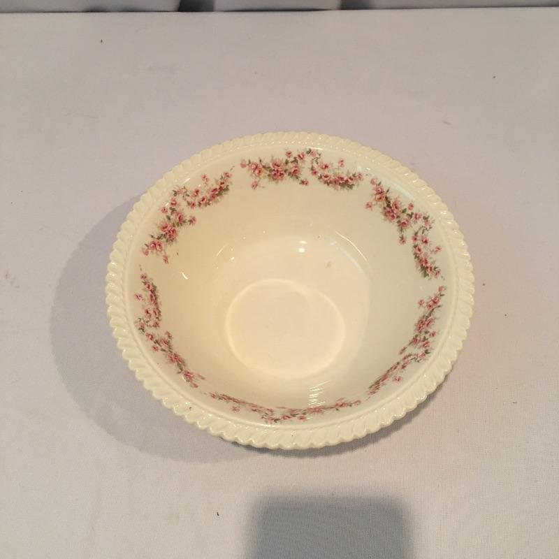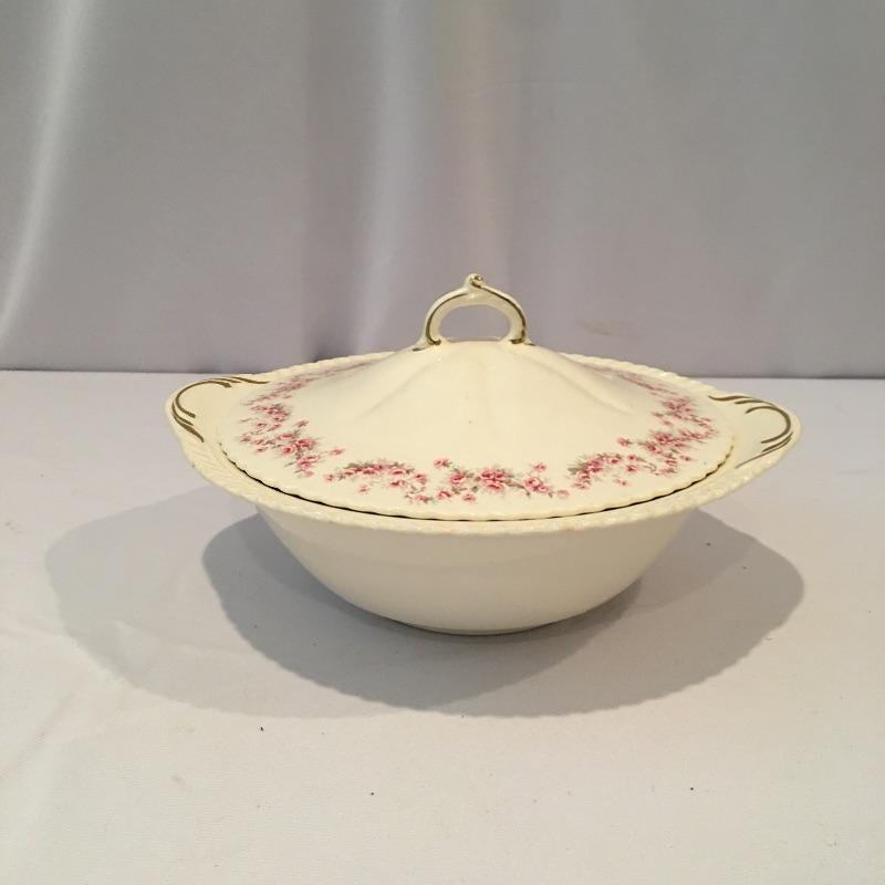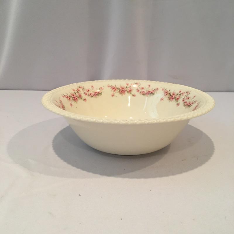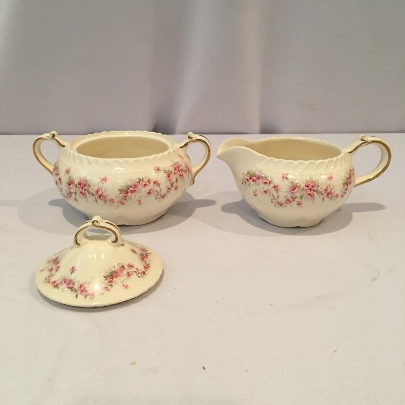Royal Gadroon Bridal Rose pattern China includes four piece, eight place settings with platter,salt and pepper shakers, cream and sugar bowls, gray boat and two bowls with one lid. Beautiful China will make you smile every time you use it. Platter measures 11.75” x 16”.