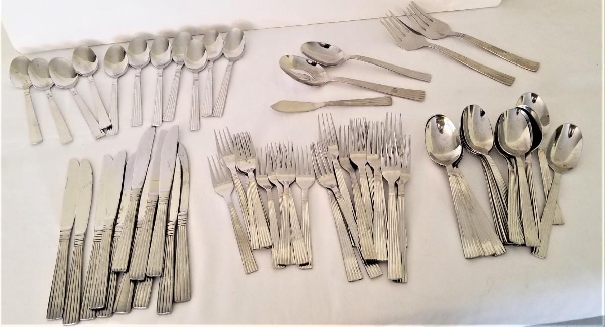 You get all you see here - Wallace Stainless - 12 knives, 11 salad forks, 11 dinner forks, 11 tablespoons, 1 serving spoon, 16 Tablespoons, 2 serving forks, 2 butter spreaders, 1 pierced serving spoon, 2 sugar spoons. All in gently used condition.