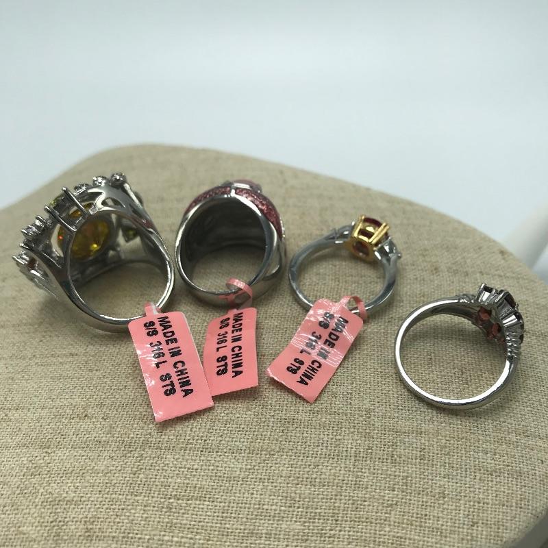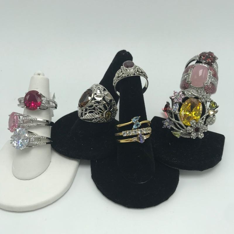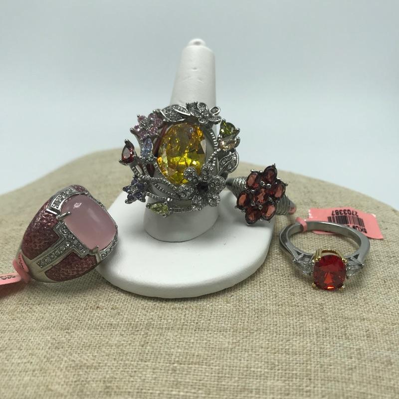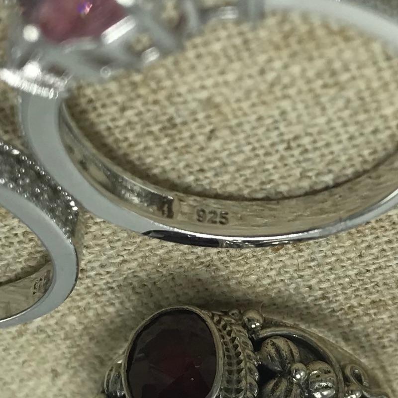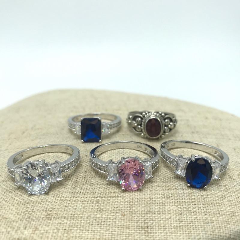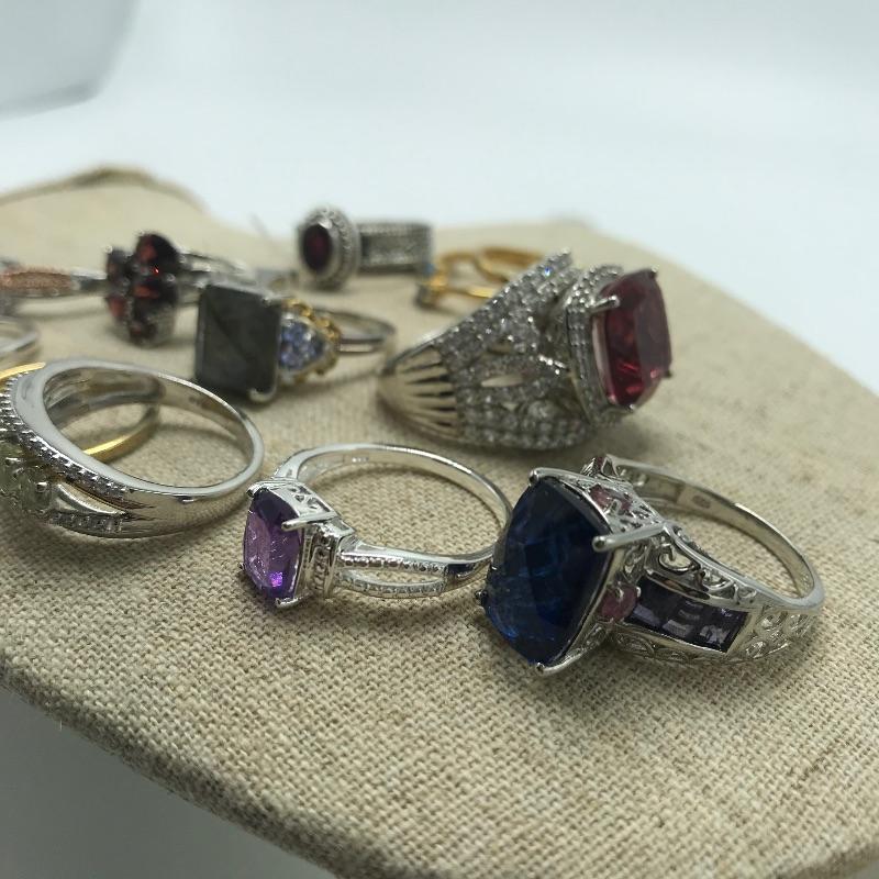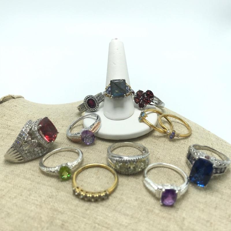 Huge selection of sparkling rings sized around 10-10.5. These rings dazzle with gems that look like amethyst, ruby, quartz and more! Bright and pale gems for everyday and occasional use. See photos, one image has rings separated by markings.