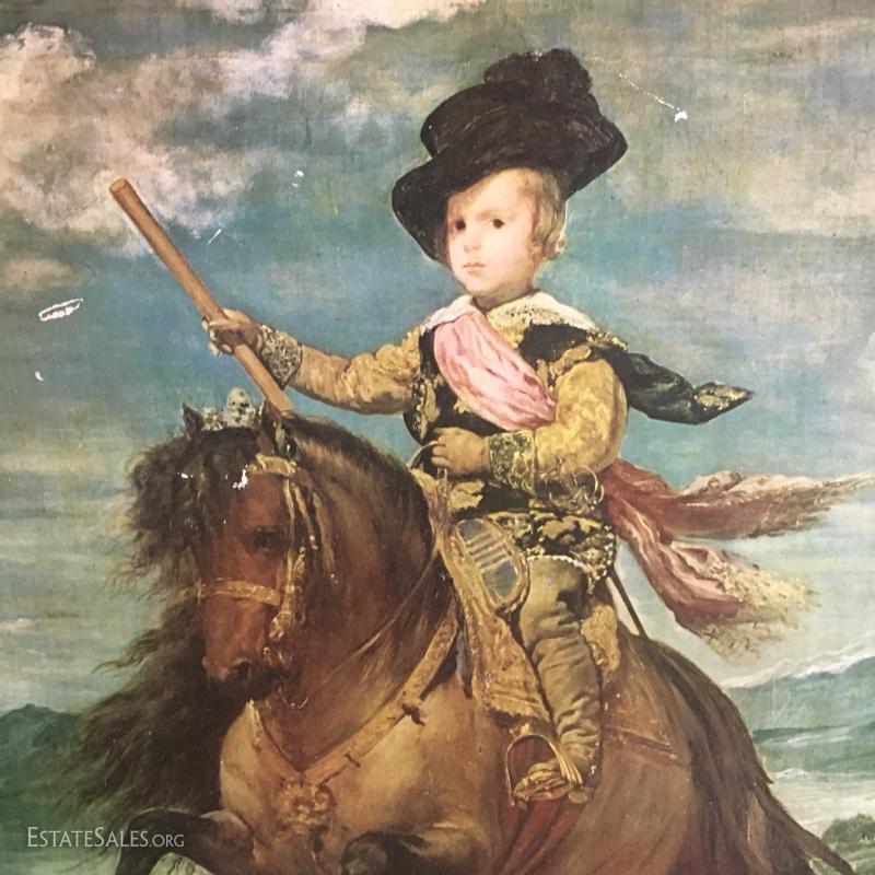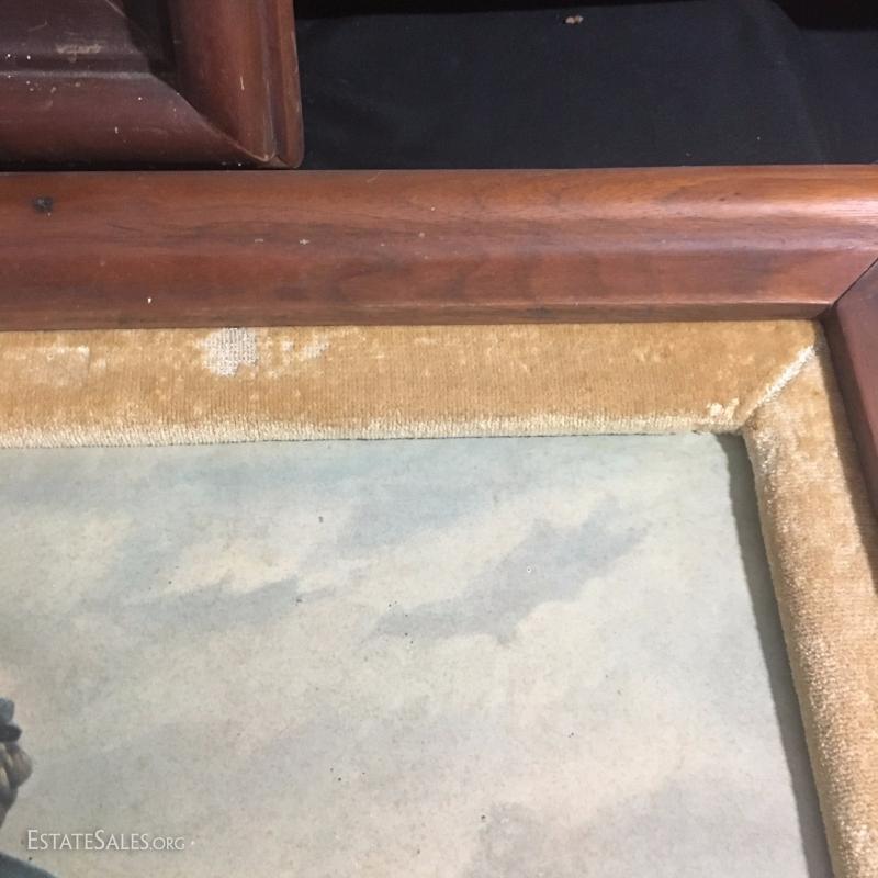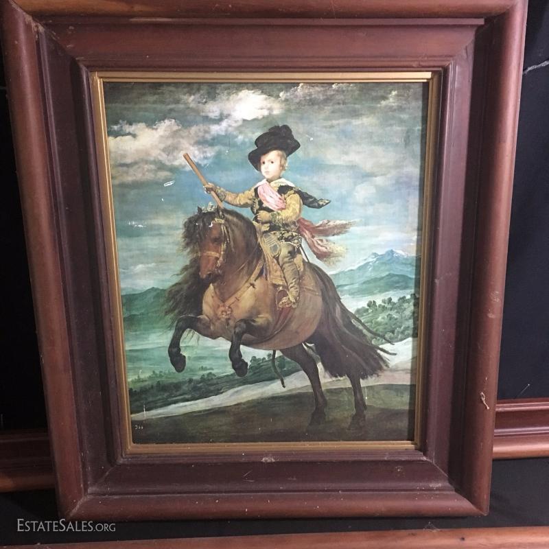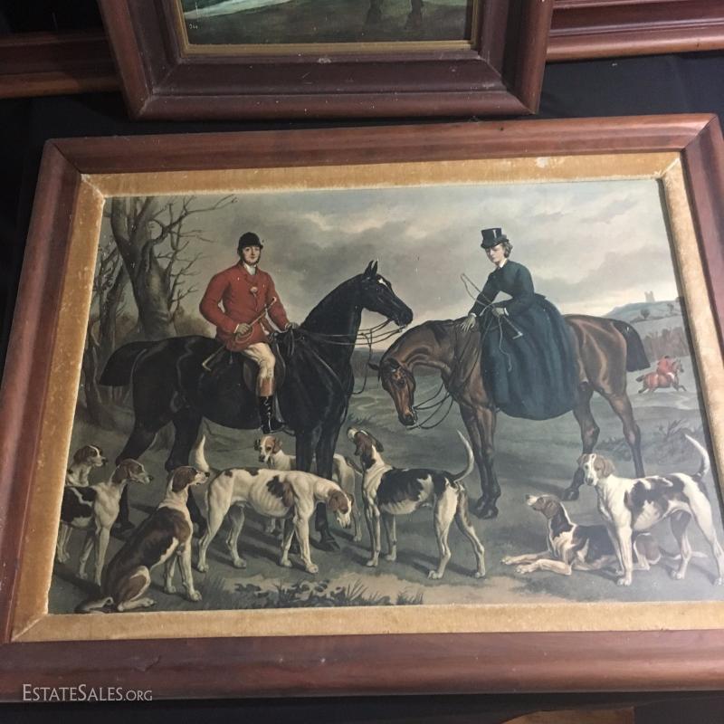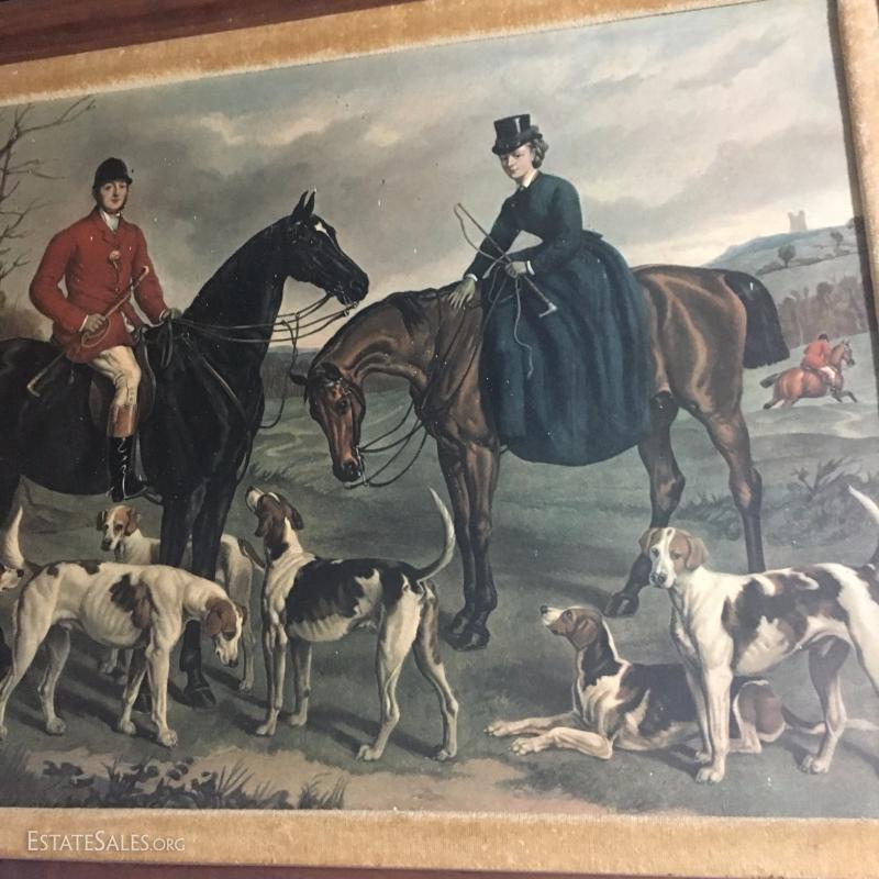 Boy on horse 25"l x 22"w. Hunting scene is 33.5"l x 26"w. Large wooden frame is 51.5"l x 36"w