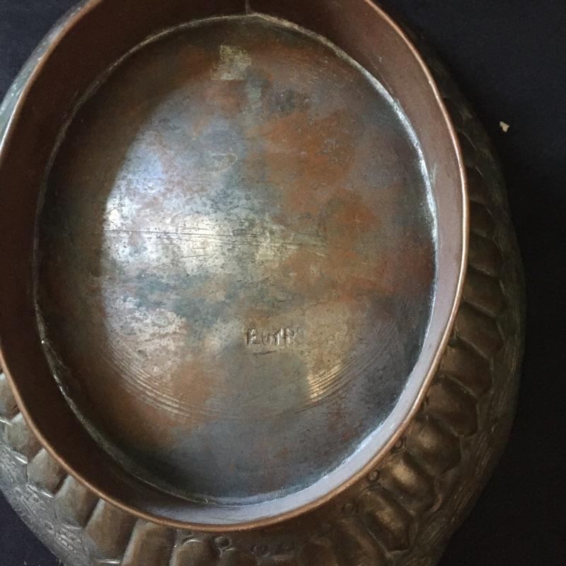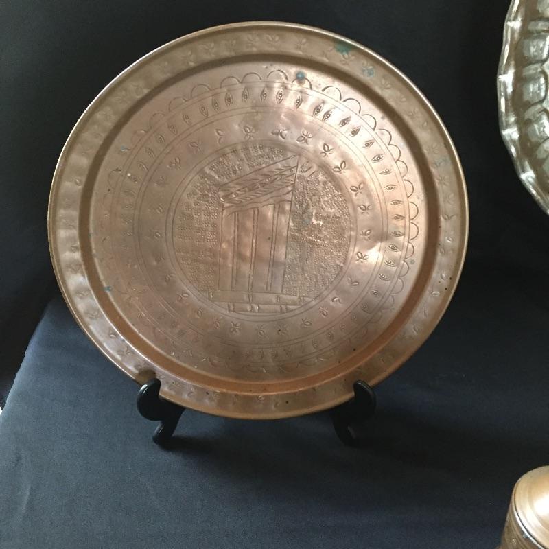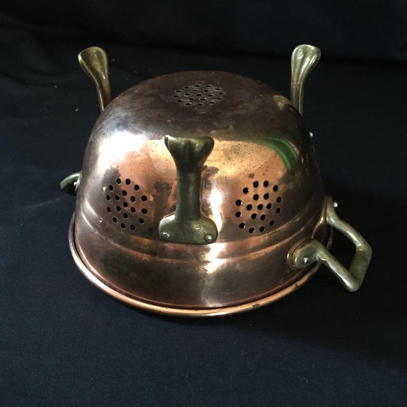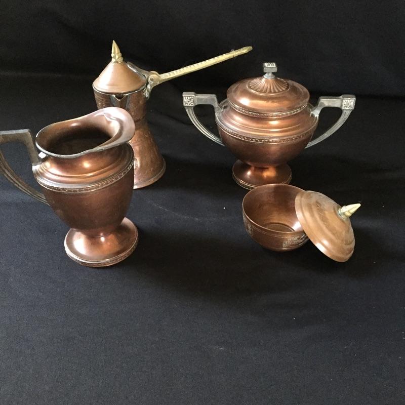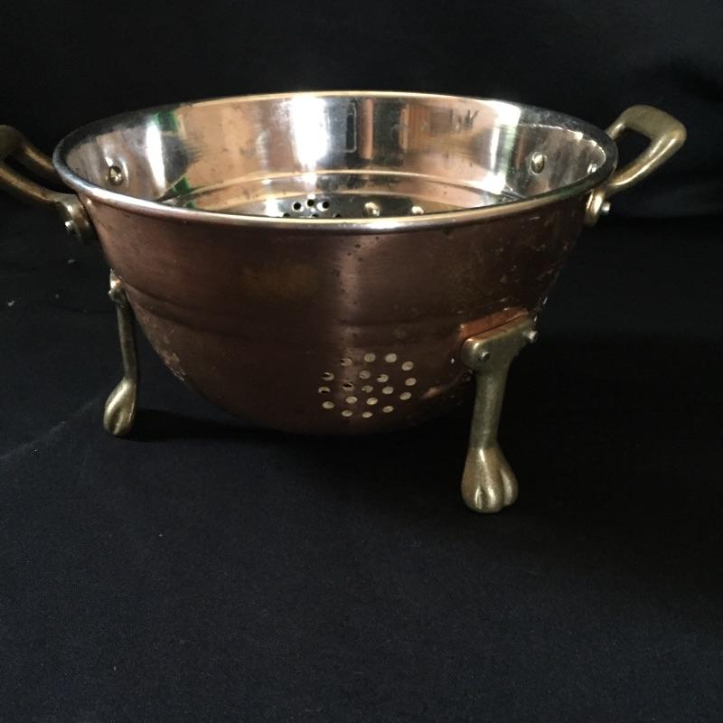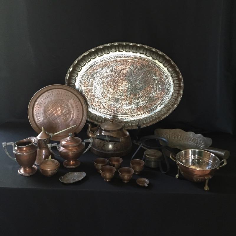 This varied assortment of vintage copper includes large tray, smaller tray, old fashioned kettle, fondue base, bowl with handle, colander with brass handles and feet, 5 small cups, pitcher, jug, small lidded bowl, larger lidded bowl with handles and a small flat bowl.