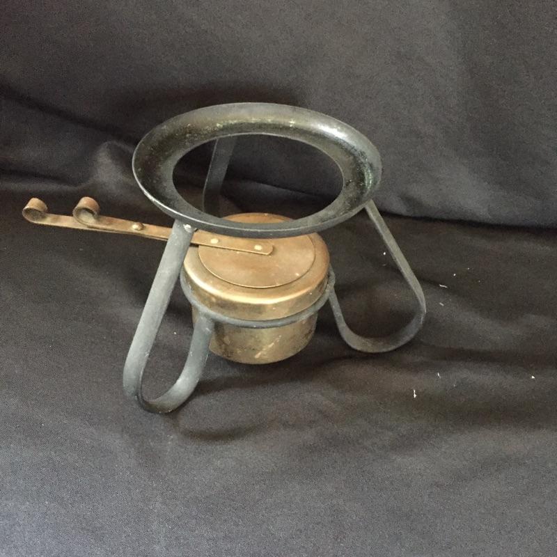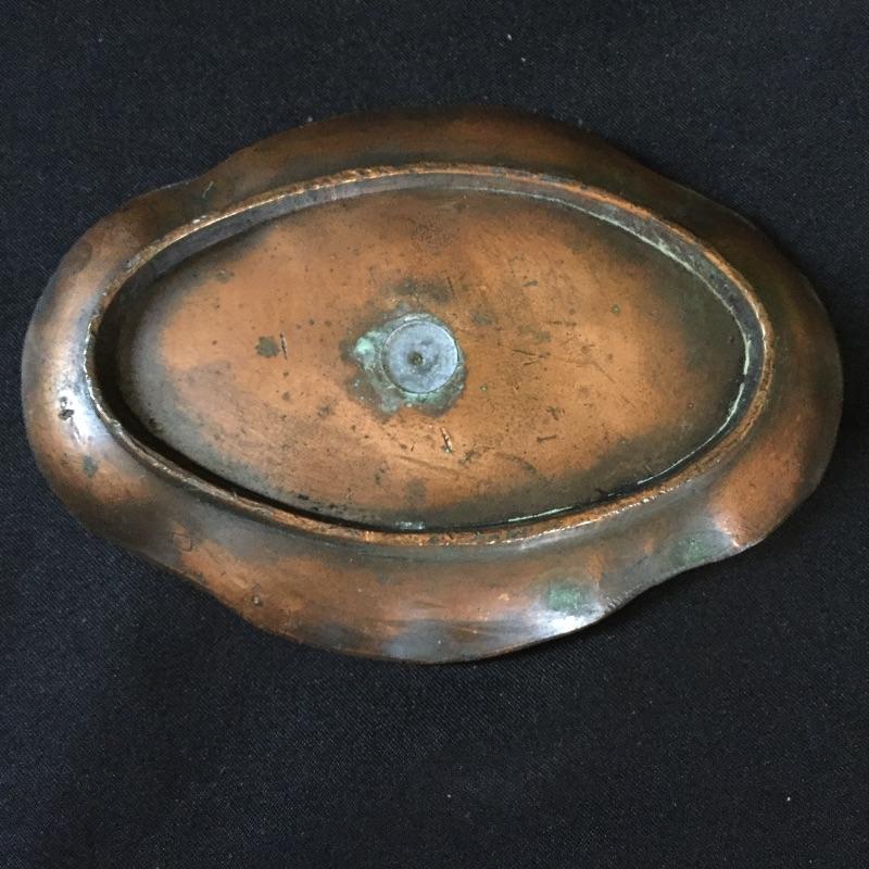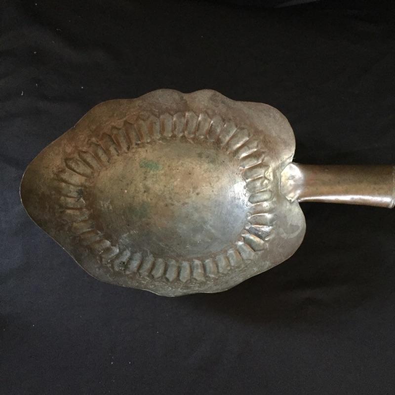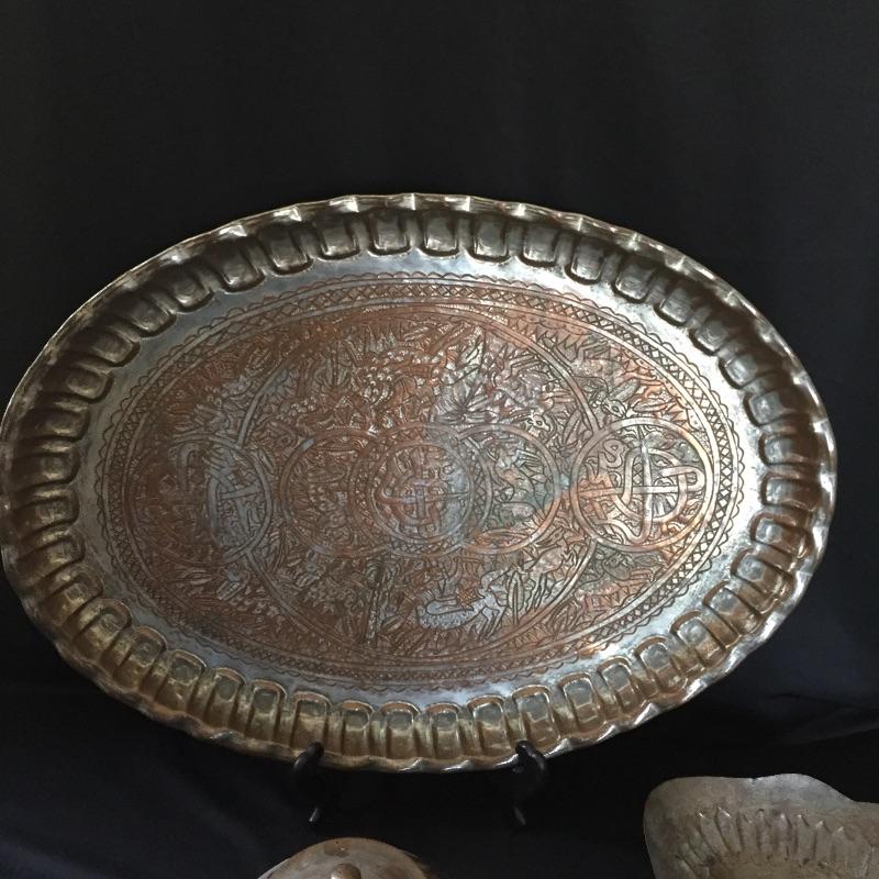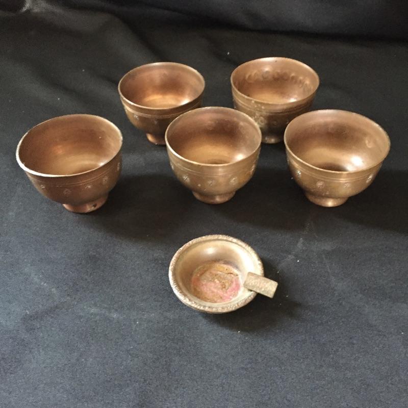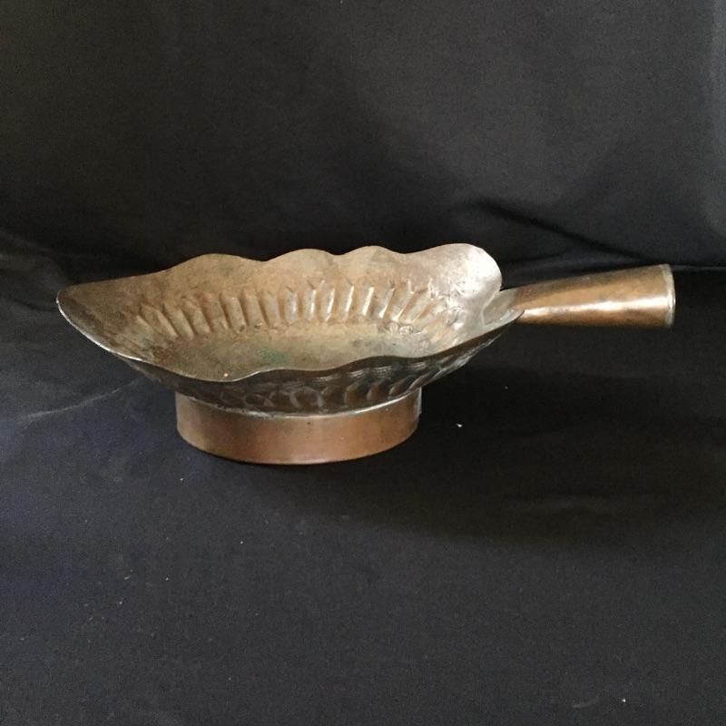 This varied assortment of vintage copper includes large tray, smaller tray, old fashioned kettle, fondue base, bowl with handle, colander with brass handles and feet, 5 small cups, pitcher, jug, small lidded bowl, larger lidded bowl with handles and a small flat bowl.