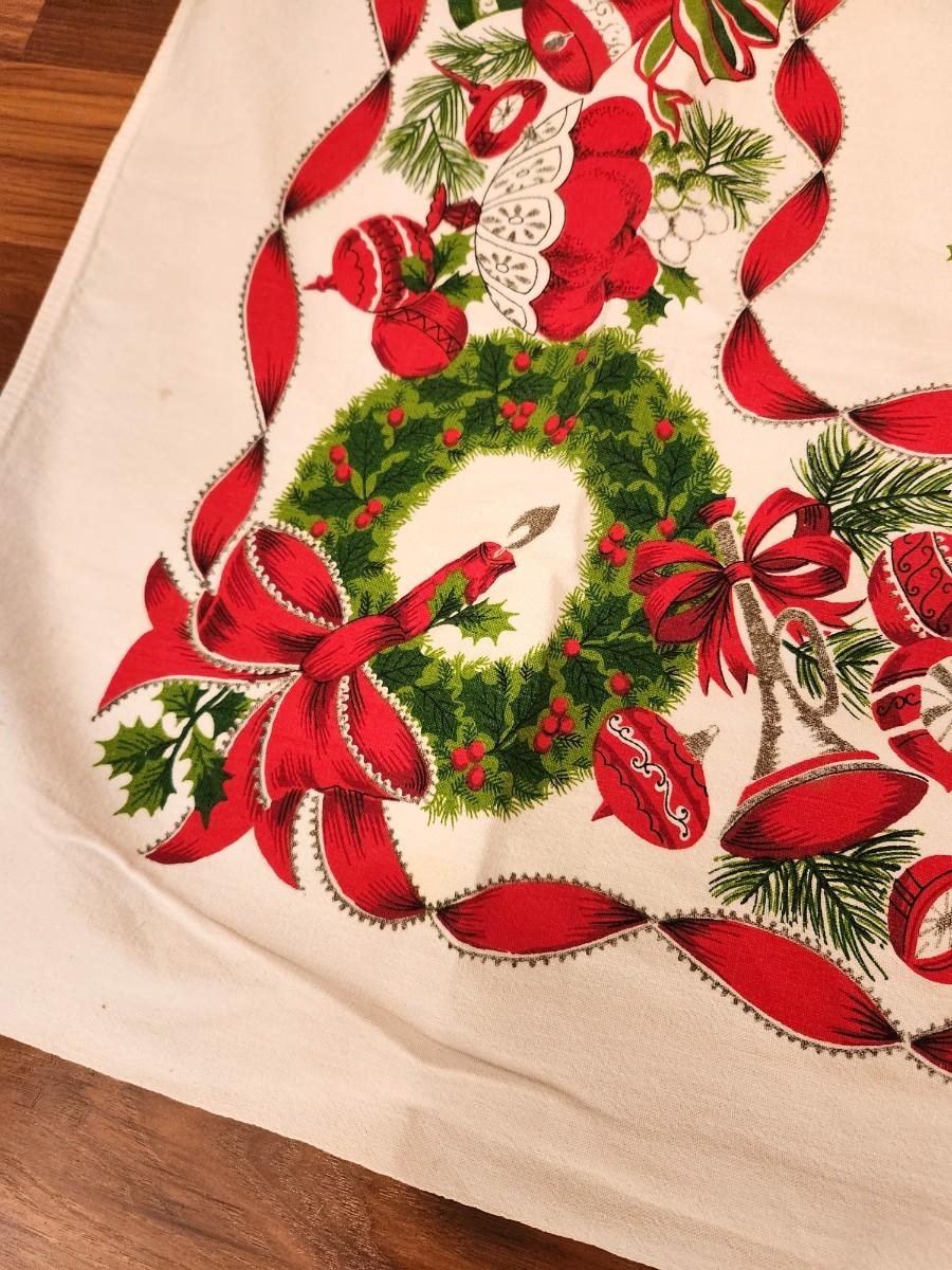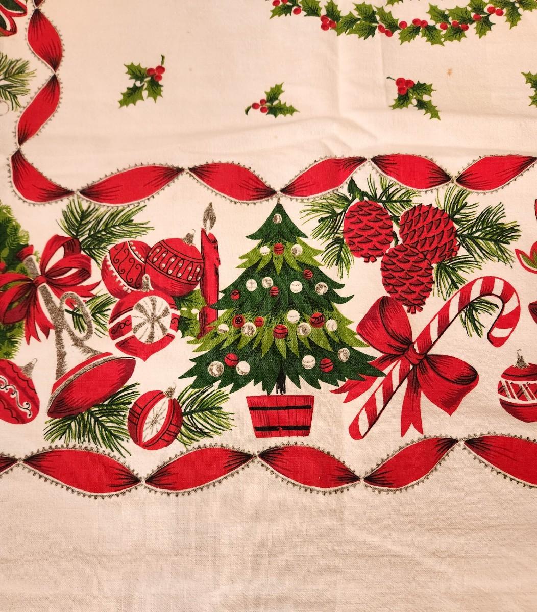 Trees/Bells/Candles/candy canes - this one has it all! Great vintage cotton Christmas tablecloth - midcentury. 45" x 48". 1 very small stain (as shown).