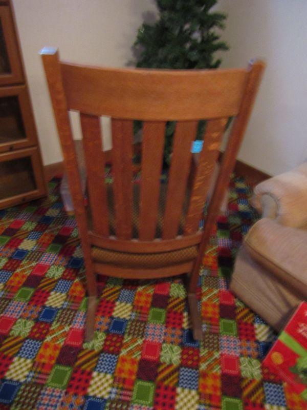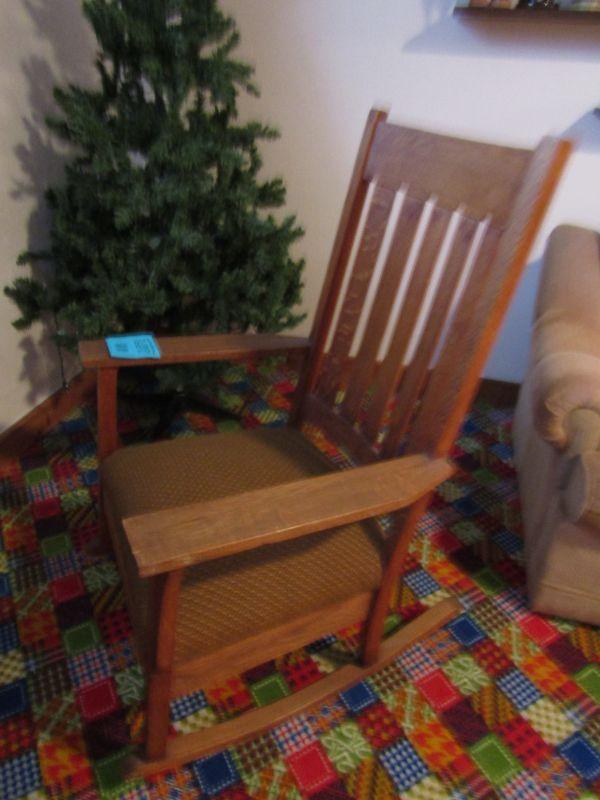 SOLID WOOD ROCKING CHAIR WITH UPHOLSTERED SEAT (HAS A BURN MARK FROM CIGARETTE?)