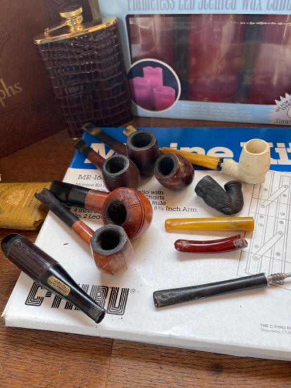 Lot 96. Electric candles, vintage tin cars, framed art, vintage tobacco pipes, crocodile flask, leather photo album, vanilla scent oil diffuser, View Master wood box, marine drafting kit, 2 Asian teapots--$35