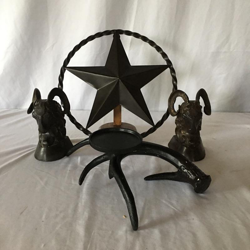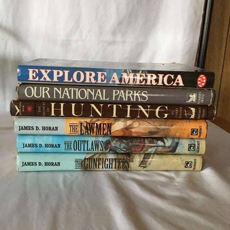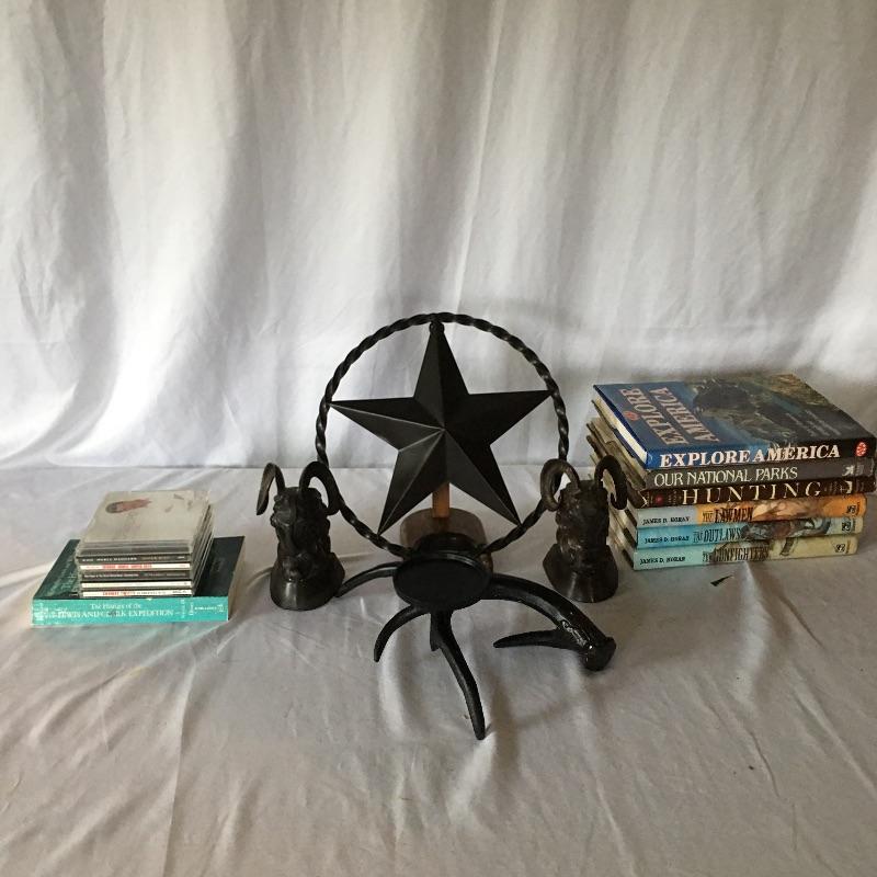 A great lot for the western fan in your life. Lot includes metal star wall decor, pair of metal ram bookends, metal antler candle holder, CDs by Merle Haggard, George Jones, Conway Twitty and more. Also includes three James D. Hiram books, Lewis and Clark Expedition book, hunting book, Our National Parks book and Explore America book.
