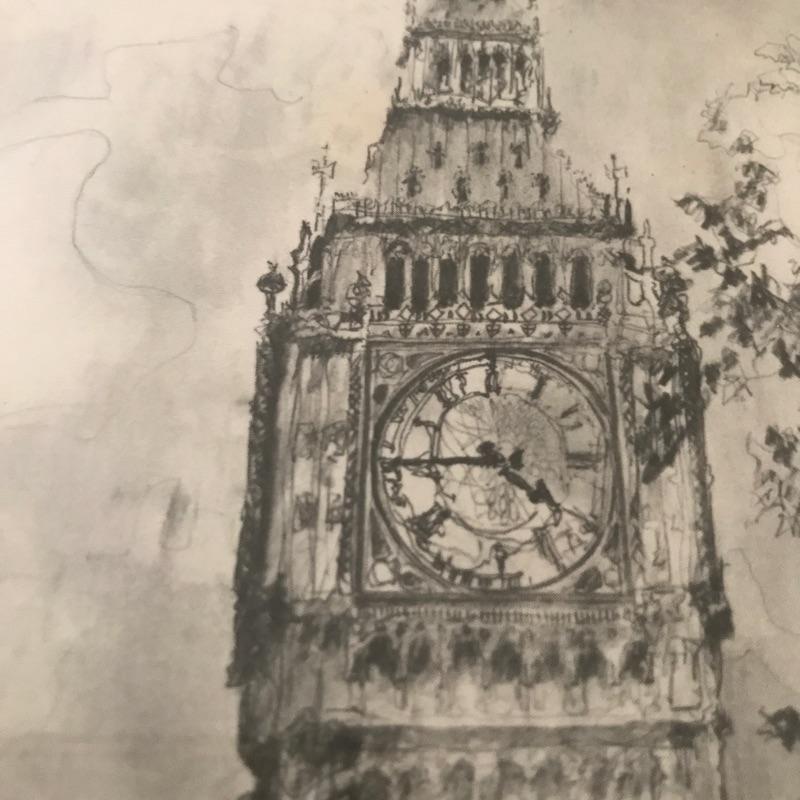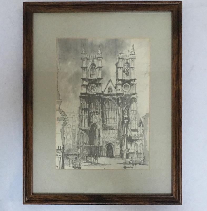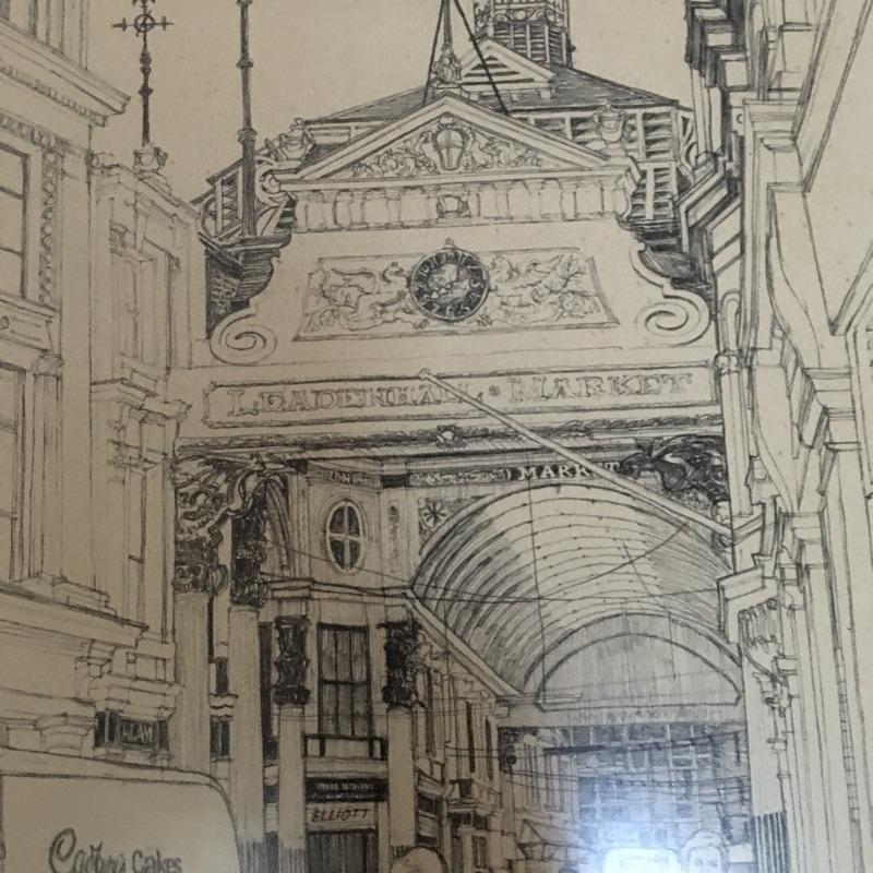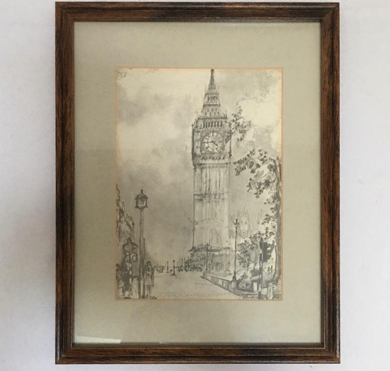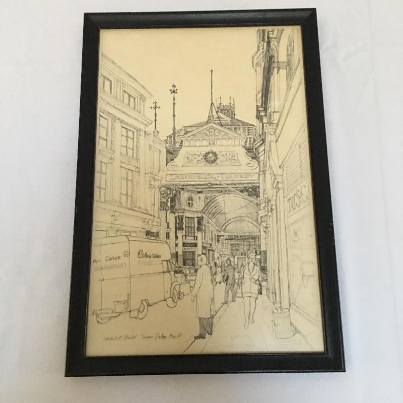 Two pieces of framed pencil drawing prints depicting Big Ben and Westminster by W.J. Maskell. The larger picture is by Tenme Dalley titled Leadenhall Market. Here’s your chance to bring London landmarks into your home. Largest frame measures 11.5” x 17”.