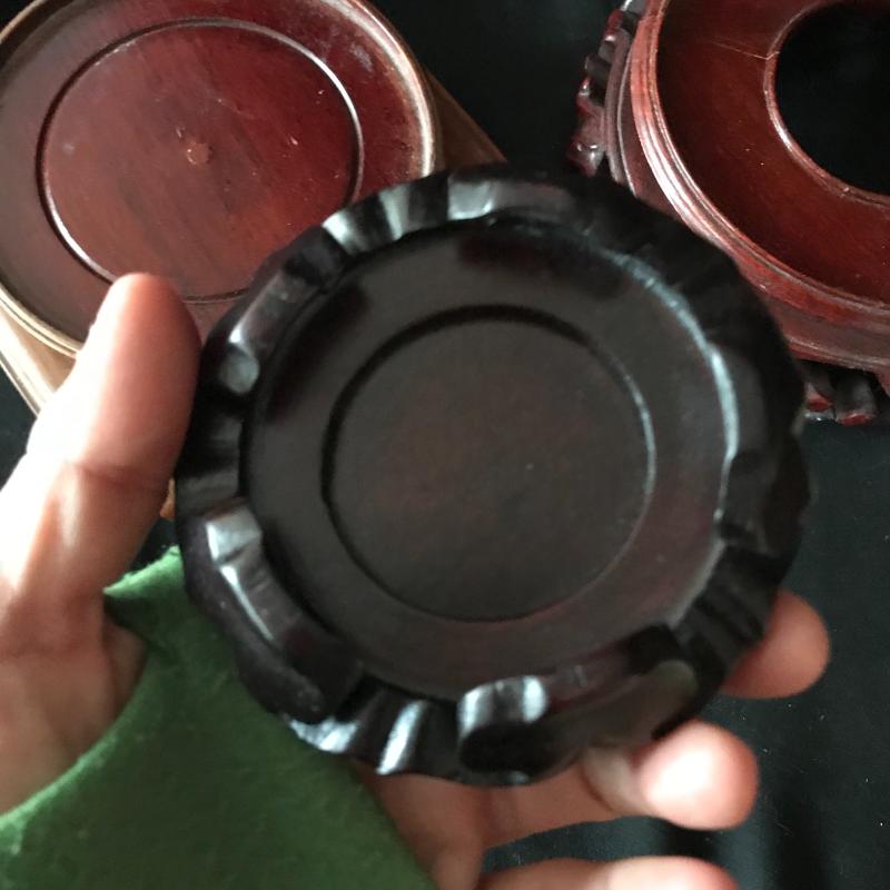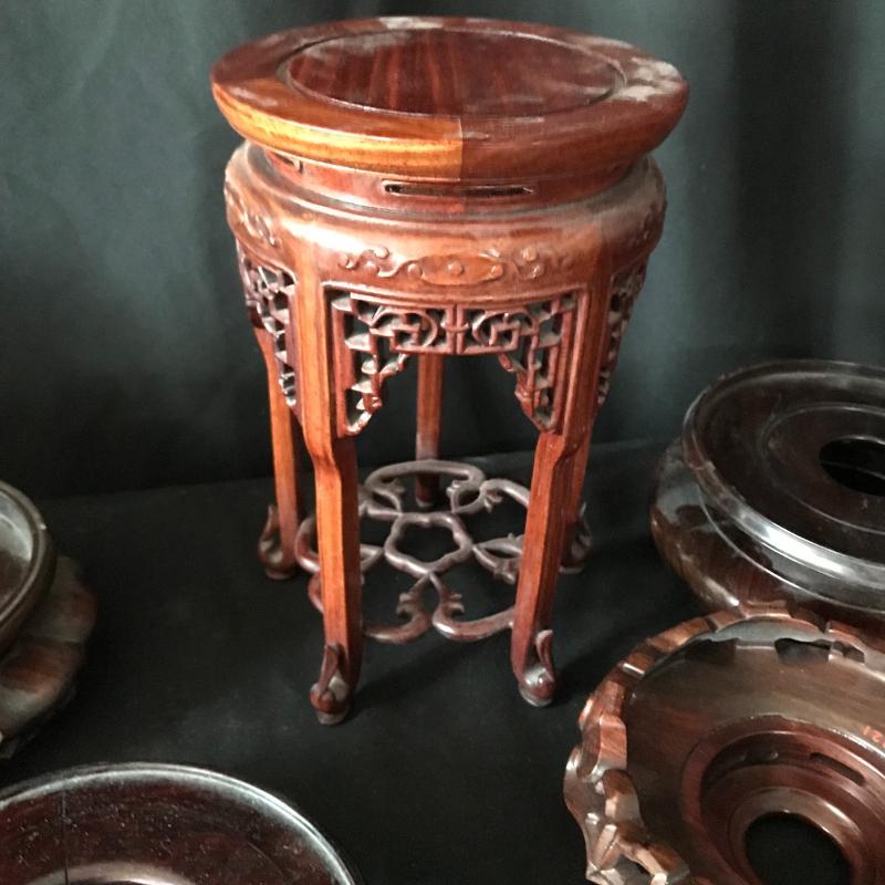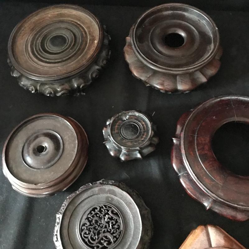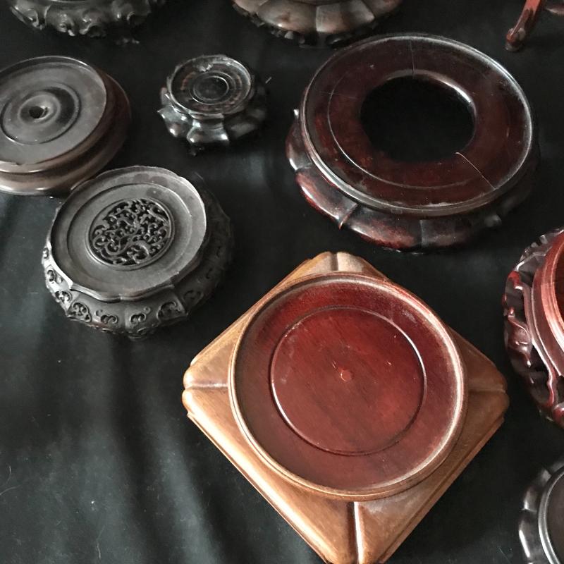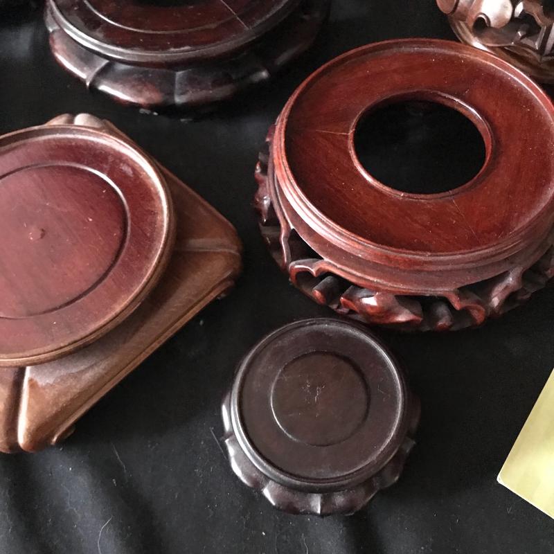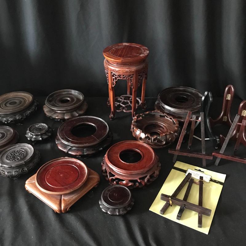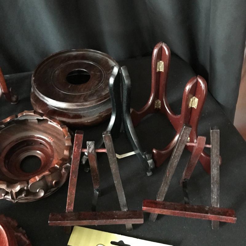 Lot includes 12 wood bases for candles and/or collectibles, and 6 display stands for art and/or plates, etc. Largest base is approx. 7.5” in diameter. Shipping available.