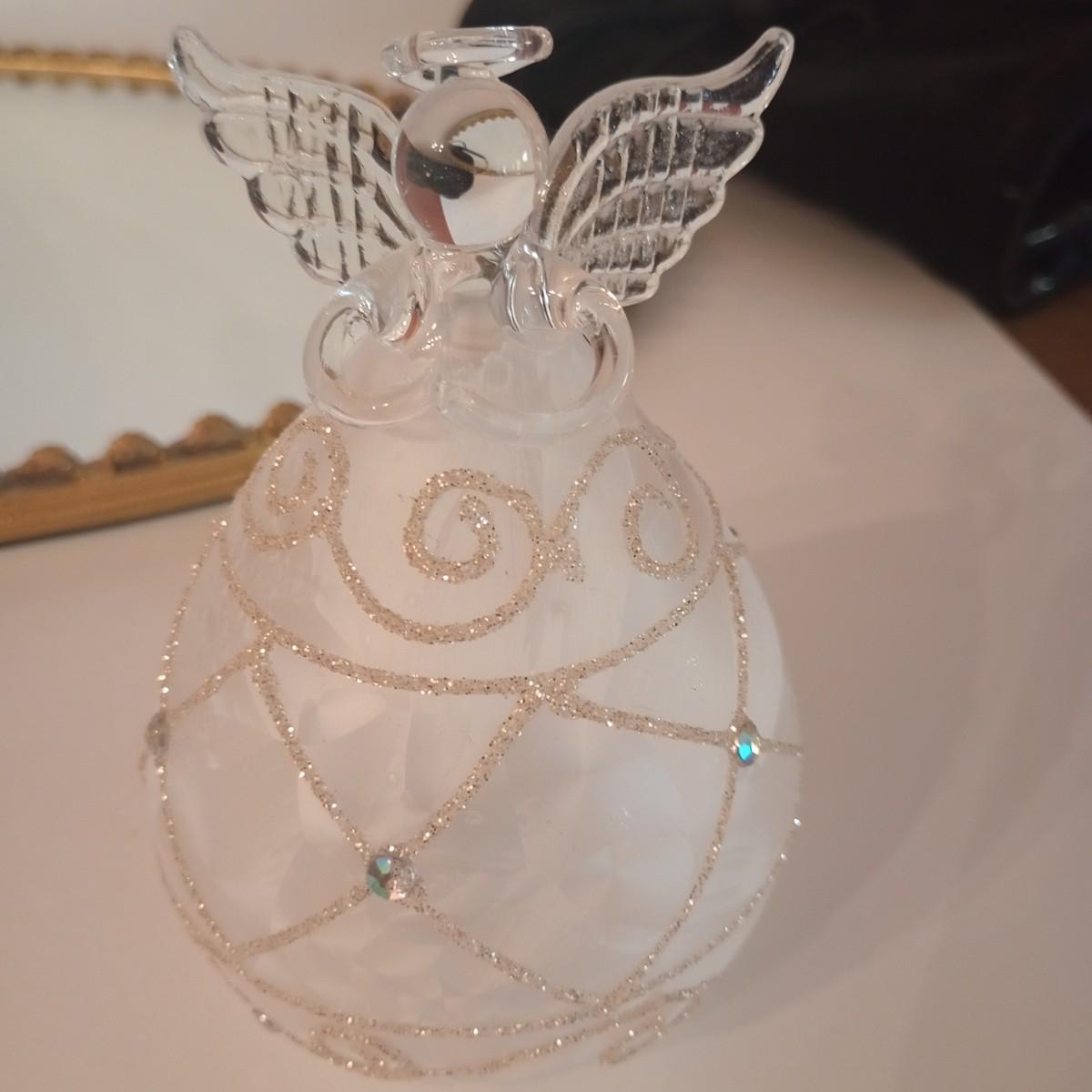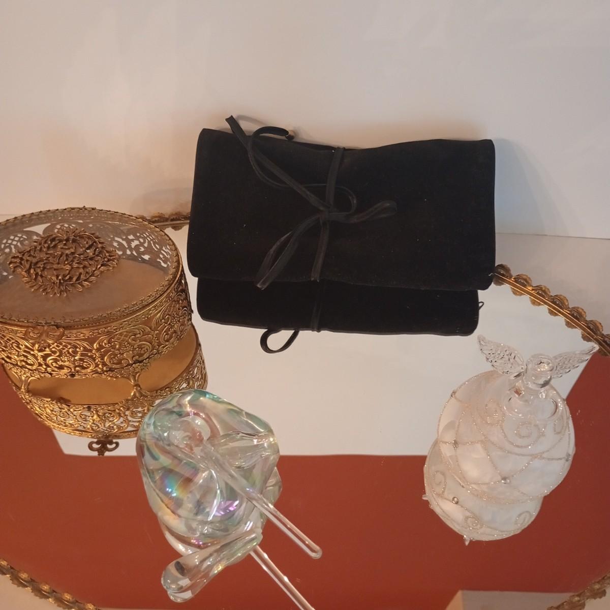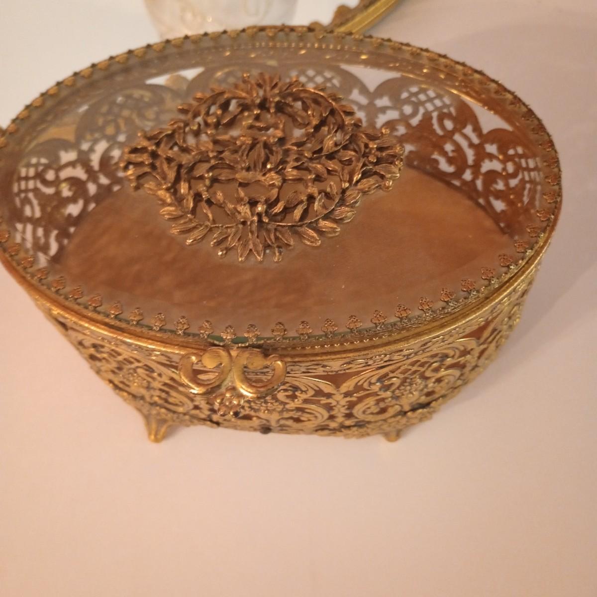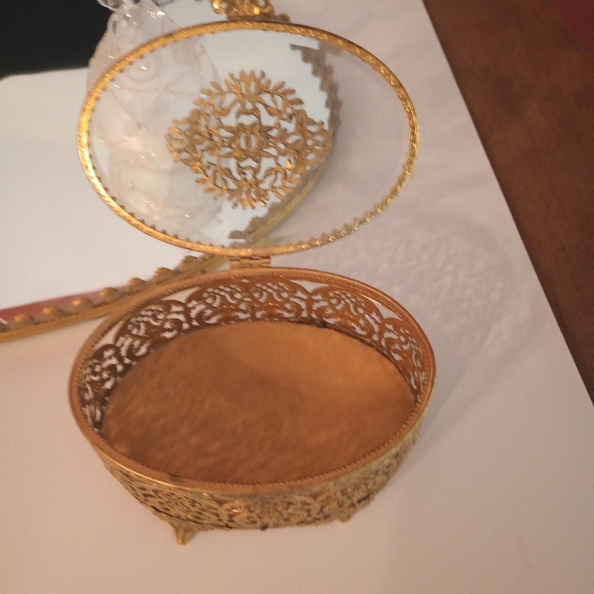 LOT 13D: Vanity Mirror Tray, Glass Perfume Bottle, Gold Trinket Box, Glass Angel w/ Light and Jewelry Pouch