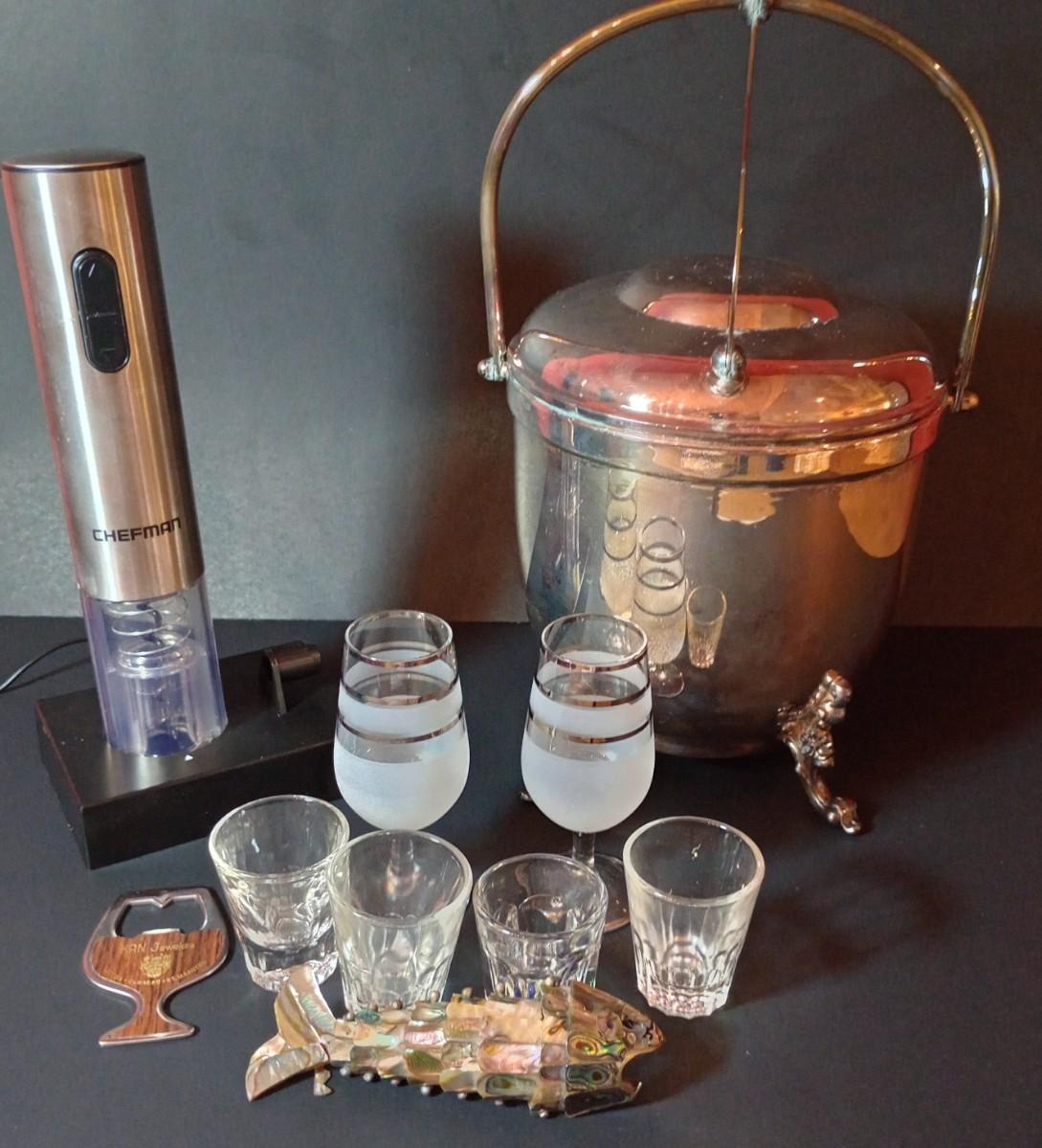 LOT 17D: Bar Supplies- Electric Wine Bottle Opener, Shot Glasses, Silver Plated Ice Bucket, Fish Bottle Opener Made from Shells and More