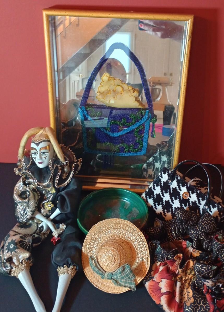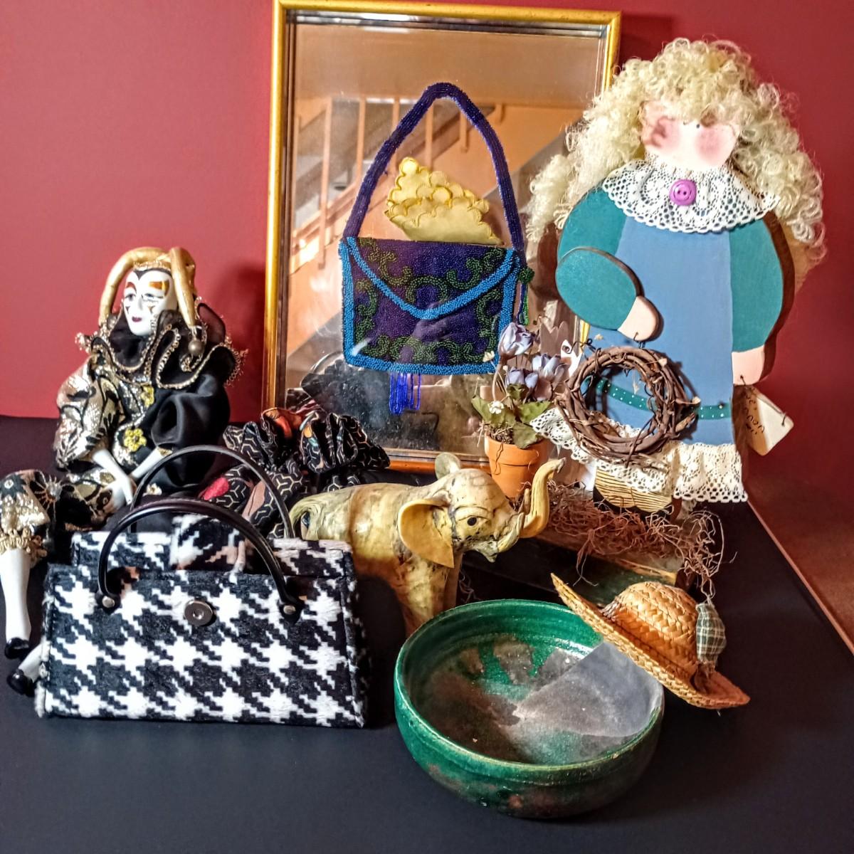 LOT 25D: Home Decor-Pocketbook Mirror, Small Black and White Purse, Ashtray, Makeup Pouch and More