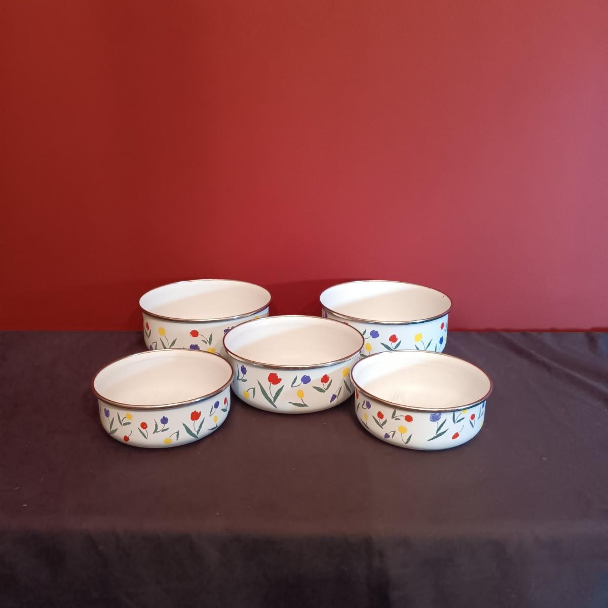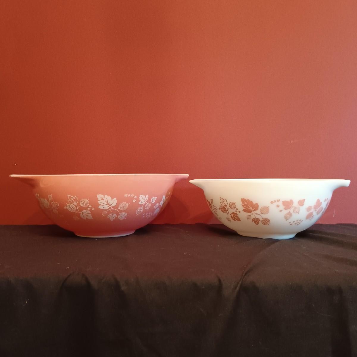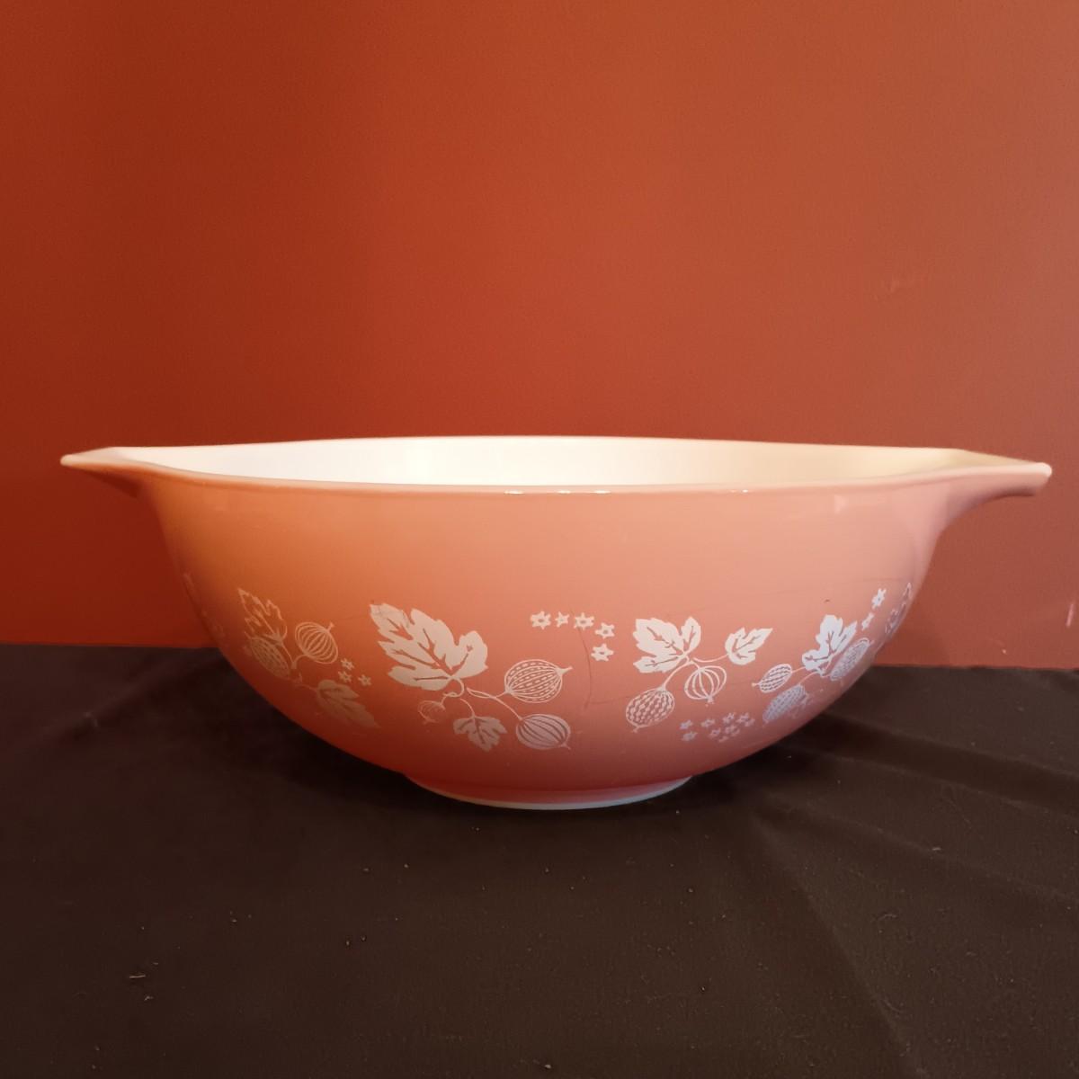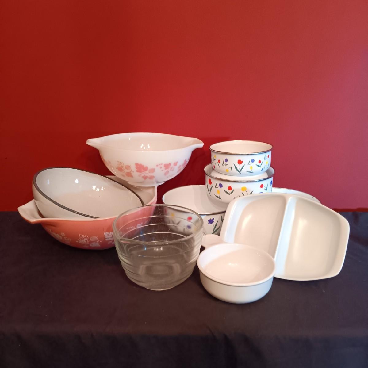 LOT 55D: Vintage 1960s Pyrex Pink Gooseberry Cinderella Bowls, Pyrex Beehive Glass Bowl, Enamelware Nesting Bowls & More