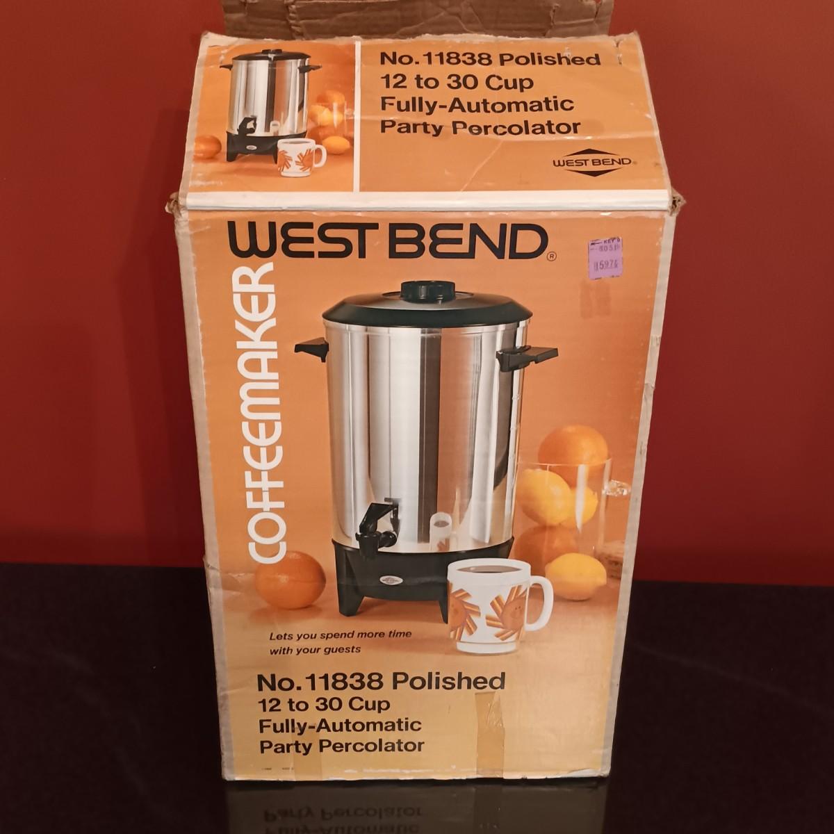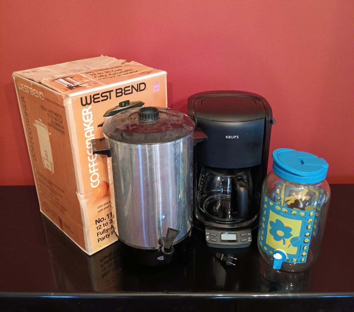 LOT 56D: West Bend Fully-Automatic Party Percolator, Krups Drip CoffeeMaker & Vintage Glass Dispenser