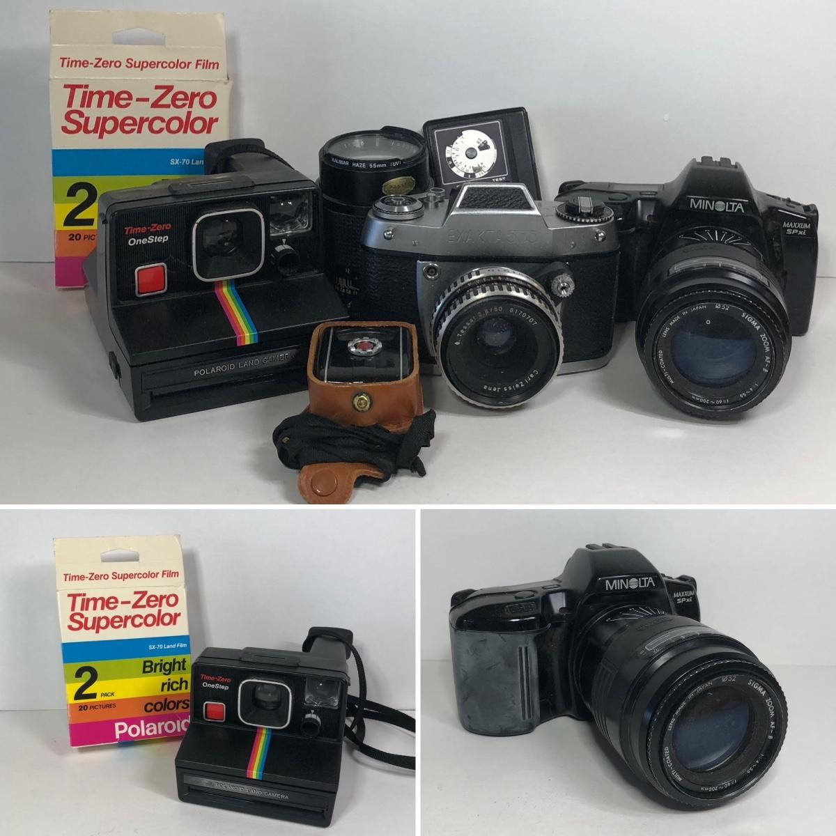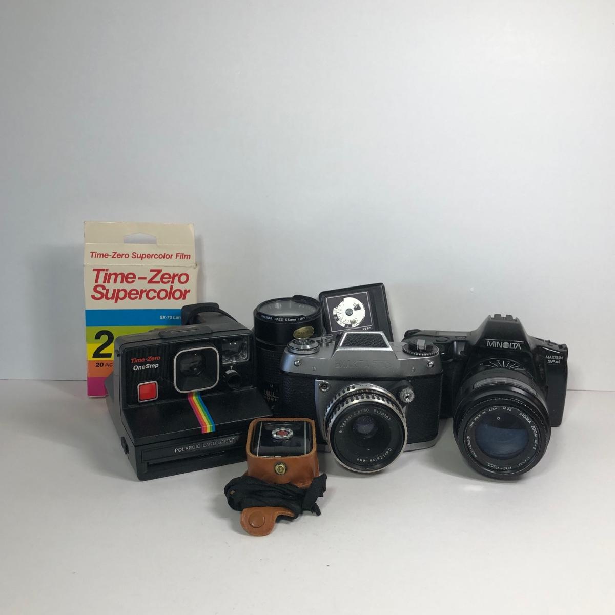 LOT 15M: Vintage Camera Collection - Polaroid Time-Zero OneStep w/ Film, Exakta 500 35mm Camera, Minolta Maxxum SPxi & More
